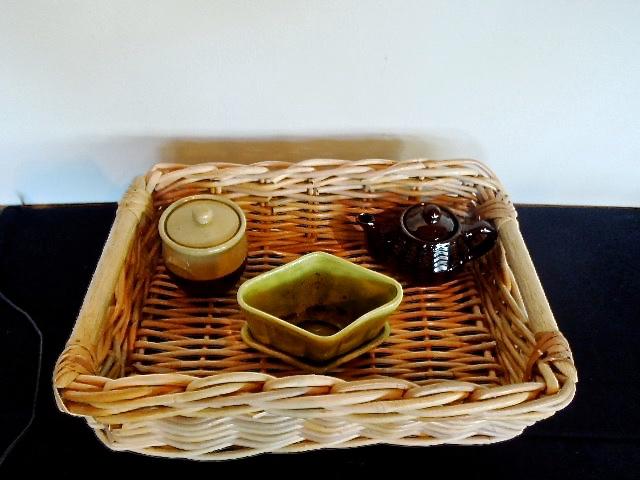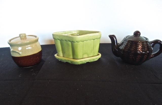 A vintage green ceramic planter, miniature brown teapot and bean crock. Recessed handled basket measures 11 x 15. No cracks or damage.