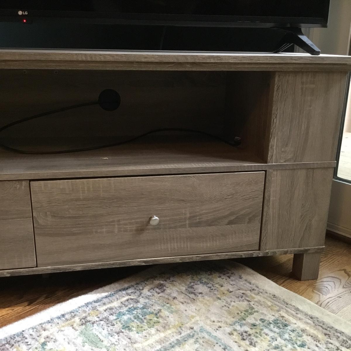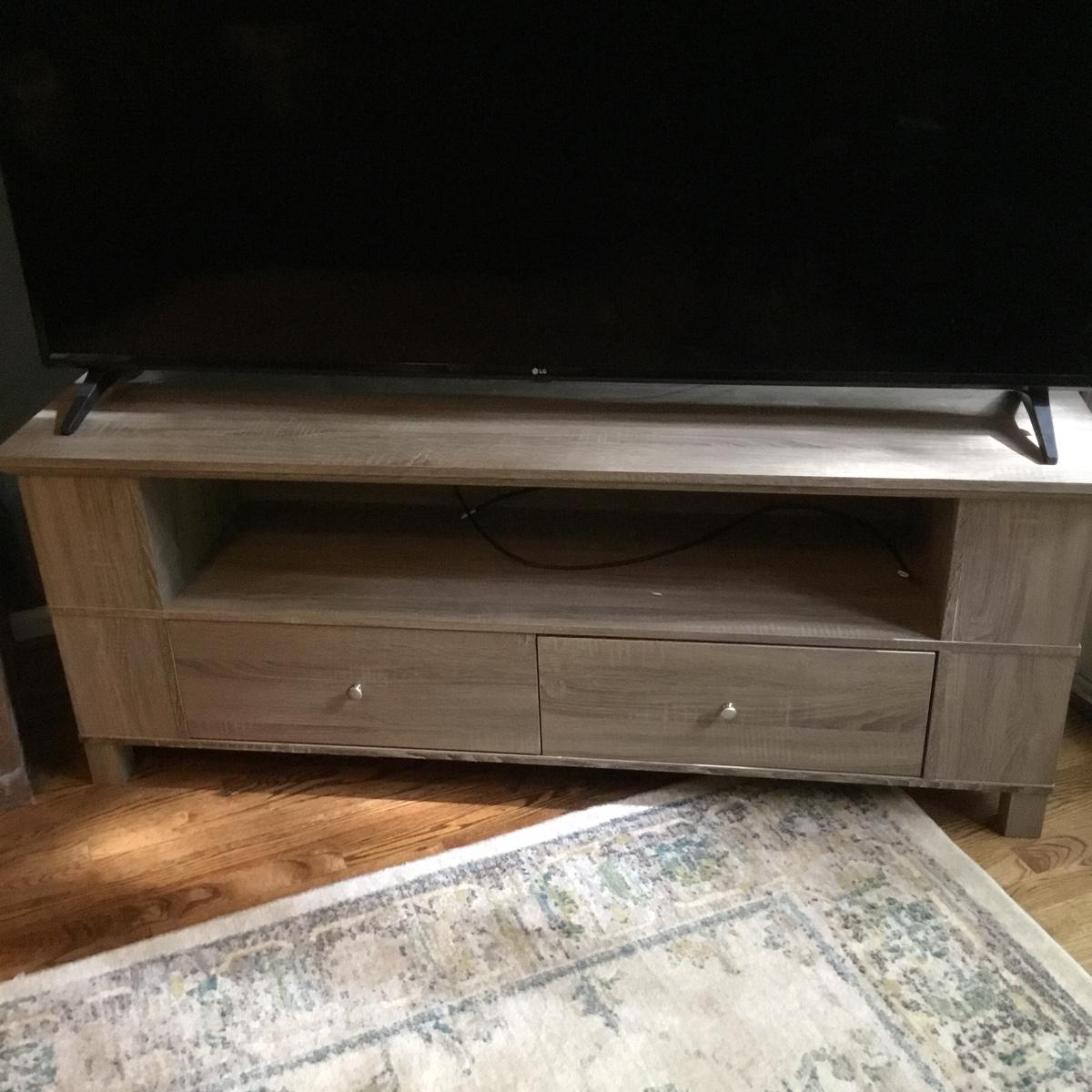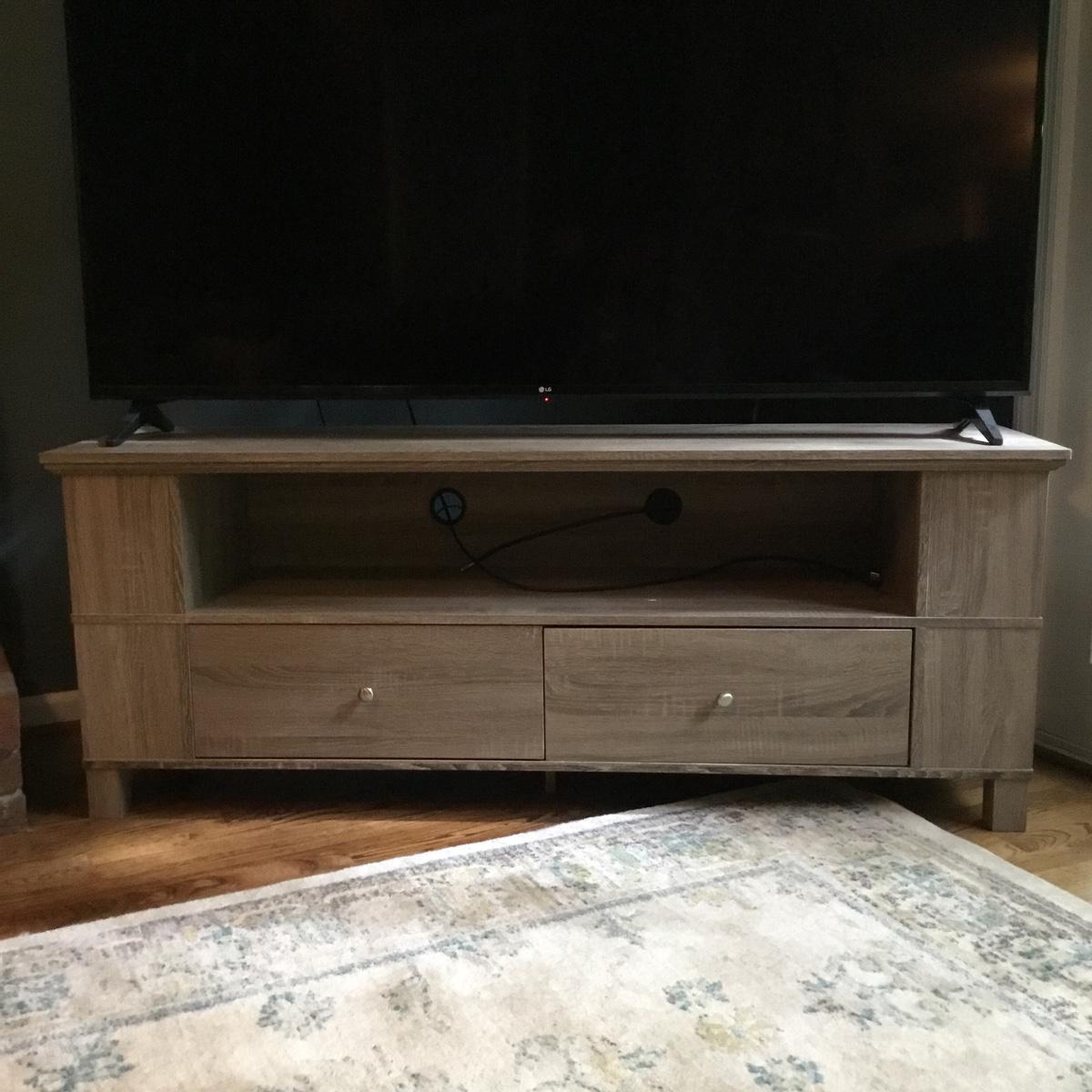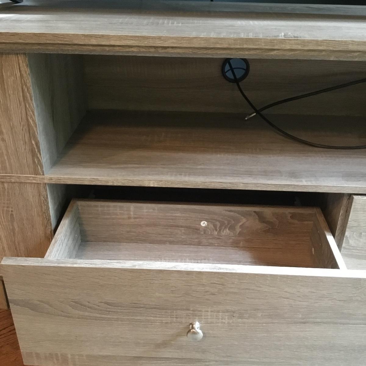 Measuring 59”x16”x23” this light brown TV stand will add function, storage, and design to your living room! Notice two storage drawers that pull out, an open shelf for a cable box and wire holes, as well as storage areas on either side of the unit. See photos. Pressed wood unit is sturdy and in good condition. The TV is not included. local pickup only.