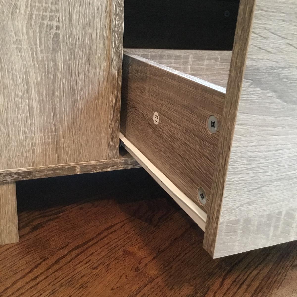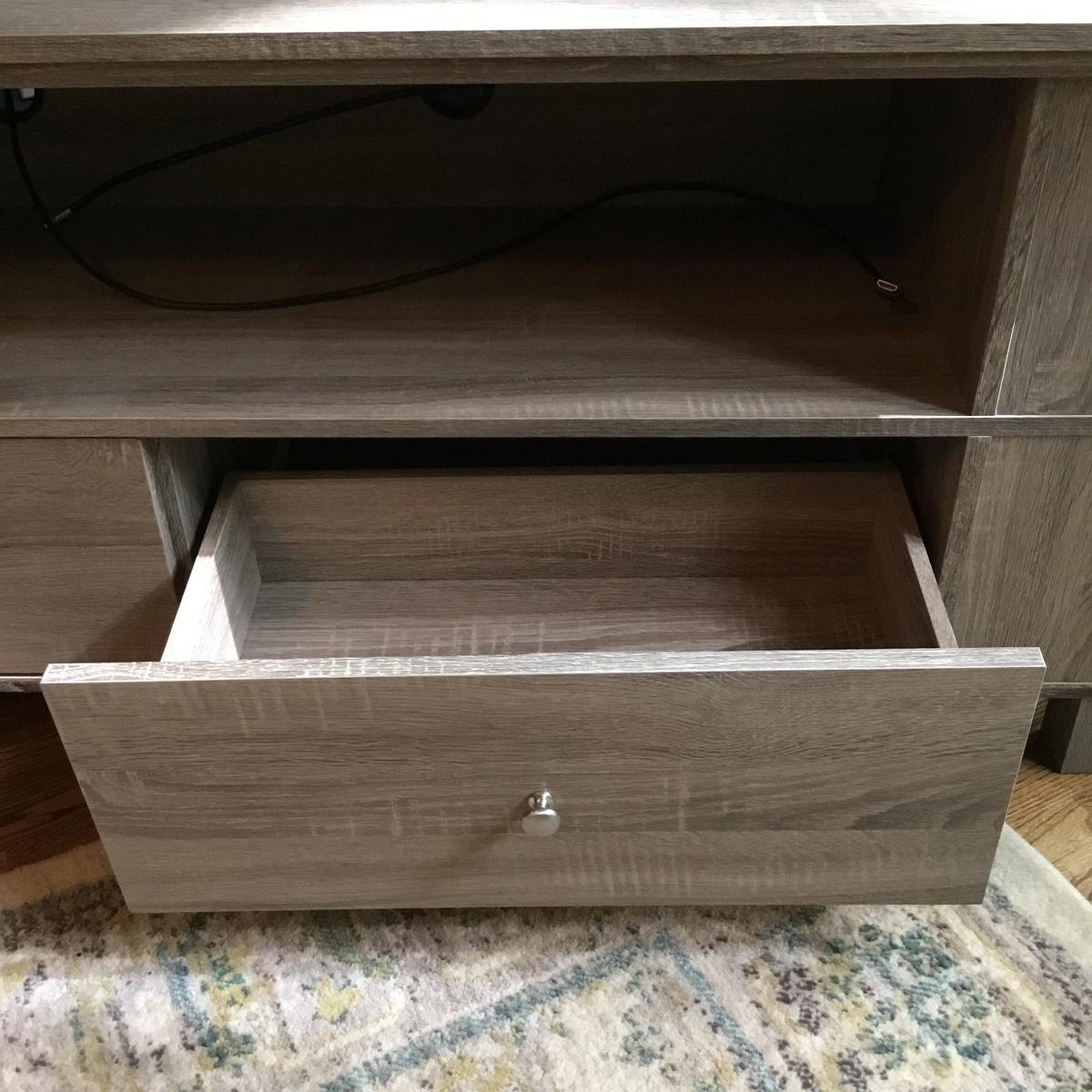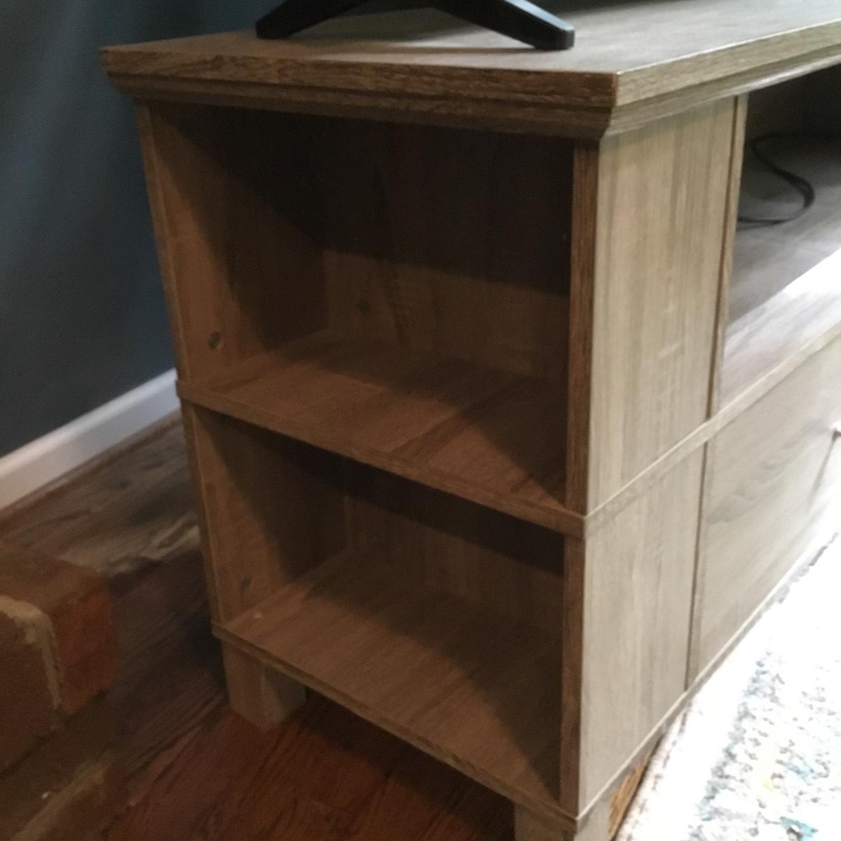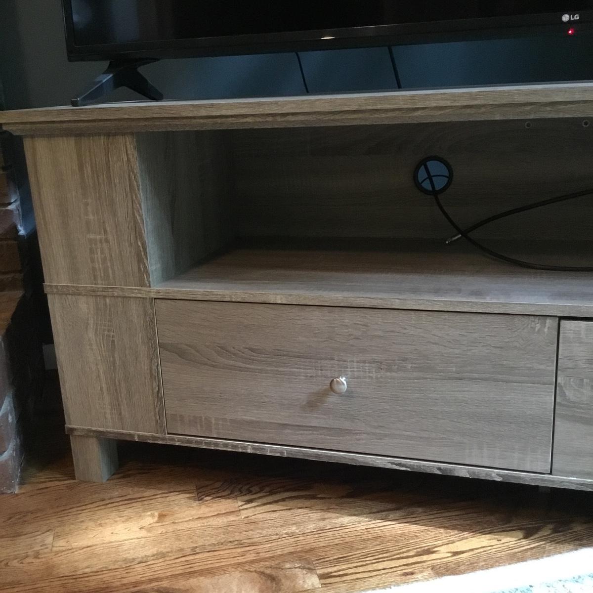 Measuring 59”x16”x23” this light brown TV stand will add function, storage, and design to your living room! Notice two storage drawers that pull out, an open shelf for a cable box and wire holes, as well as storage areas on either side of the unit. See photos. Pressed wood unit is sturdy and in good condition. The TV is not included. local pickup only.
