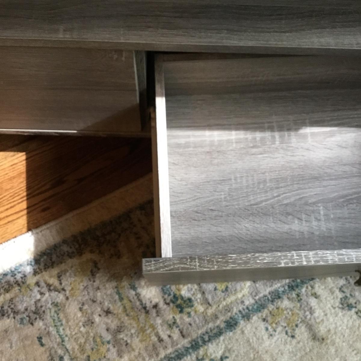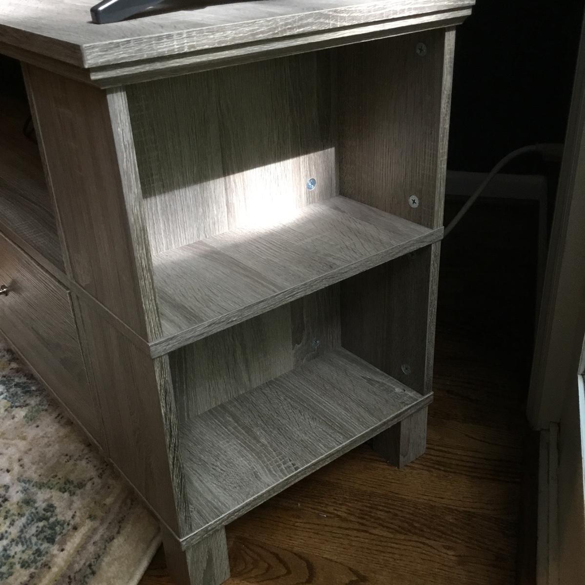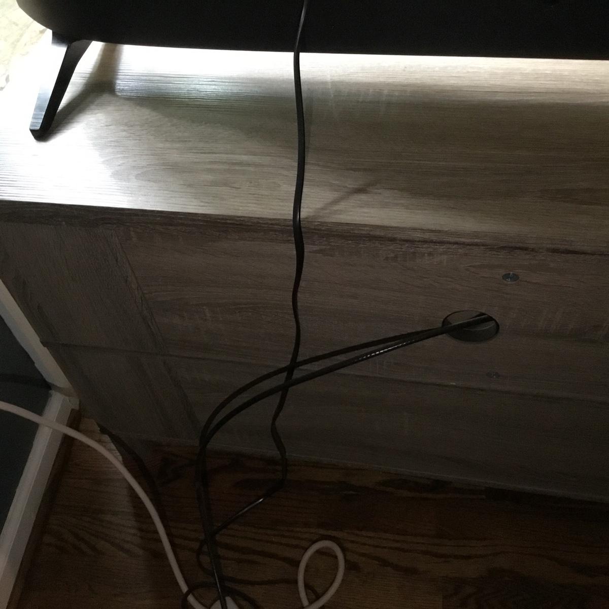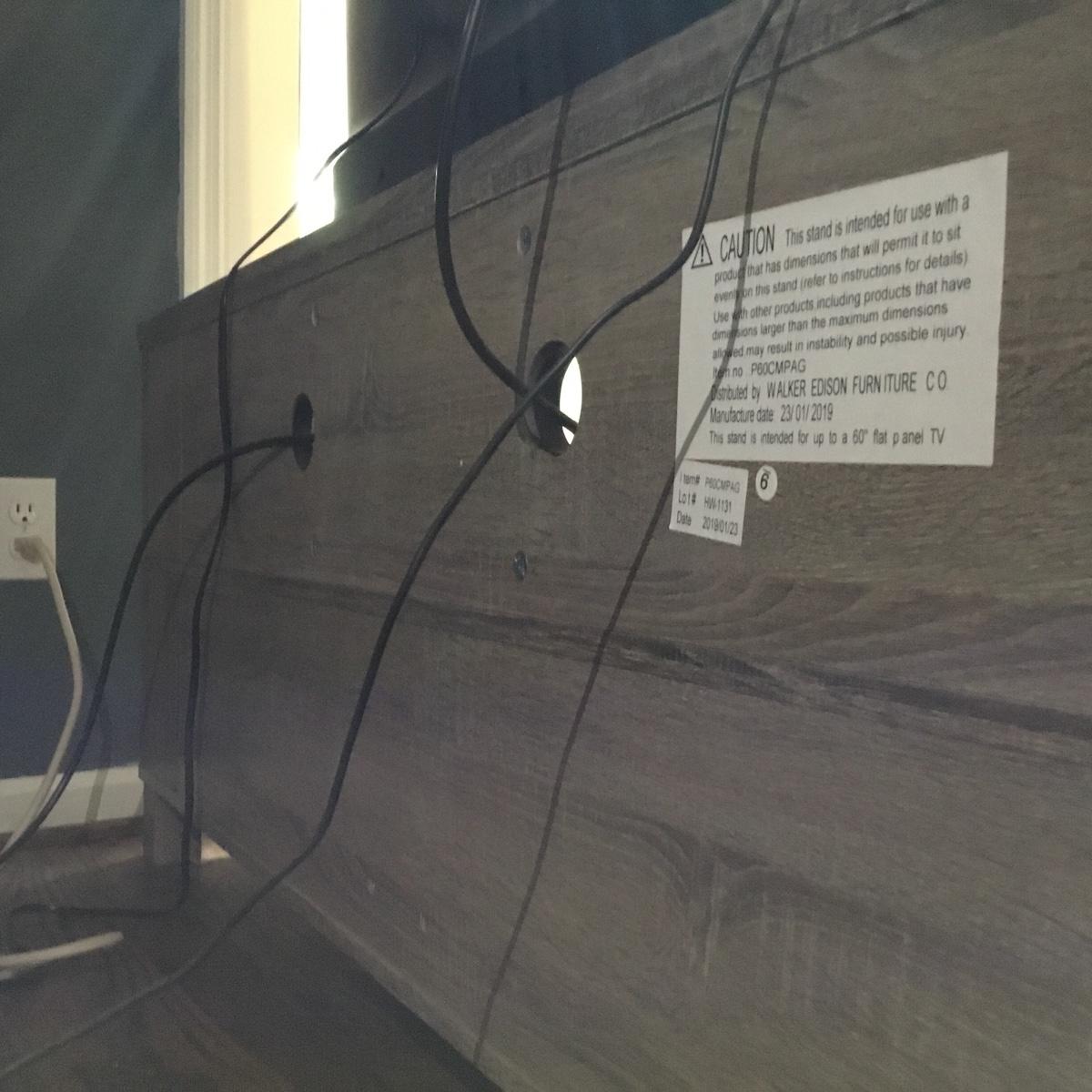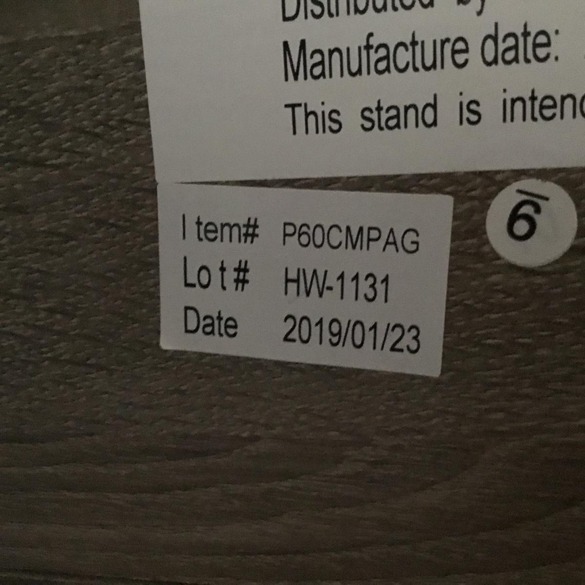 Measuring 59”x16”x23” this light brown TV stand will add function, storage, and design to your living room! Notice two storage drawers that pull out, an open shelf for a cable box and wire holes, as well as storage areas on either side of the unit. See photos. Pressed wood unit is sturdy and in good condition. The TV is not included. local pickup only.