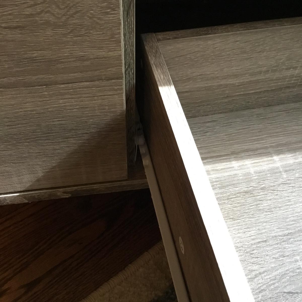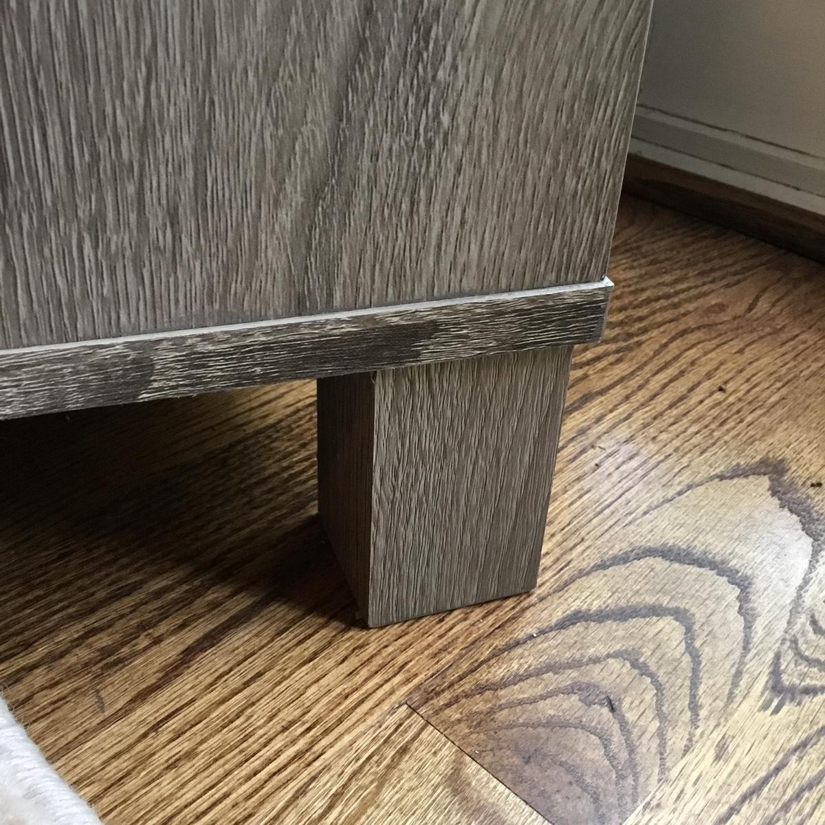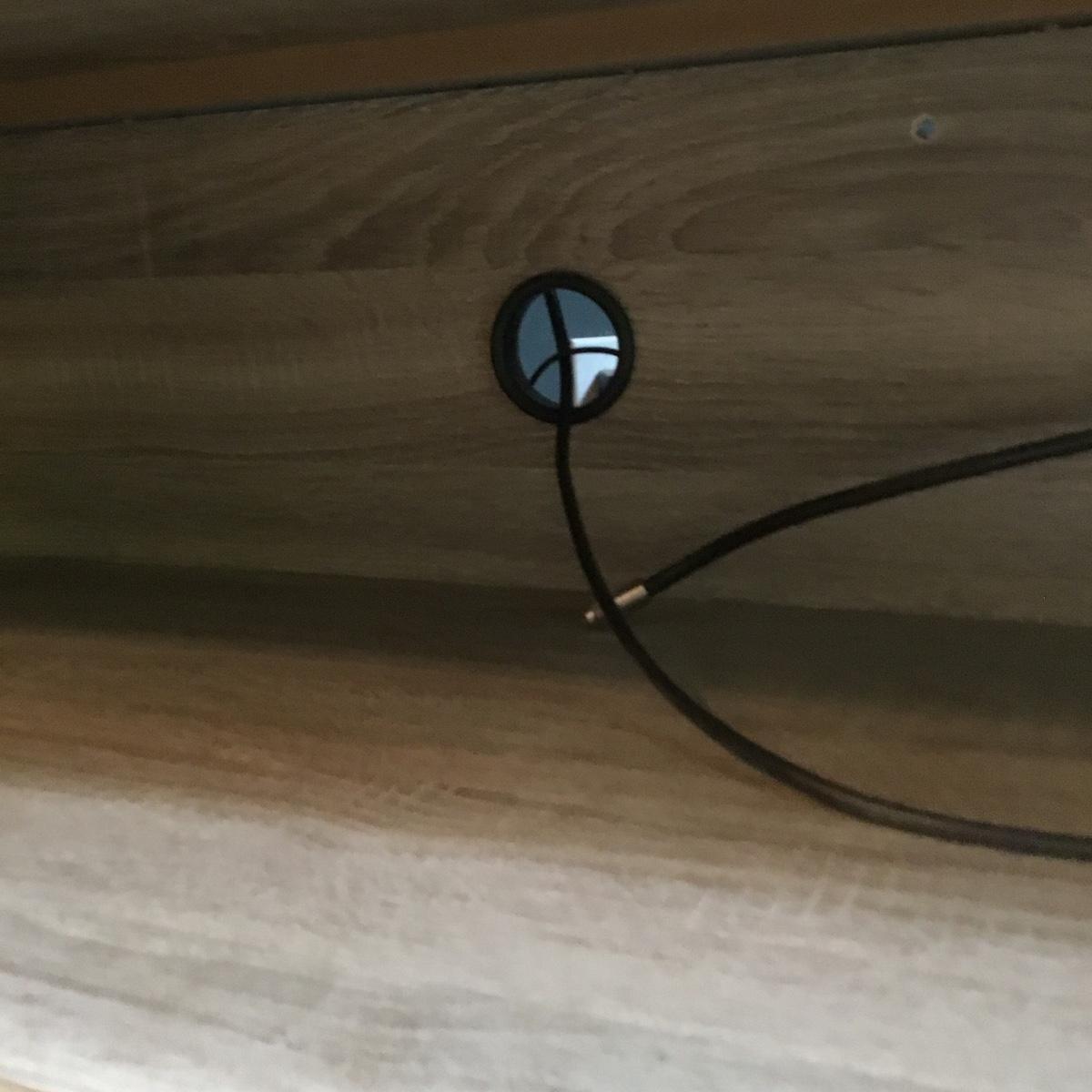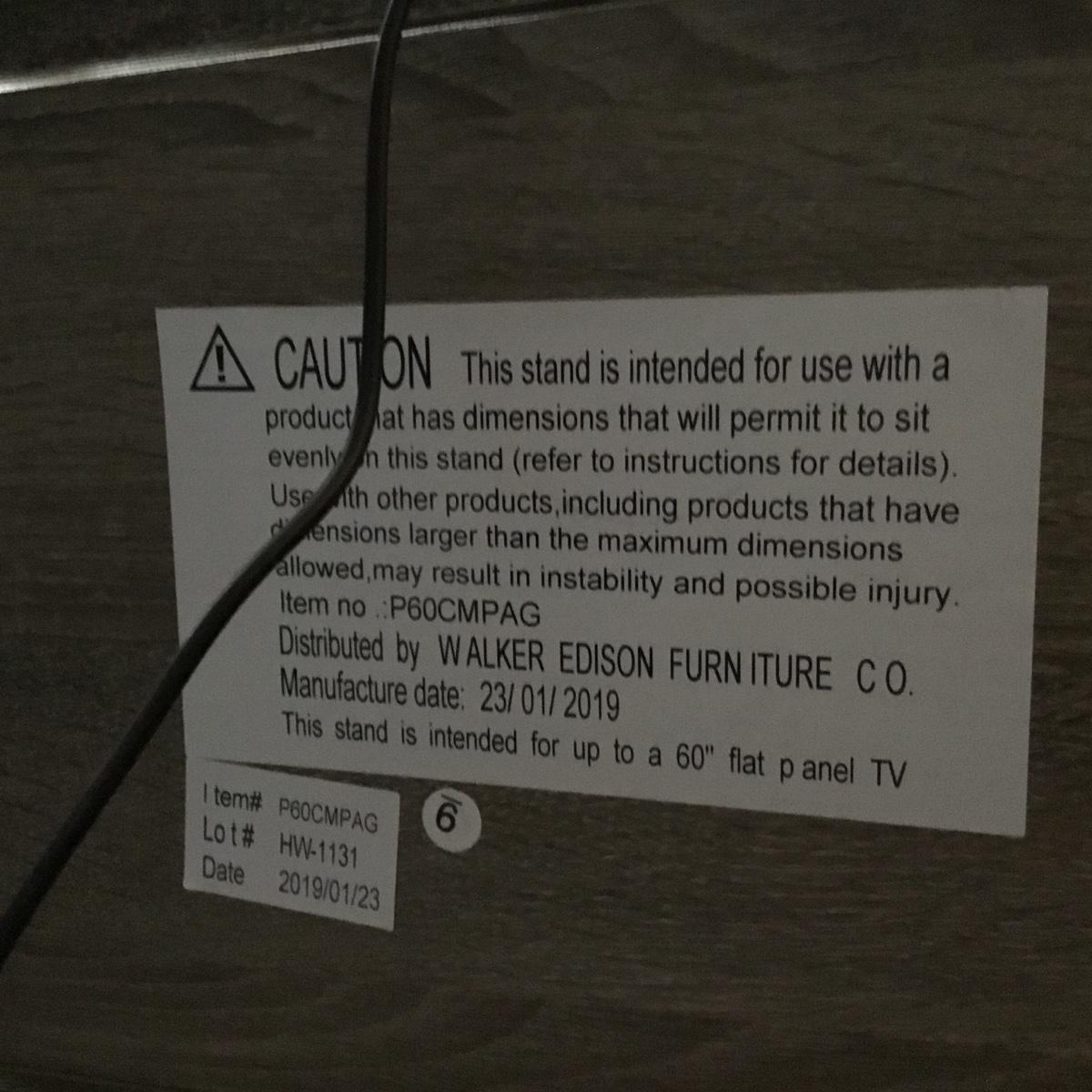 Measuring 59”x16”x23” this light brown TV stand will add function, storage, and design to your living room! Notice two storage drawers that pull out, an open shelf for a cable box and wire holes, as well as storage areas on either side of the unit. See photos. Pressed wood unit is sturdy and in good condition. The TV is not included. local pickup only.