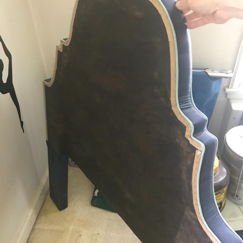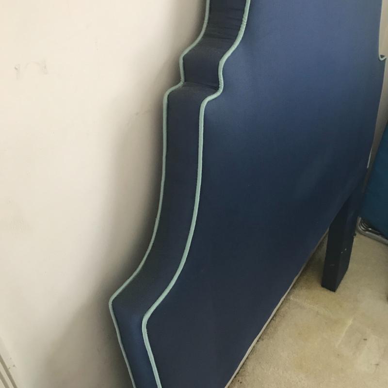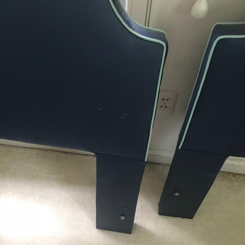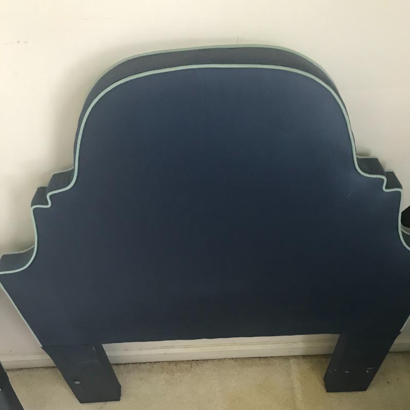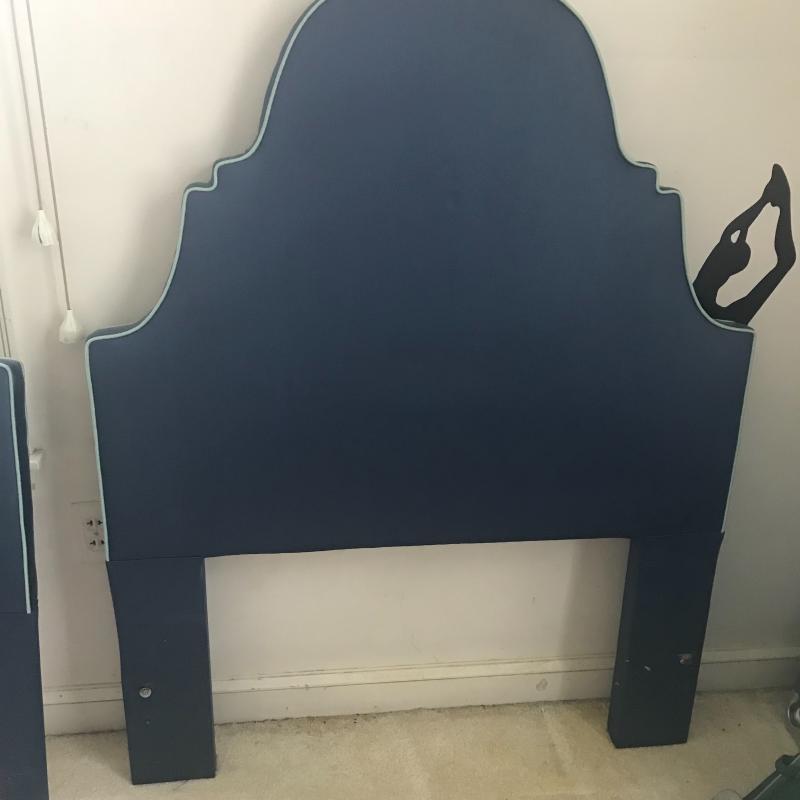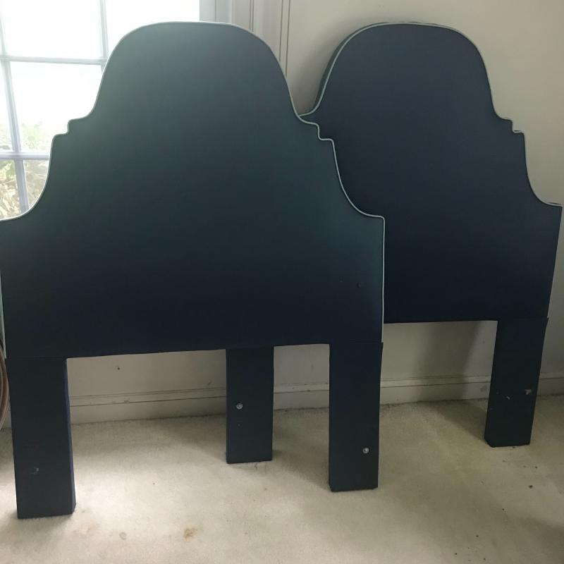 Upholstered twin headboards in a royal blue satin and pale blue piping. Easy bolt connection to metal bed frame. One small tear on lower right of one. Otherwise in good shape. Each measures 39.5” x 50.5” x 2.5”. Lot is available for local pick up only.