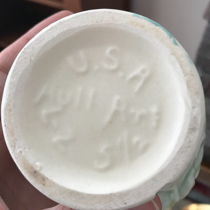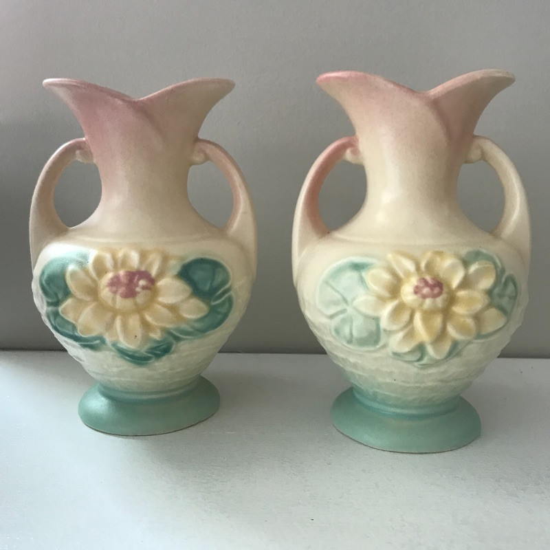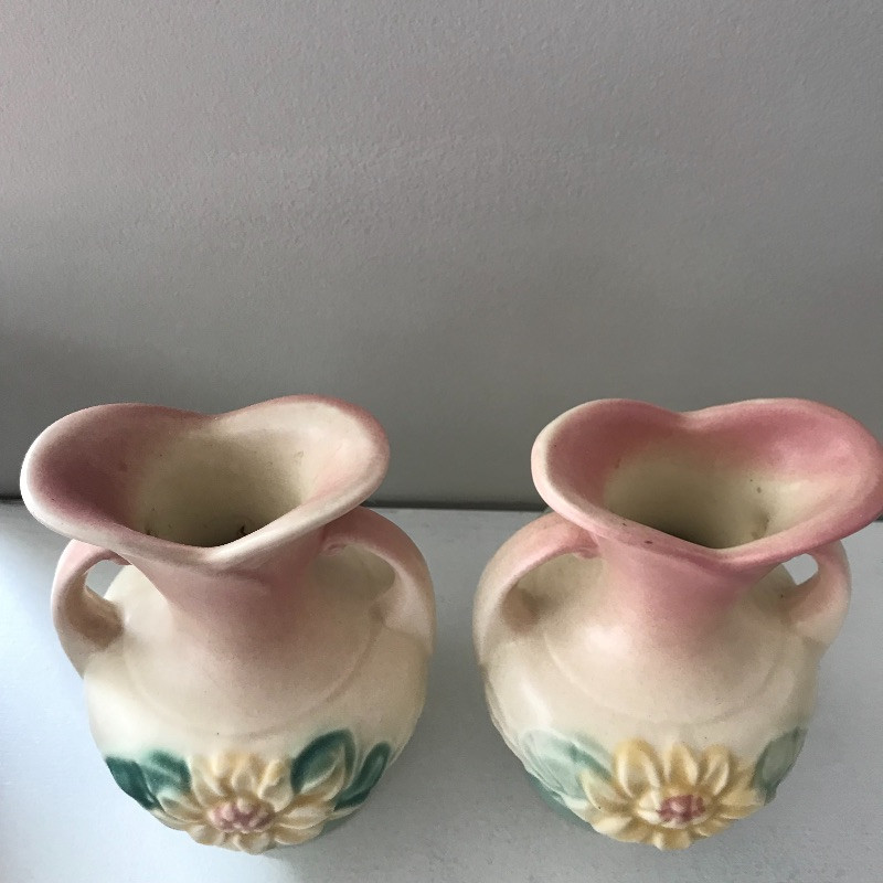 Two stunning floral and pastel 5.5” vases by Hull. Both vases depict Dahlia type floral designs on each side. One of the vases has a chip on one side, see the second image. Shipping available.