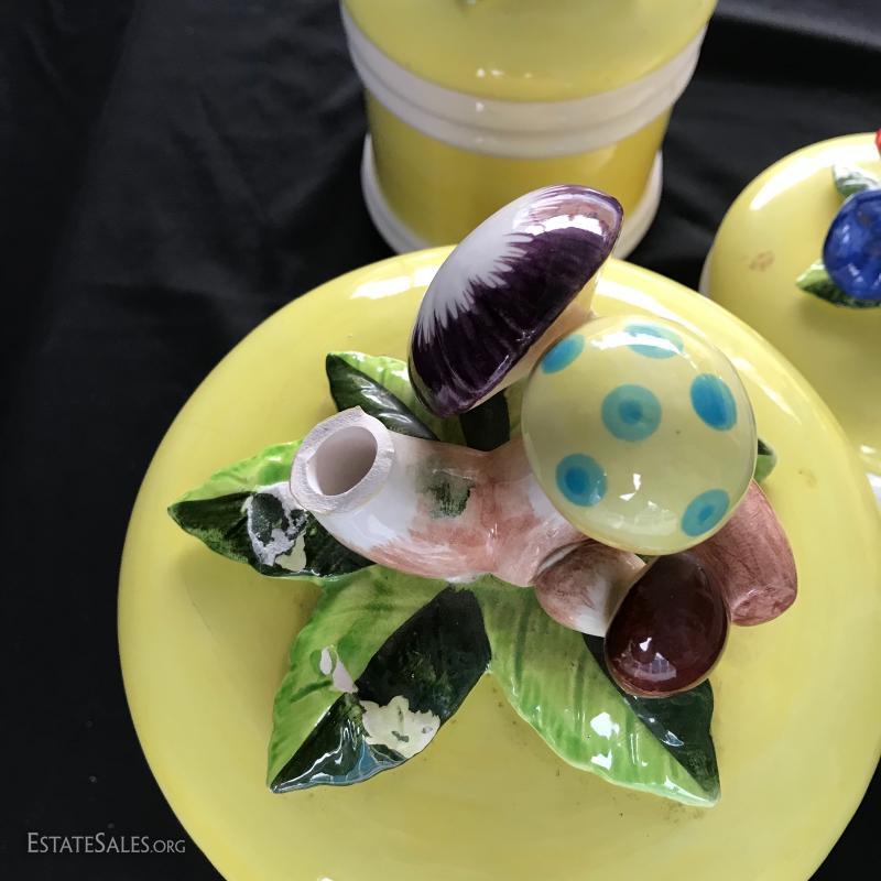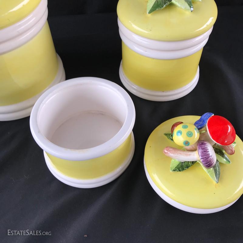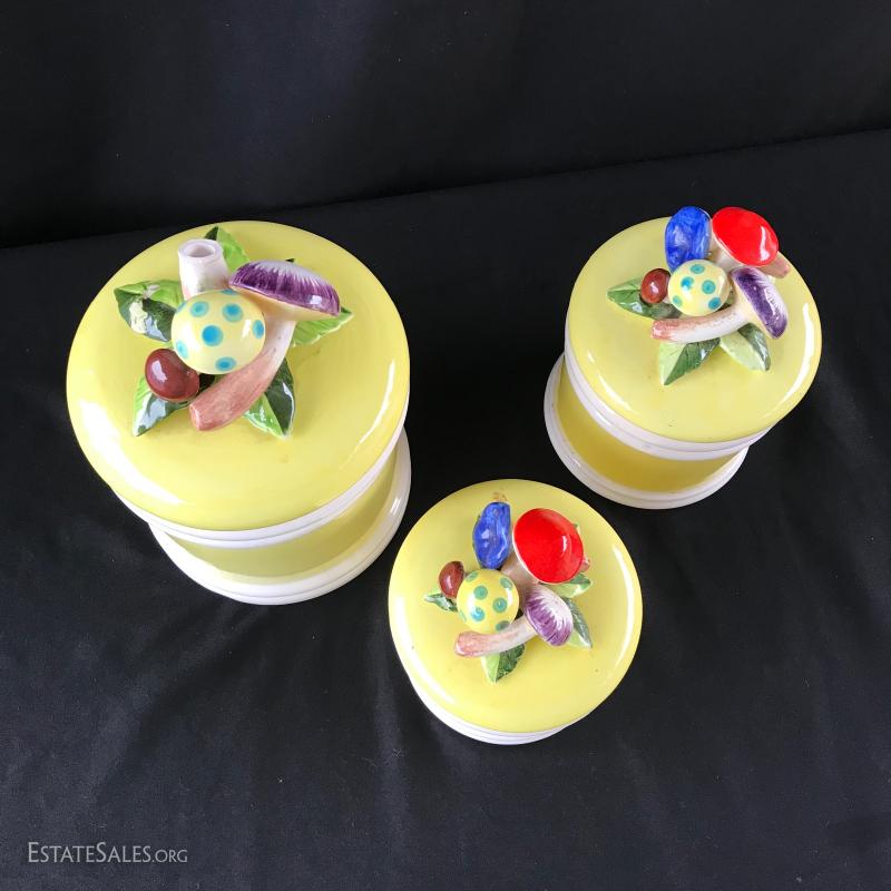 3 cheerful yellow with mushroom tops canisters. Largest one (9”tall) has a broken off mushroom top, but otherwise in great shape. This lot is available for shipping or local pick up in a Asheville, NC.