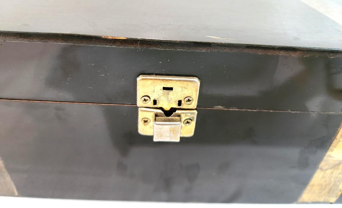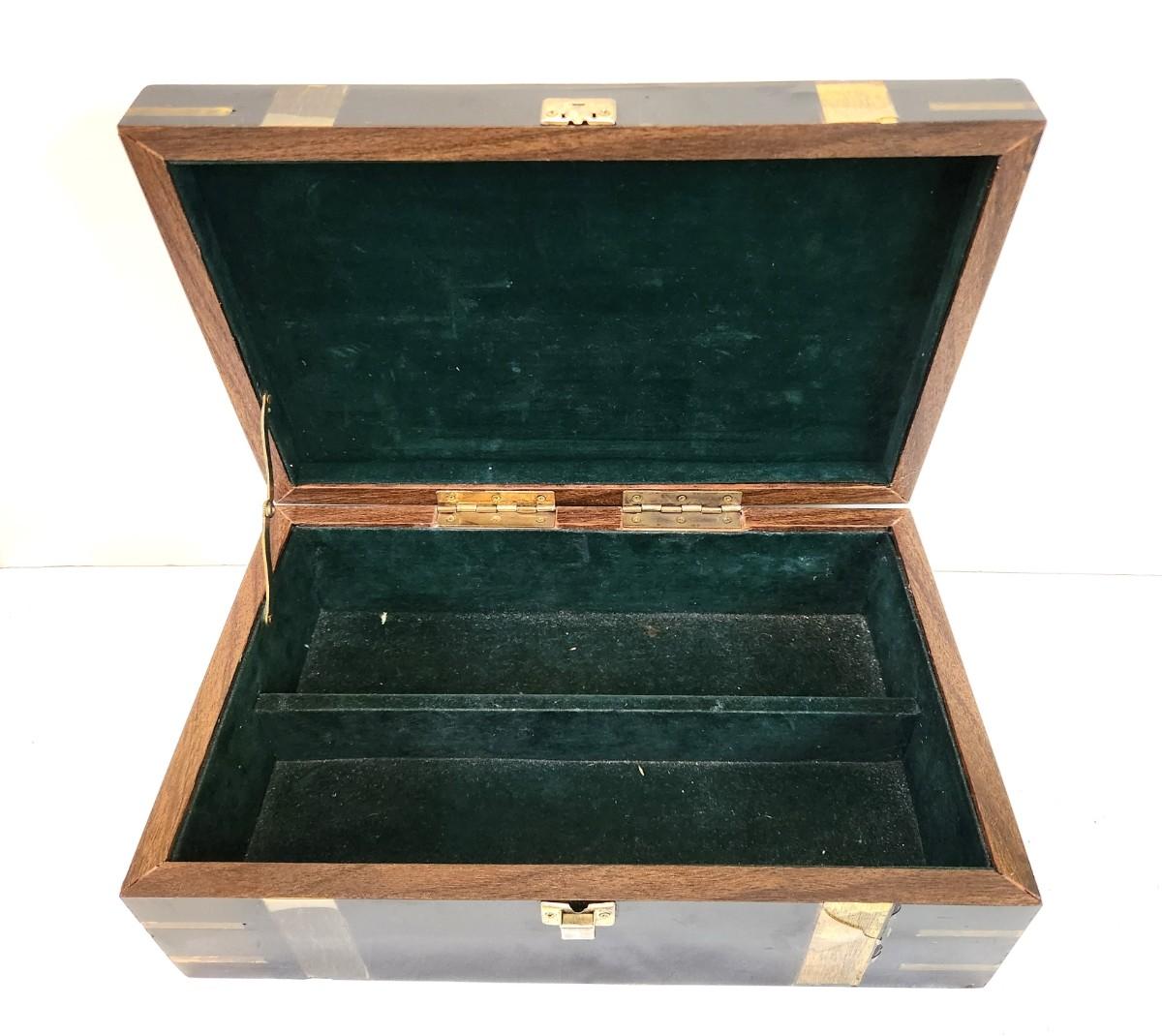 Nice vintage English desk box - faux "brass" accents, overall good vintage condition, 13" across, 8" deep, 4.25" tall. Catch works fine.