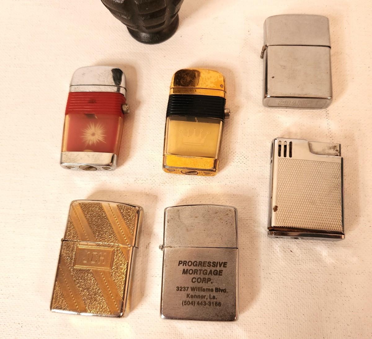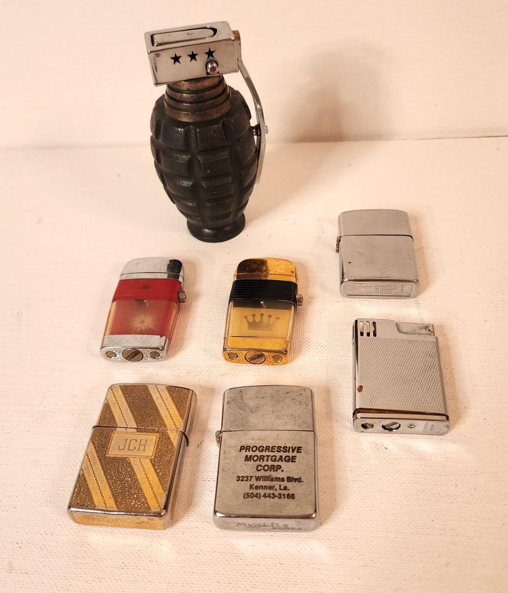 You get all you see here - 7 vintage lighters - they will need lighter fluid, etc. 1 initialed Zippo, 1 "grenade" lighter, 1 advertising lighter (MyLite - Korea), 3 vintage Septo lighters, 1 red plastic.