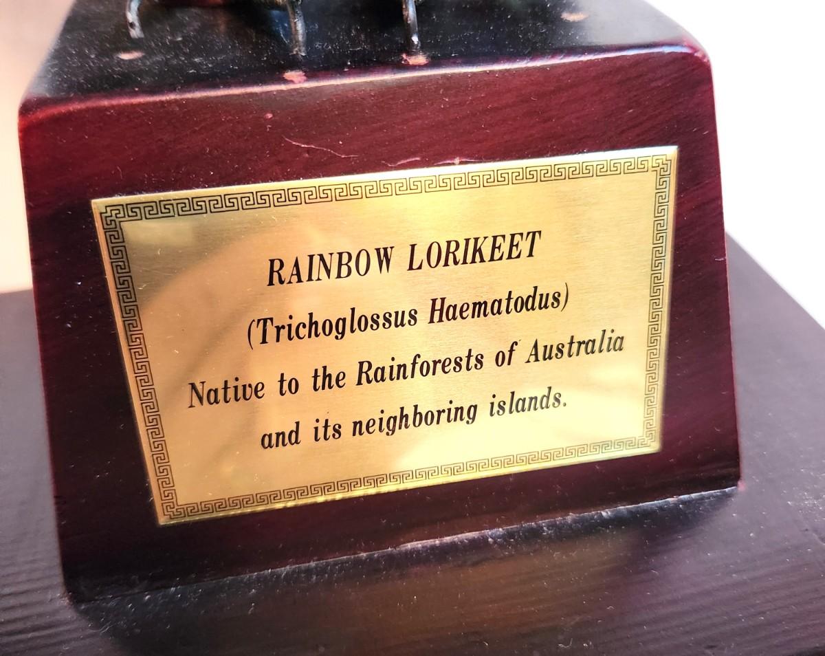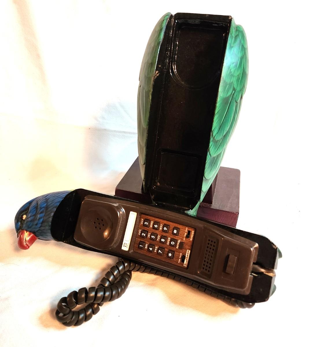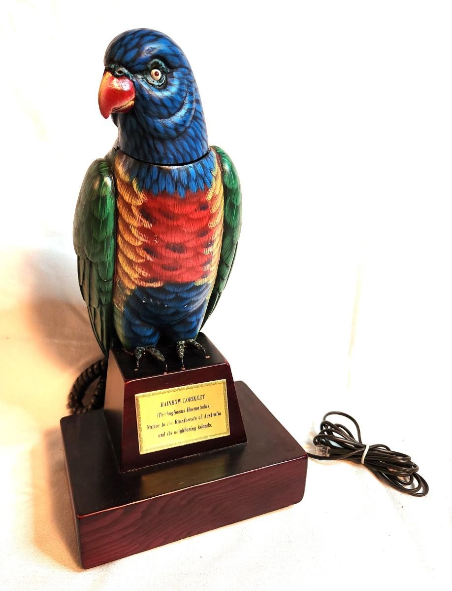 Fun vintage pushbutton telephone - Rainbow Lorikeet bird (native to Australia) on base with plaque. Good condition - 1980's by the Telemania Company. 14" tall. We have no idea if this works or not, but it looks good.