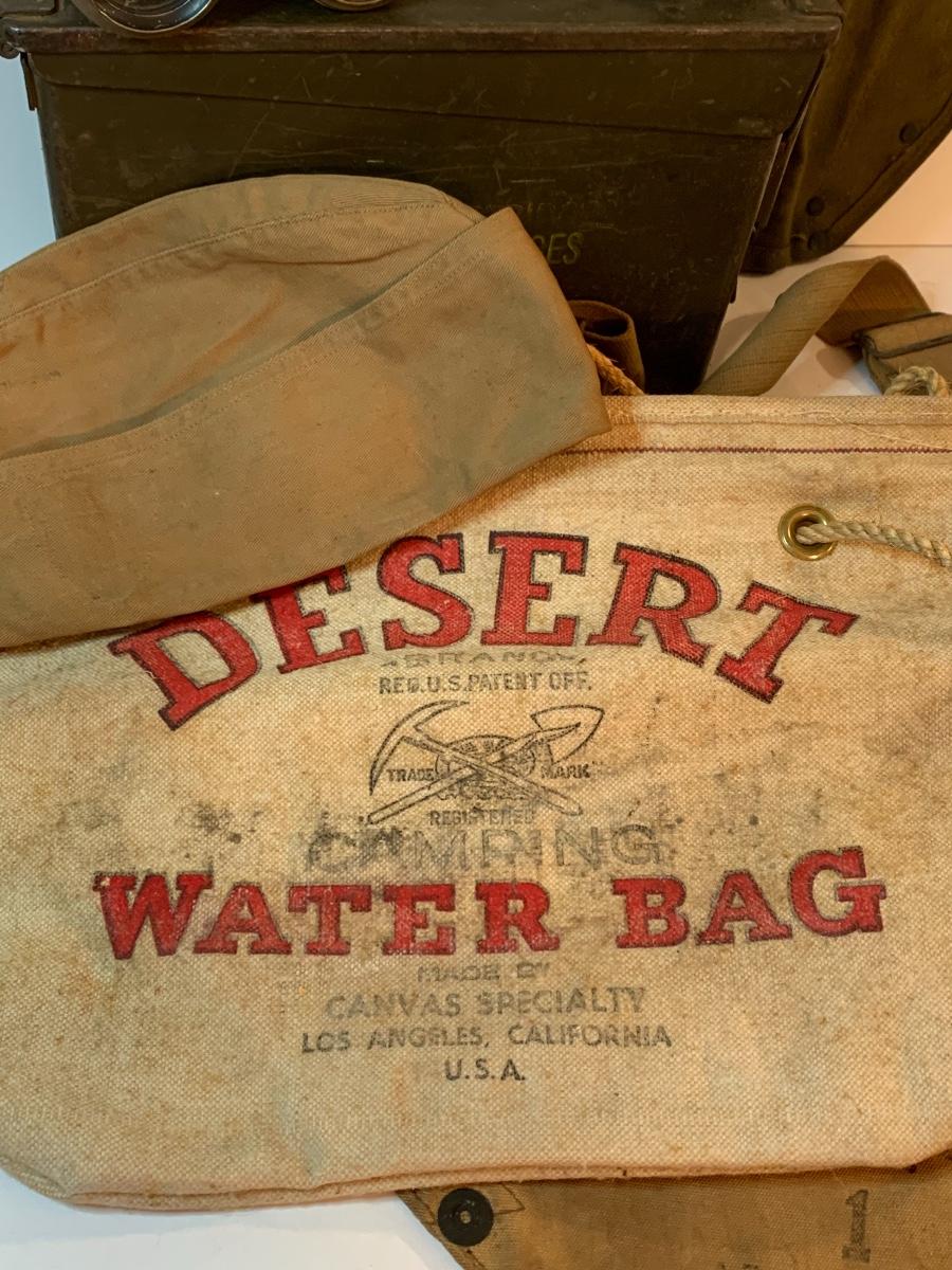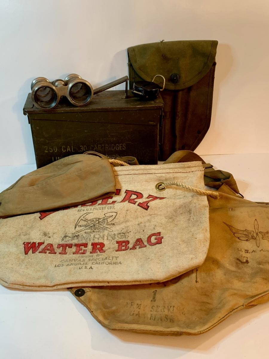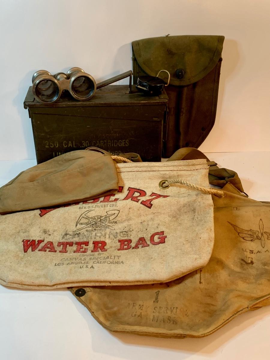 Great lot of Militaria including a dessert water bag, gas mask bag, ammunition box, compass, binoculars. and more