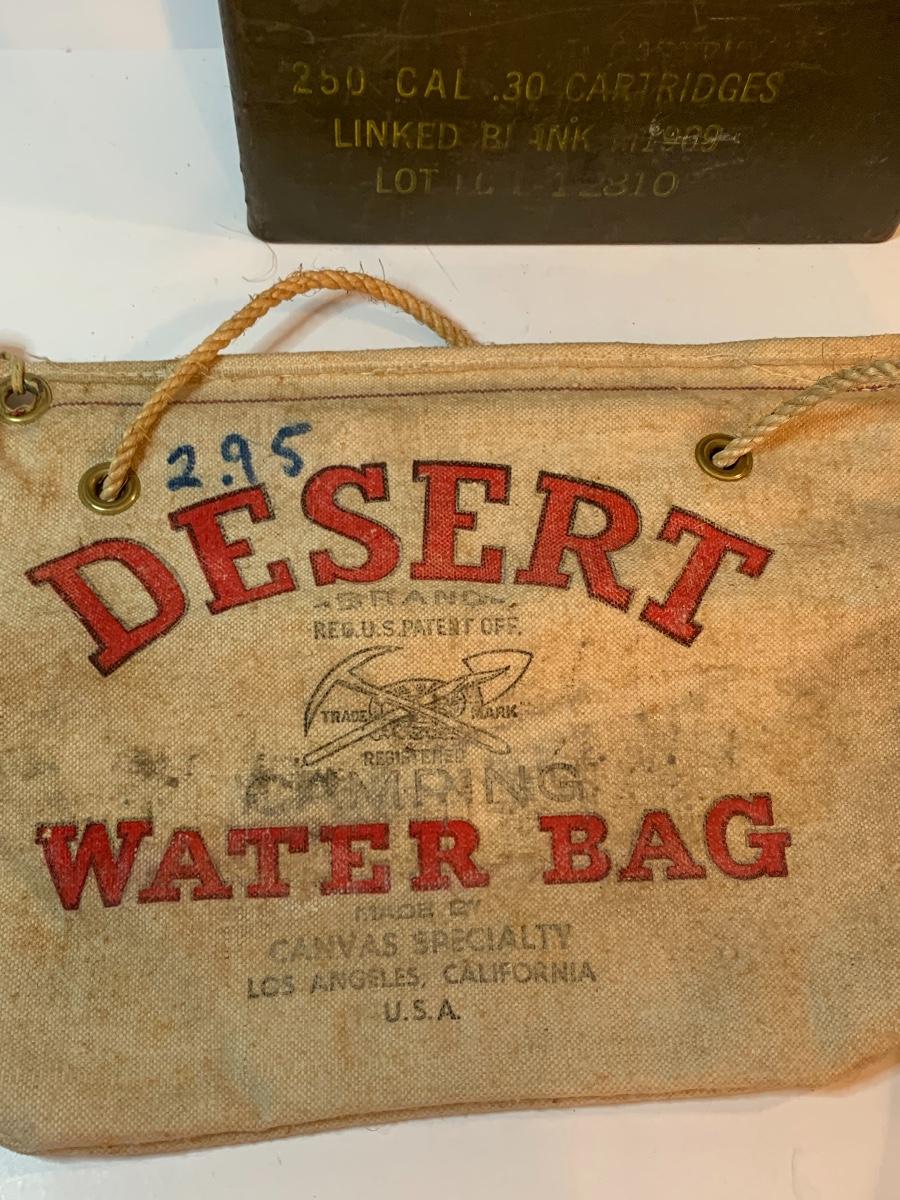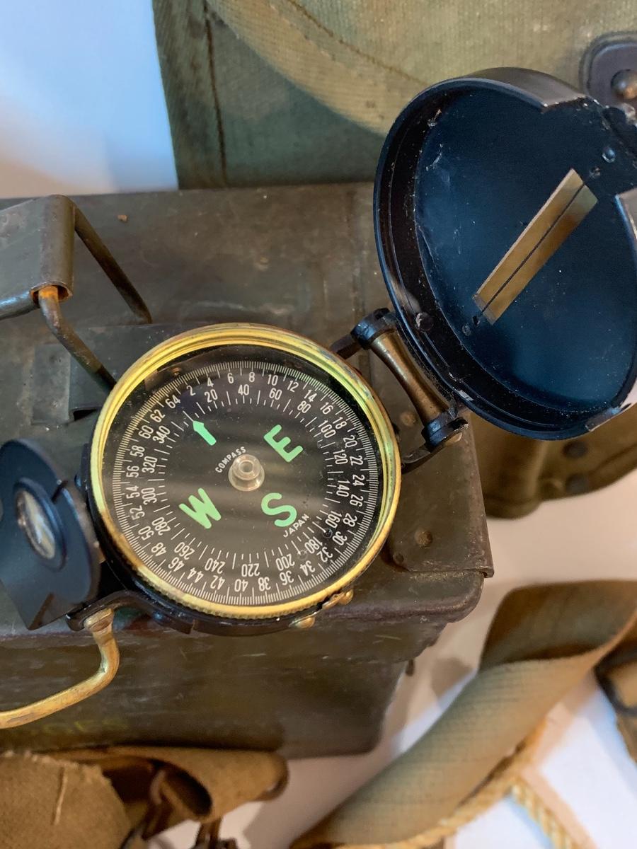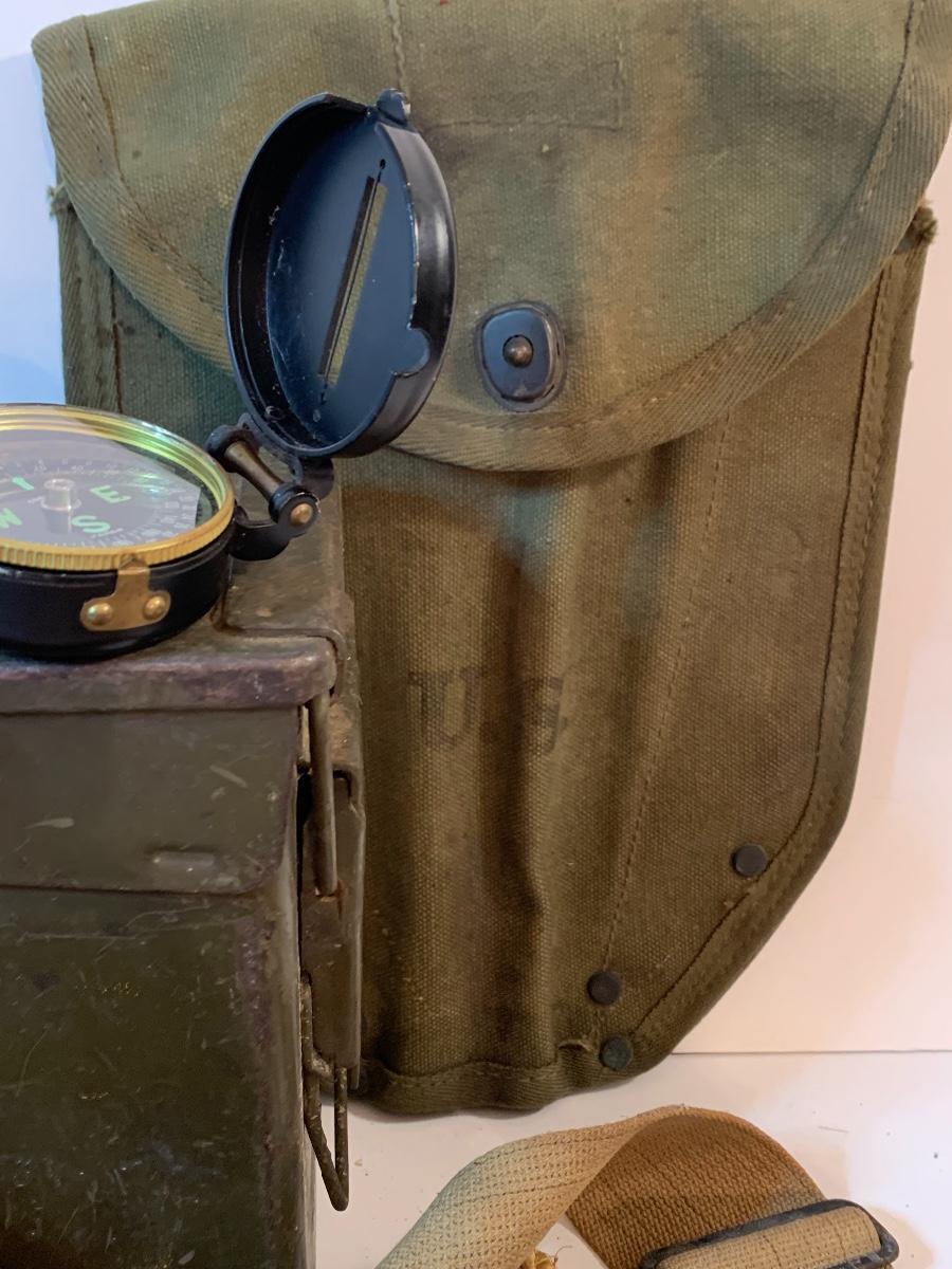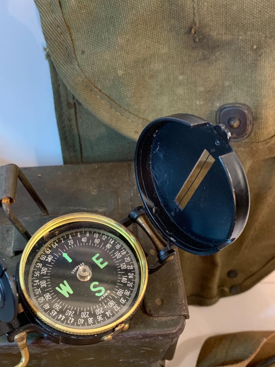 Great lot of Militaria including a dessert water bag, gas mask bag, ammunition box, compass, binoculars. and more
