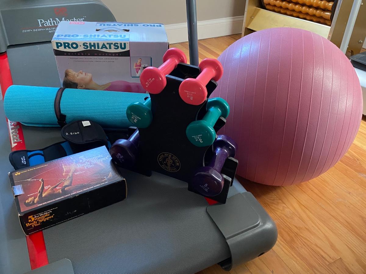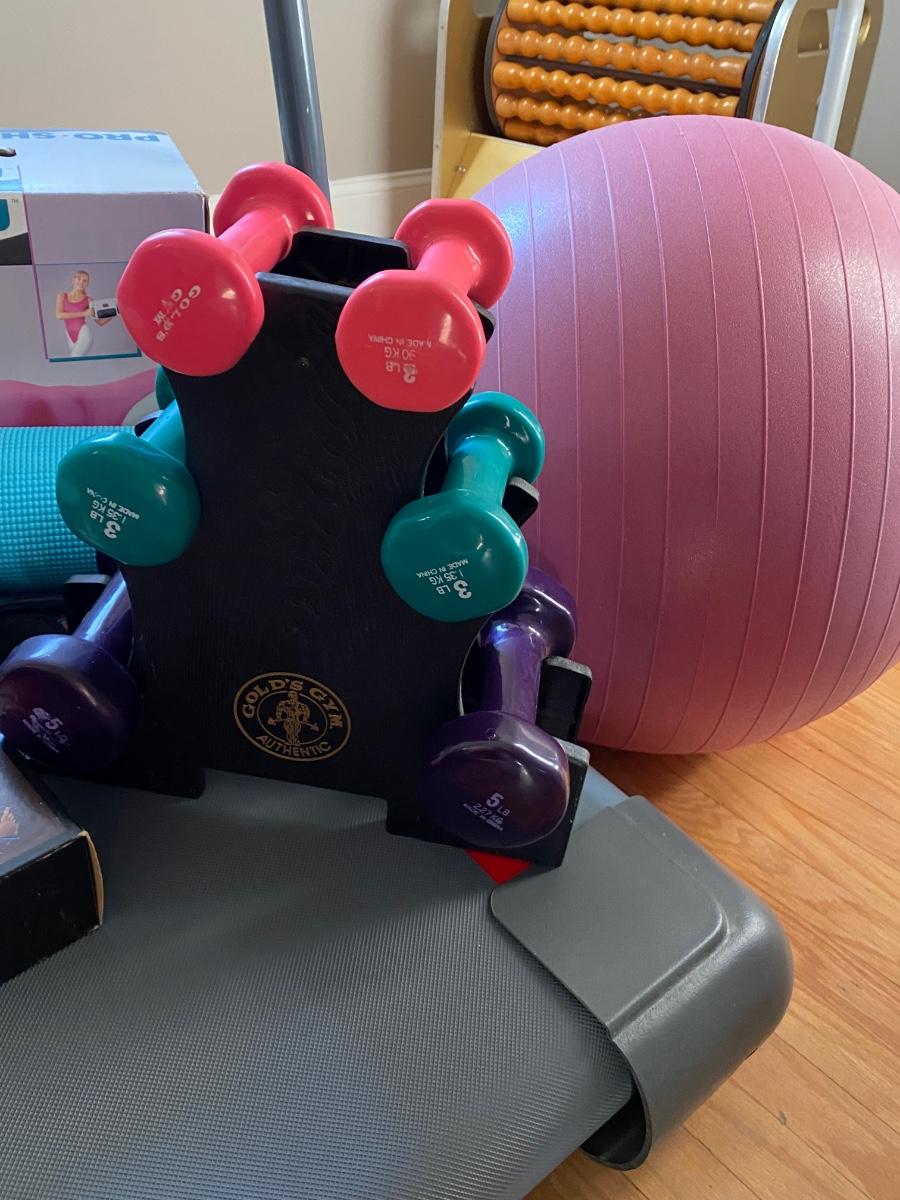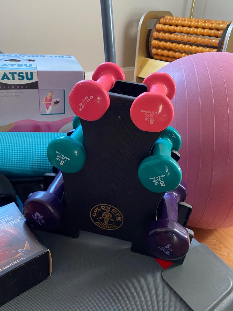 Three sets of dumbbells, yoga mat, exercise ball and more.