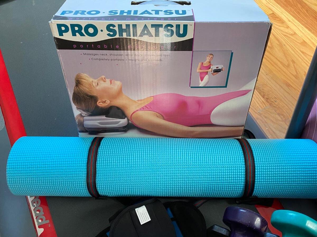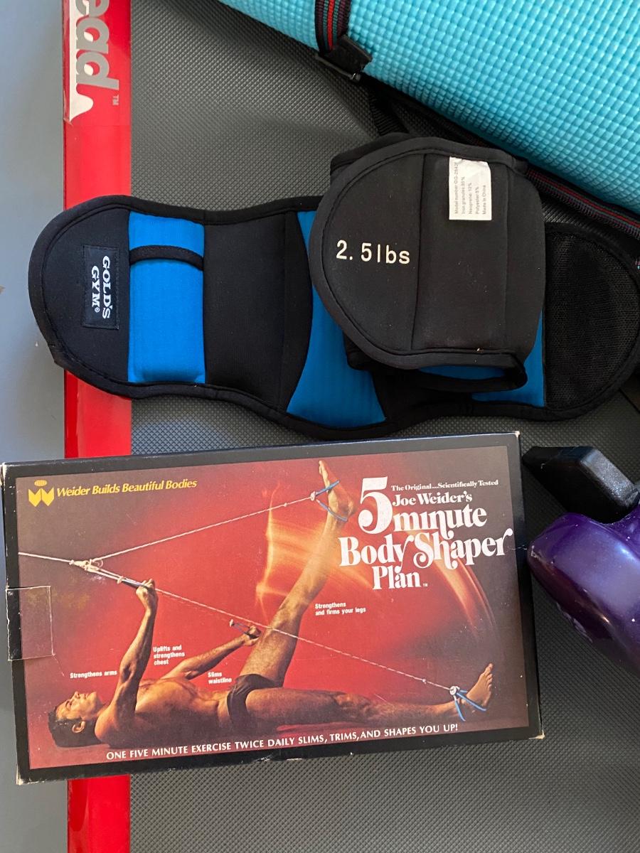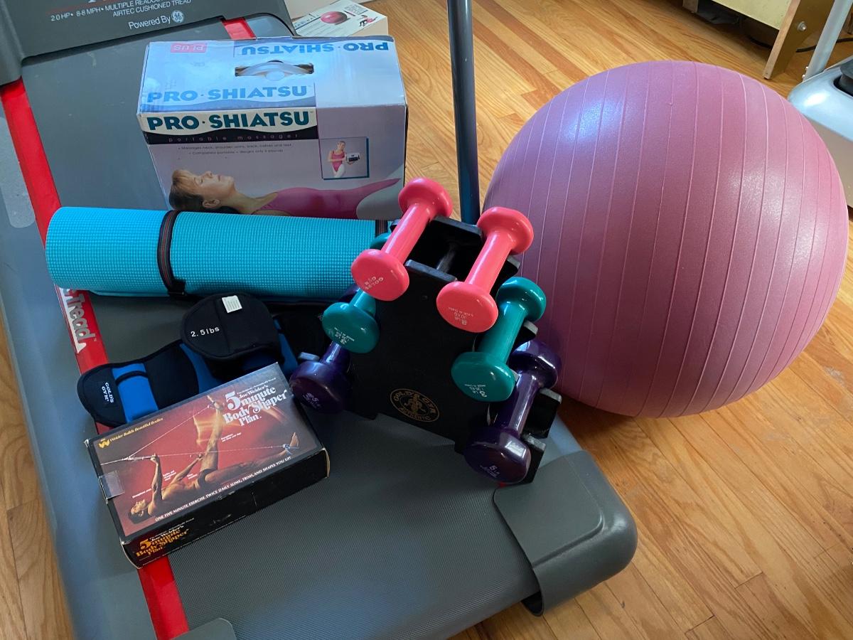 Three sets of dumbbells, yoga mat, exercise ball and more.