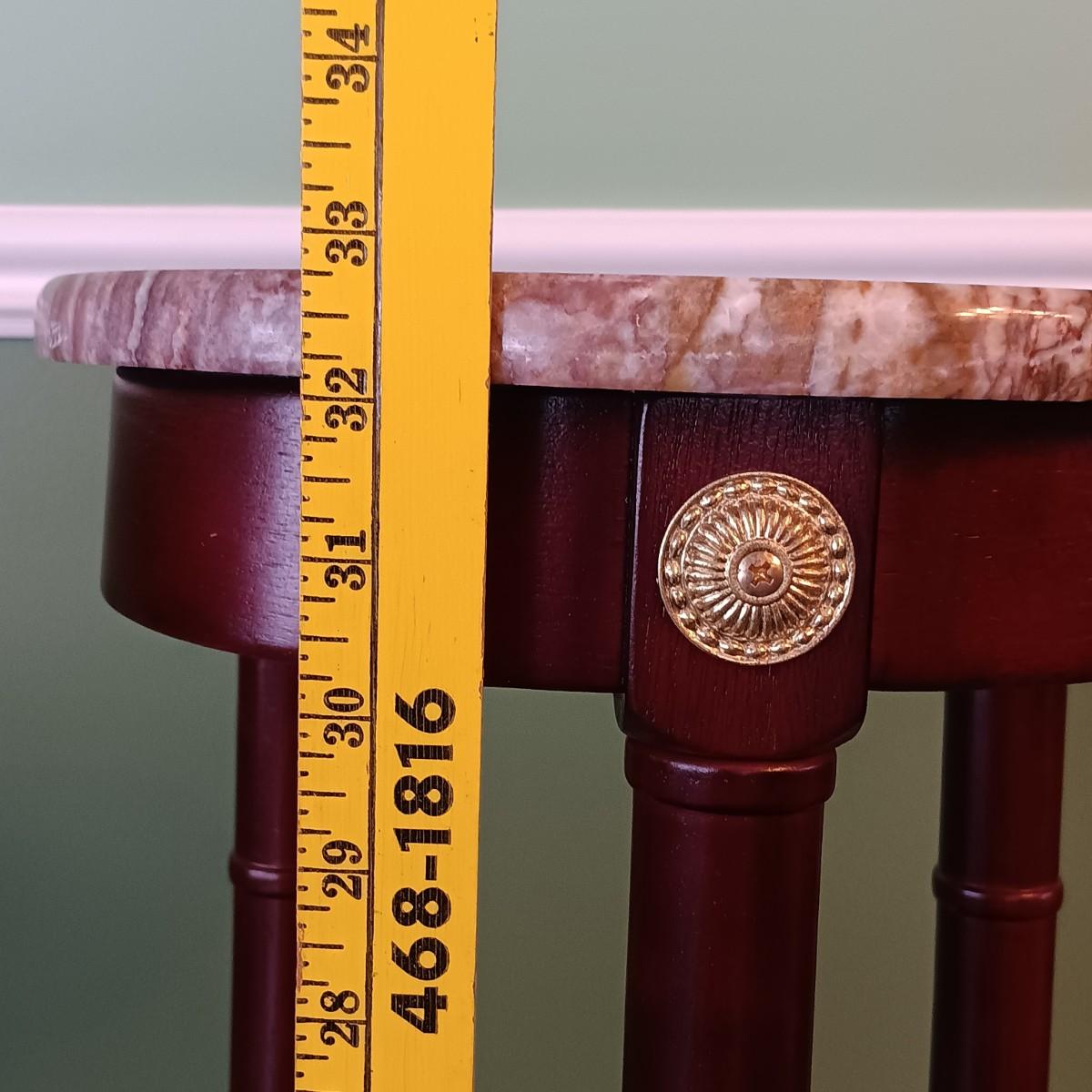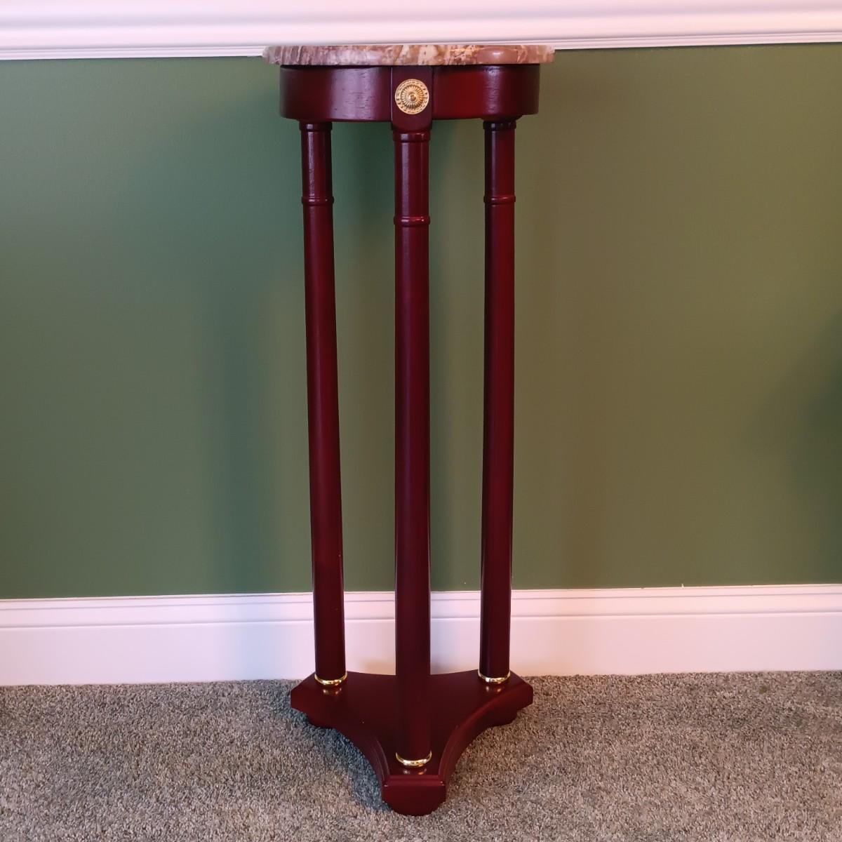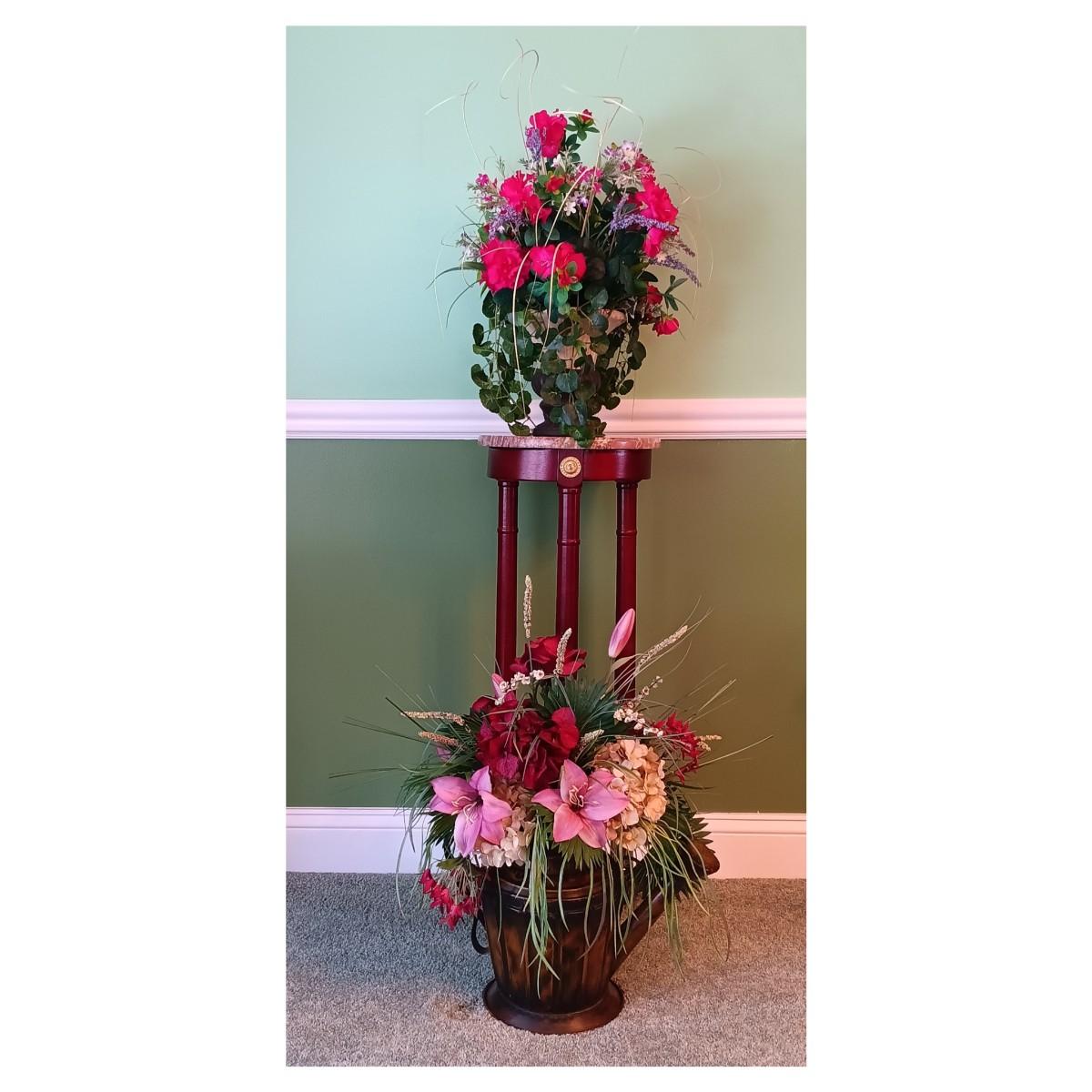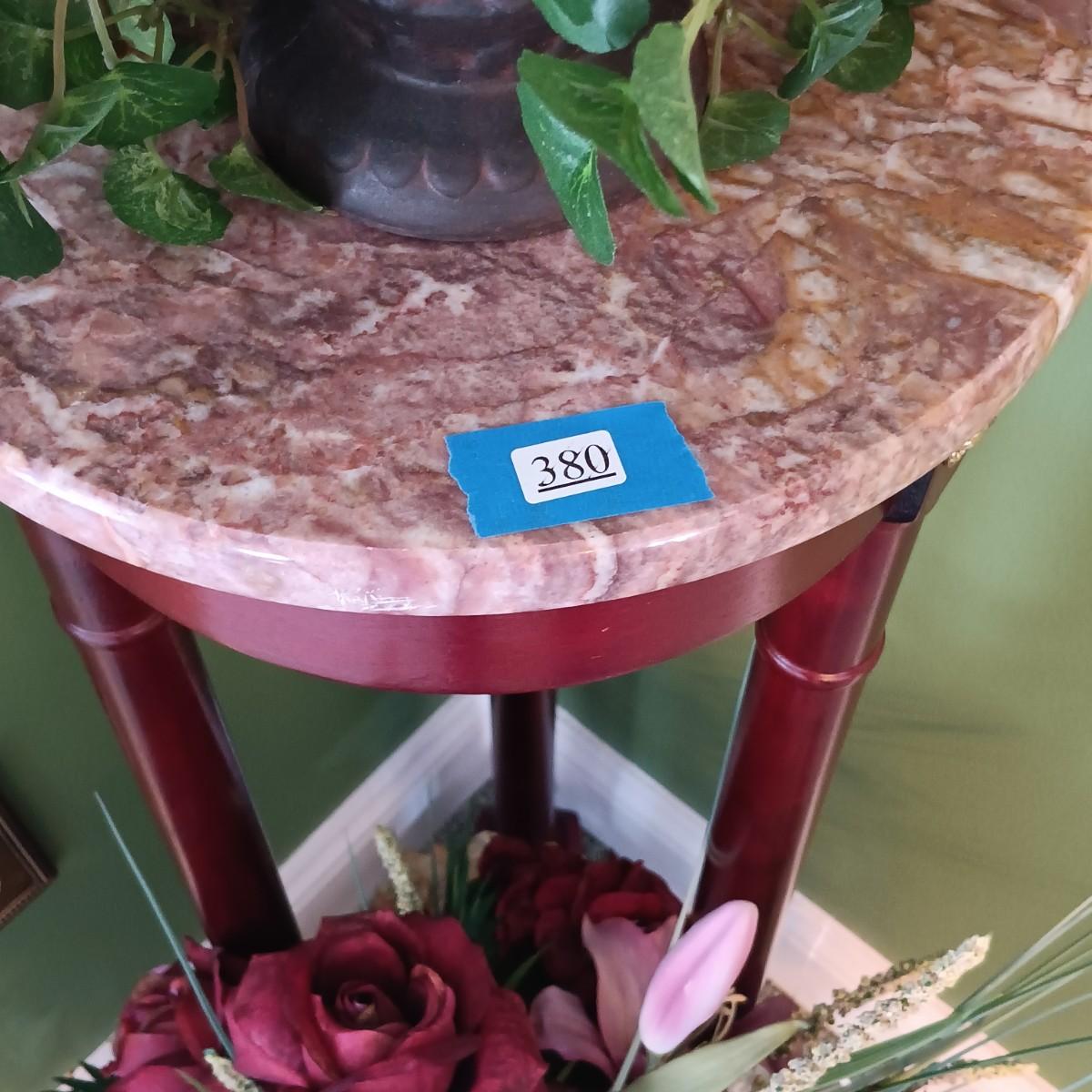 LOT 380D: Marble Top Pedestal Plant Stand with Two Feaux Flower Arrangements