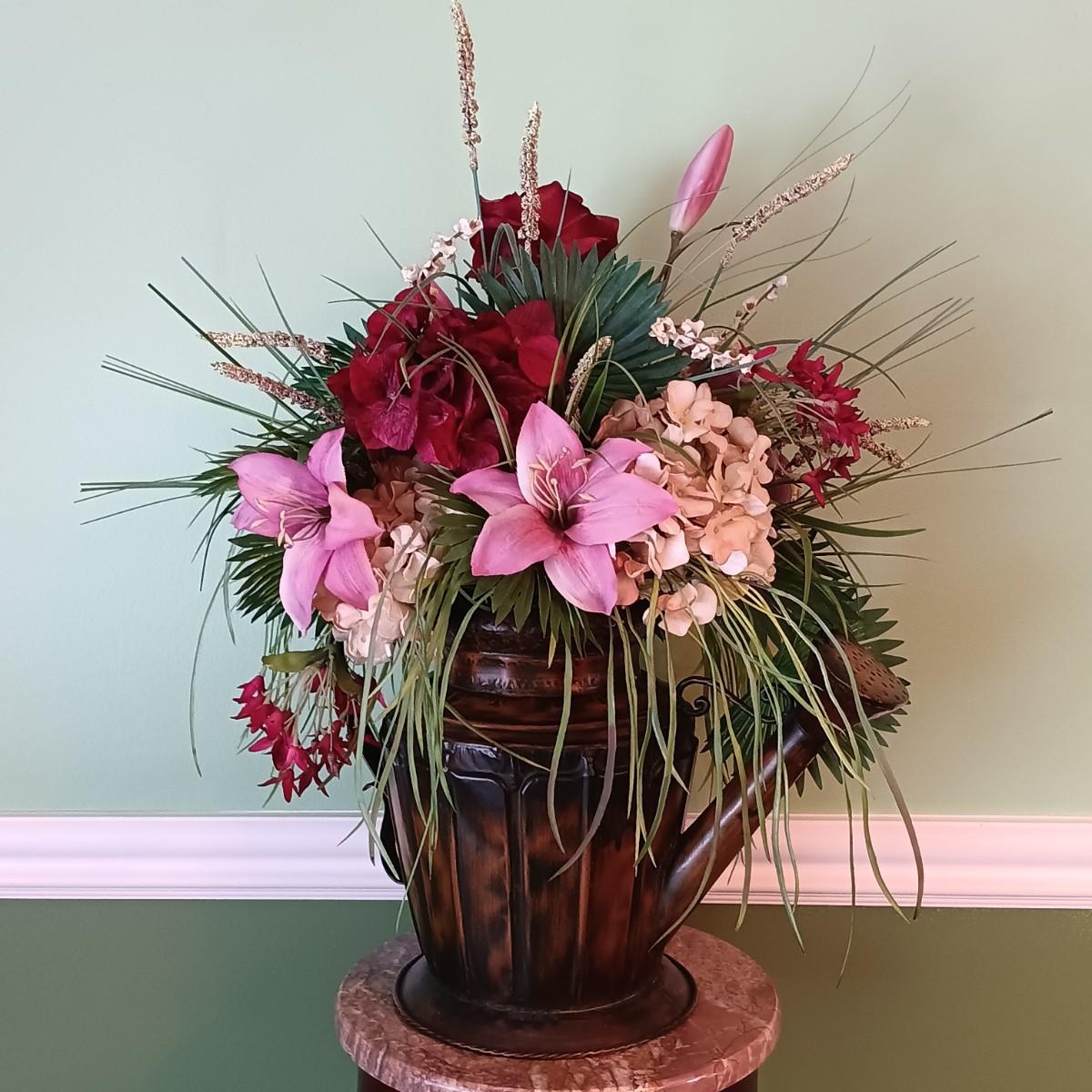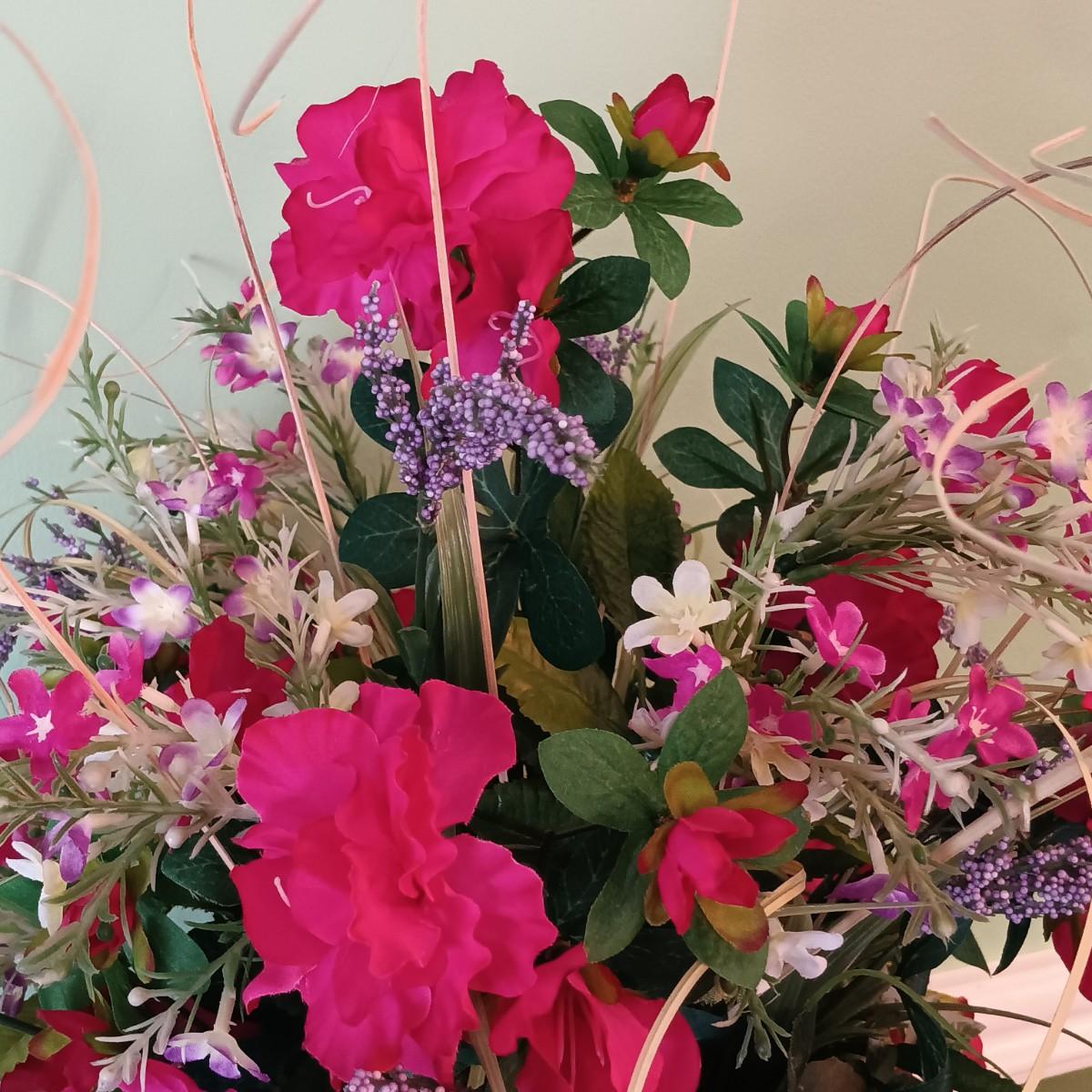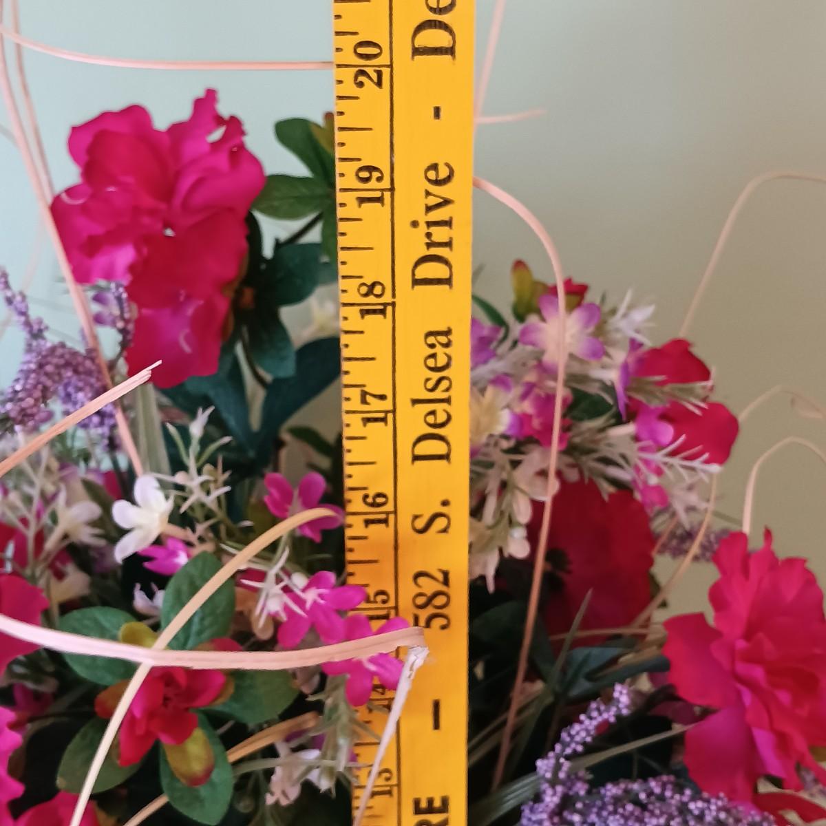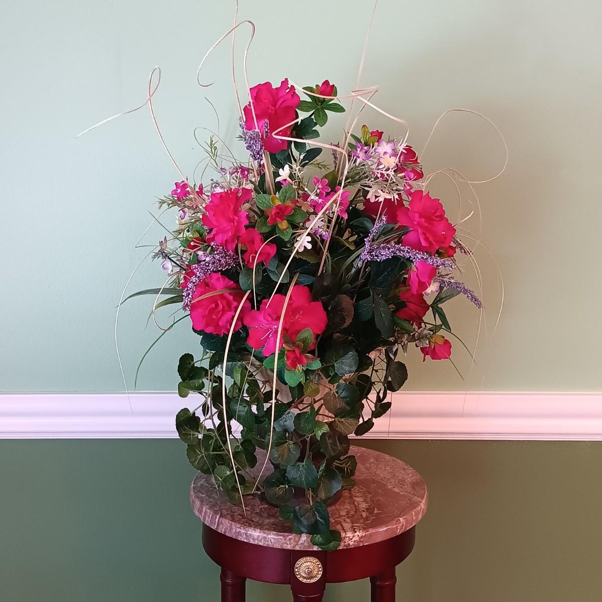 LOT 380D: Marble Top Pedestal Plant Stand with Two Feaux Flower Arrangements