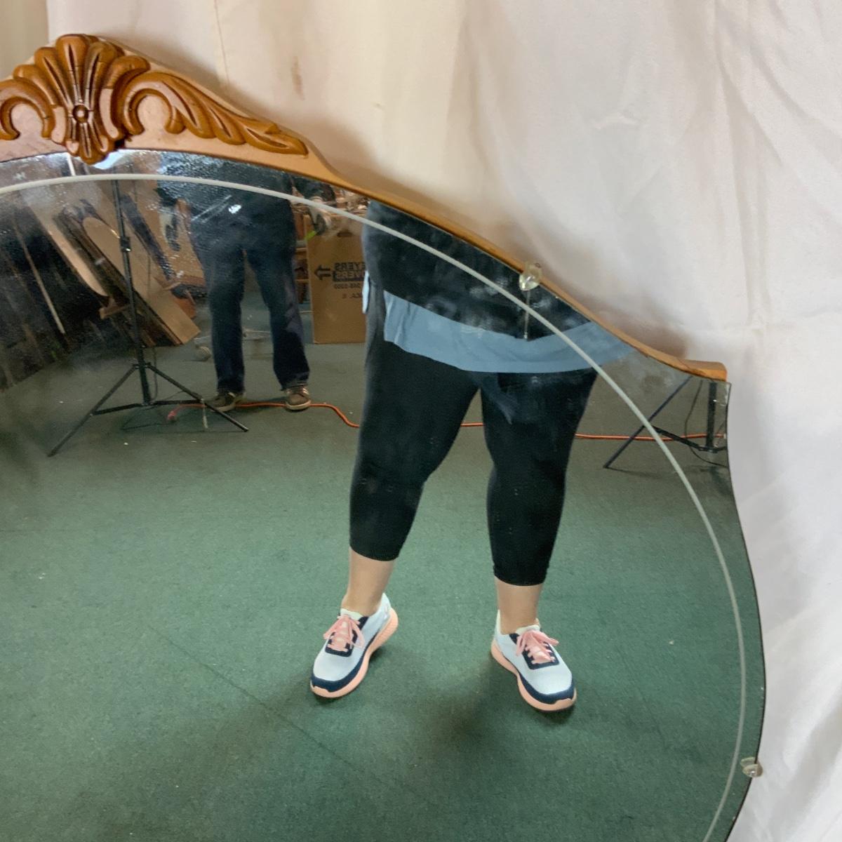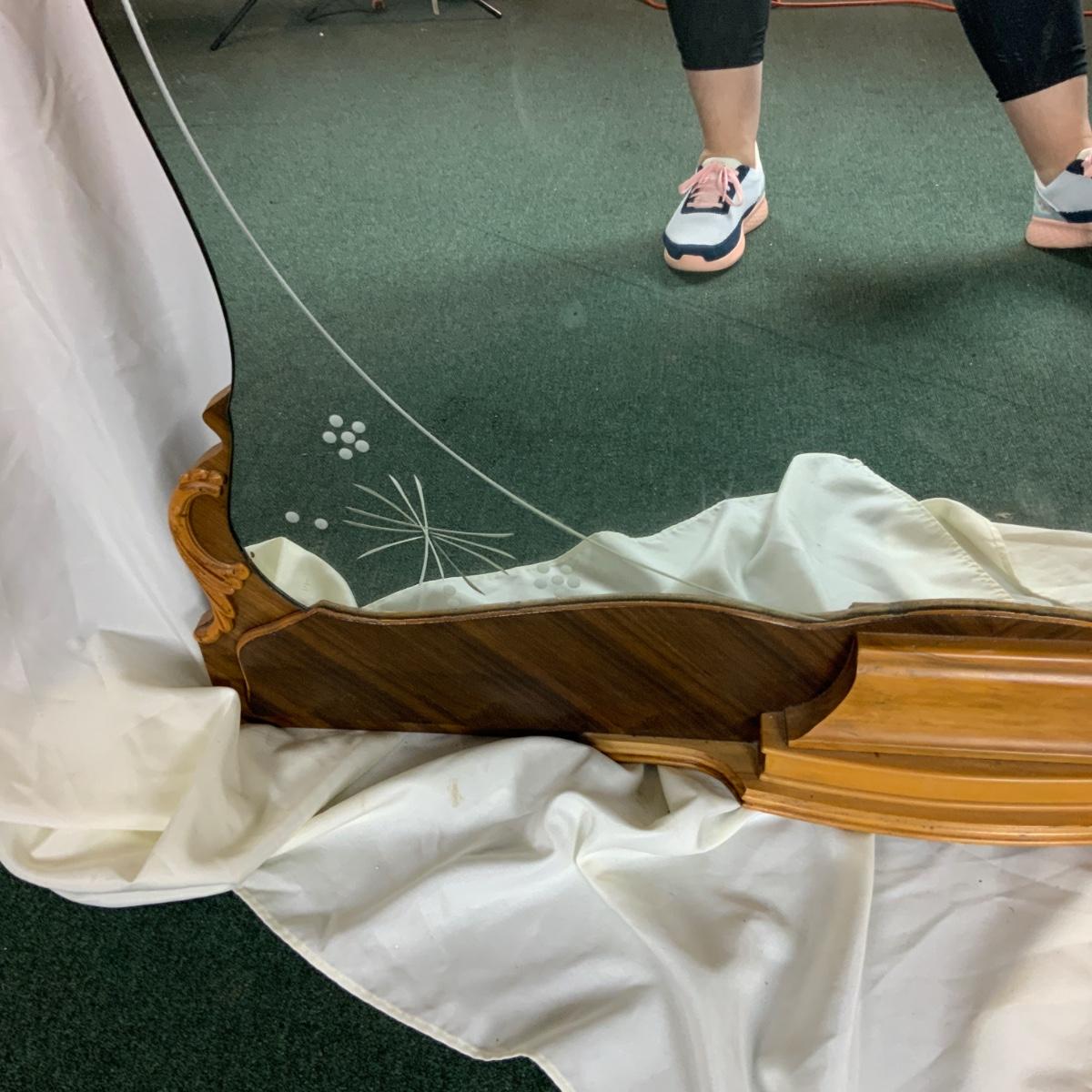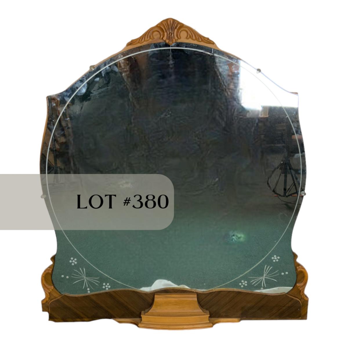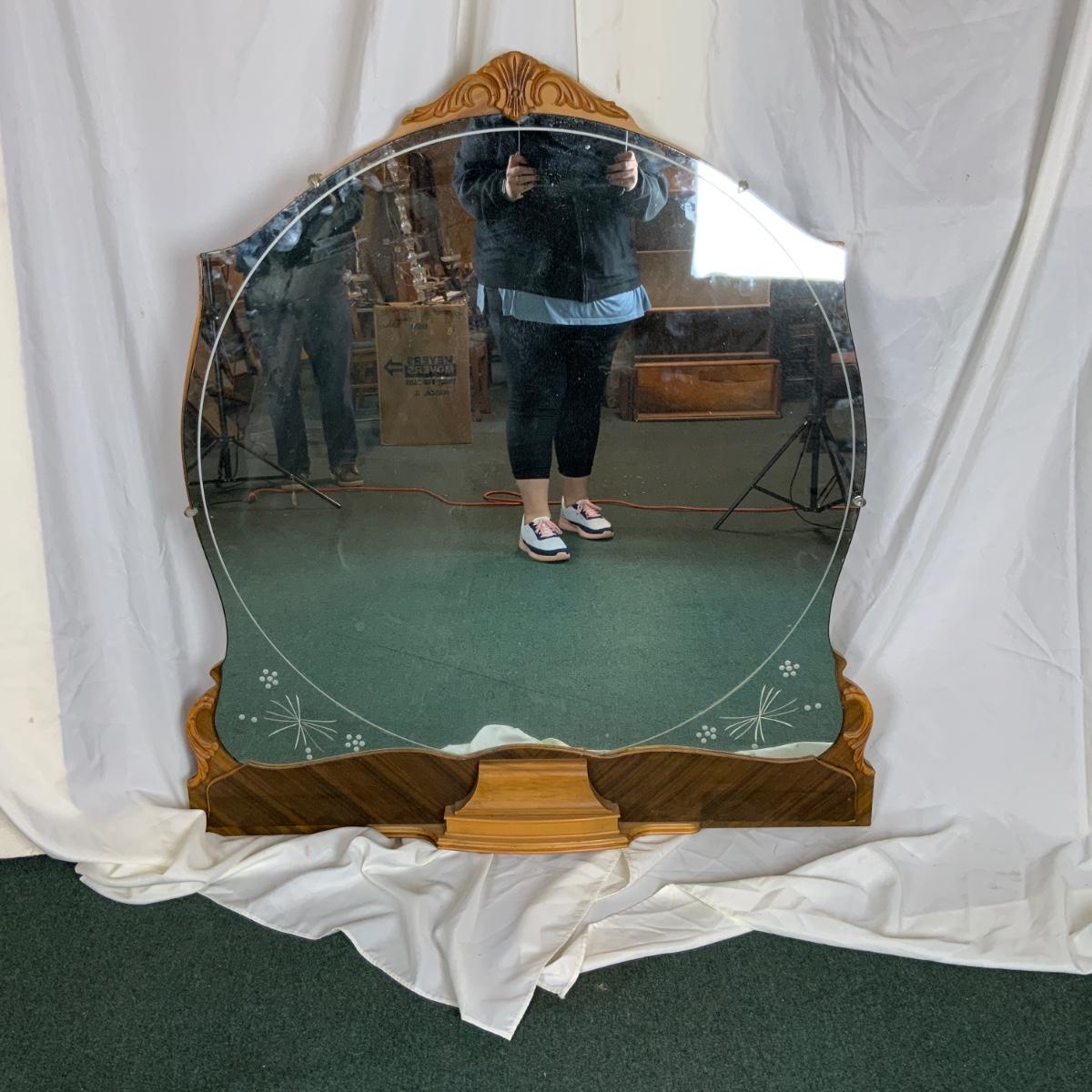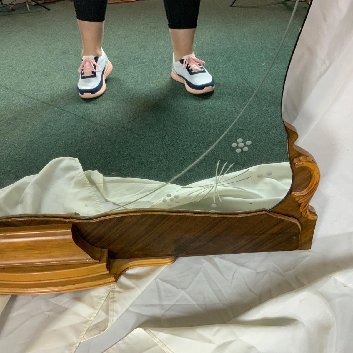 Etched glass large mirror. Nice detailing on the base. //::\\ Please see photos for details and condition. No attempt has been made to hide any imperfections. All items listed in this auction are warehouse items, and need to be cleaned. A majority of the items need restoration as well. All items are sold AS IS and WITHOUT GUARANTEE. If you are uncertain about an item, DO NOT BID. Due to the nature of this online auction in-person inspection is HIGHLY recommended. All Sales are FINAL. Pick Up Times are FIRM. Please confirm with your own schedule that you can pick up in the scheduled times listed in the Terms and Conditions. Any questions please message the auctioneer. DO NOT Contact The Harp Gallery.