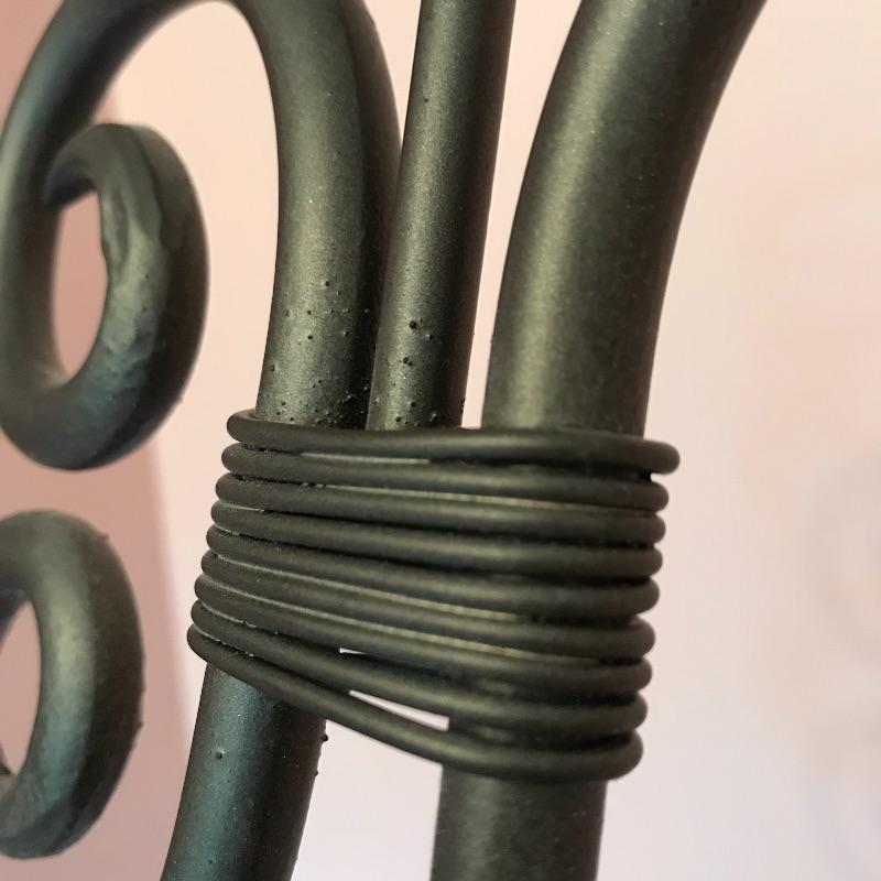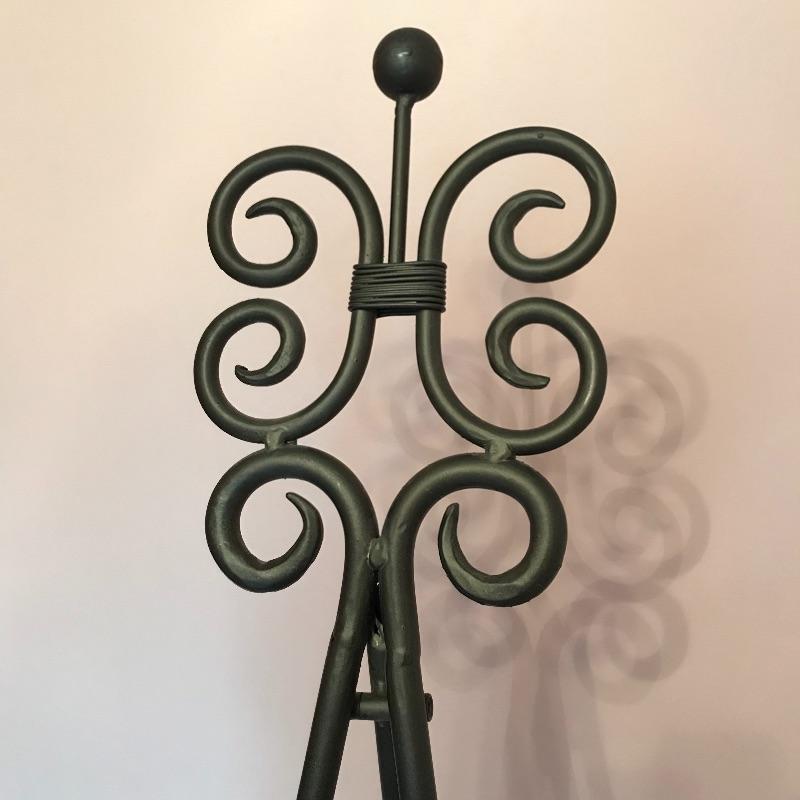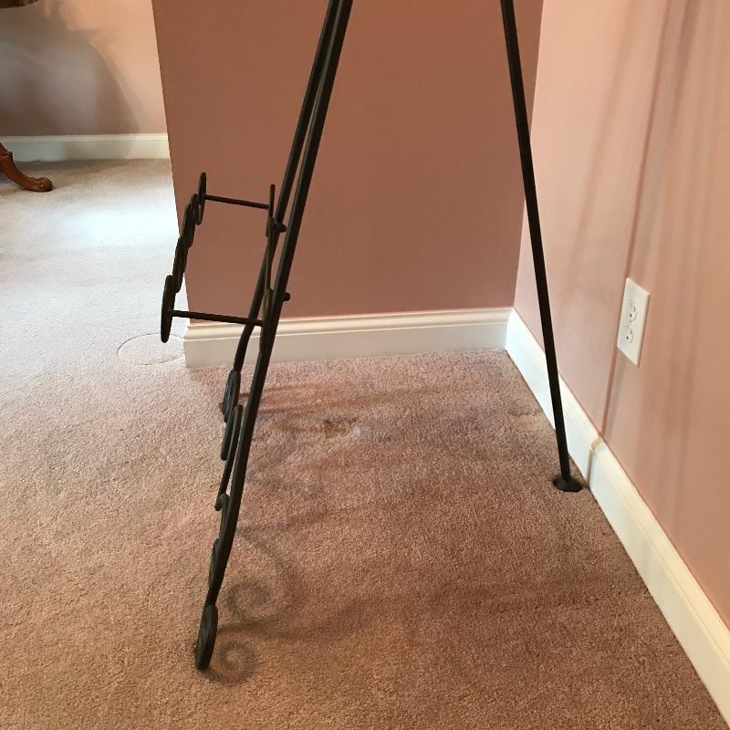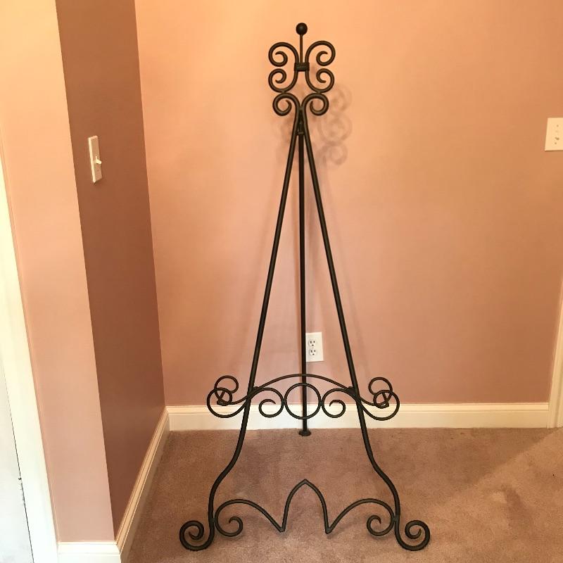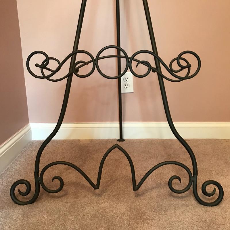 Lovely dark brown curvy metal easel. When extended, the easel sits five feet tall with your art displayed 19” above the floor. The easel shelf would hold an art frame that is up to about 4.5” thick. The metal frame is thick and sturdy. No shipping.