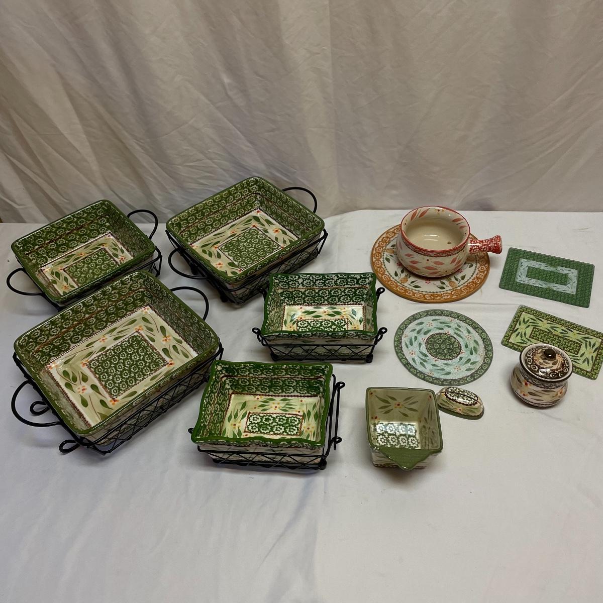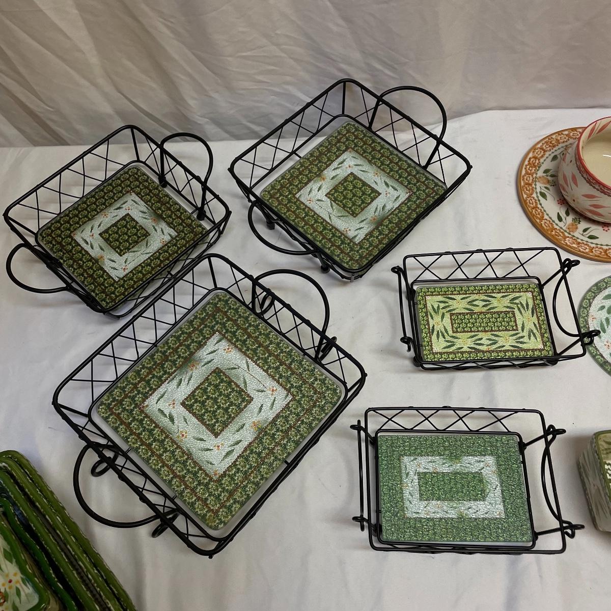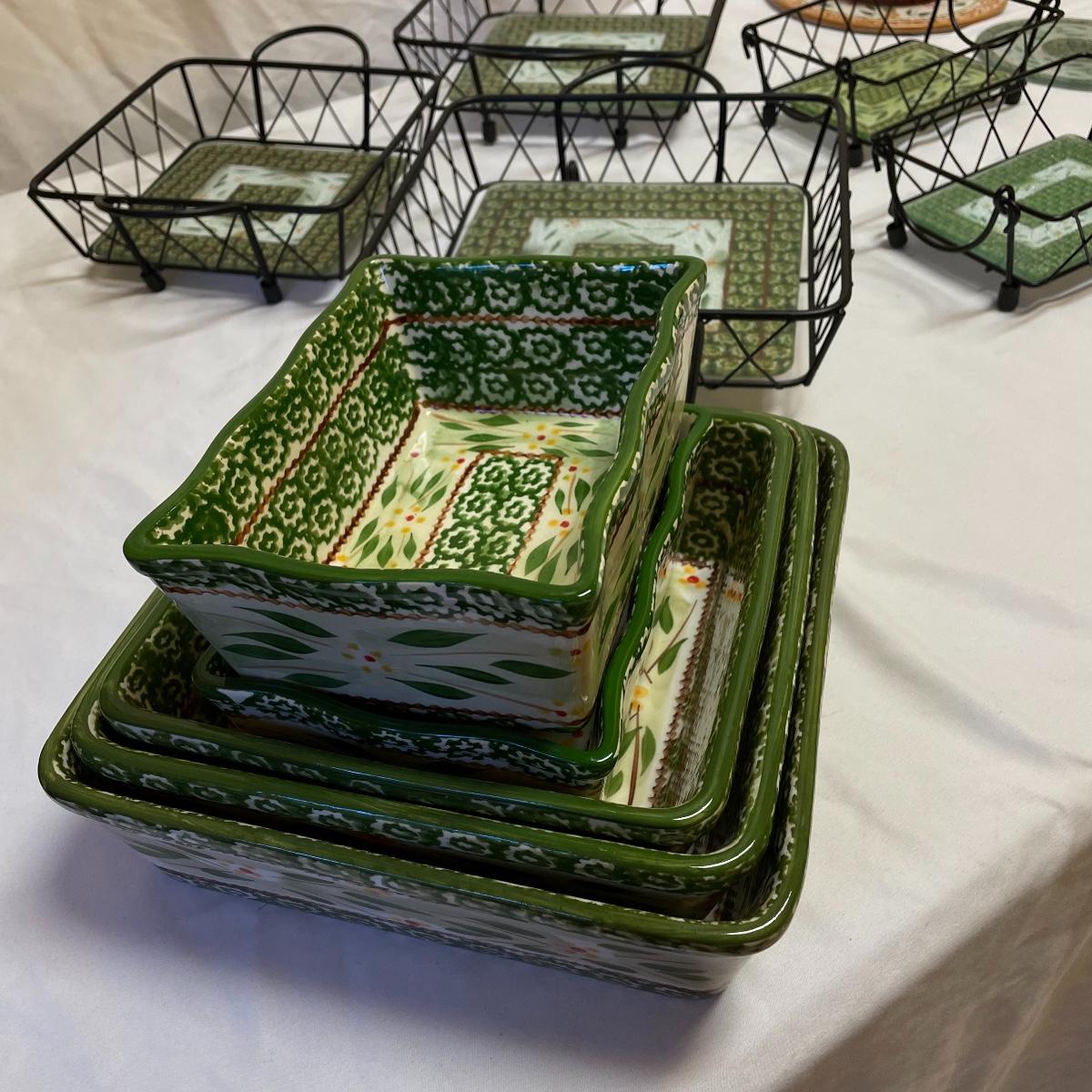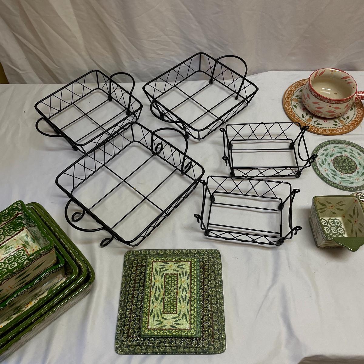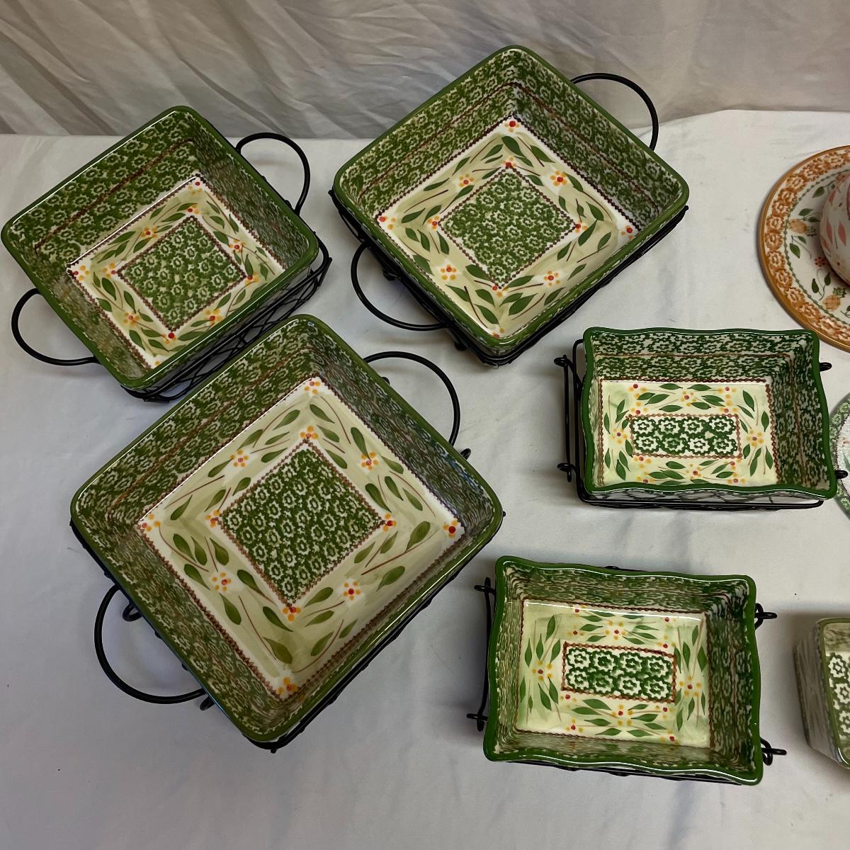 We’re all about convenience with style! Eight Temp-Tations by Tara oven safe dishes with trivets and baskets to make your food look as good as it tastes. The largest baking dish is 9” x 9”. All pieces are in great shape and six pieces have matching green and floral patterns. The trivets can be used by themselves or as a lining for the wire baskets. See images. Local pick up only.