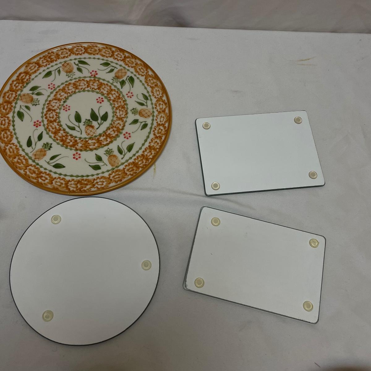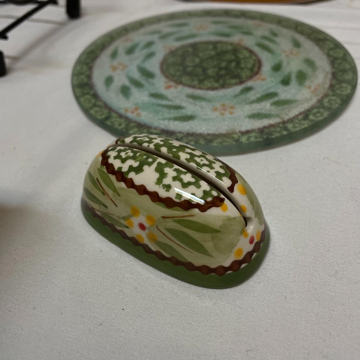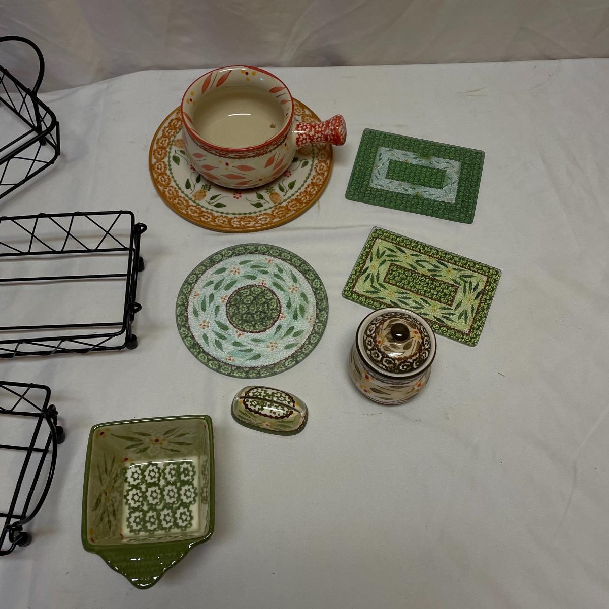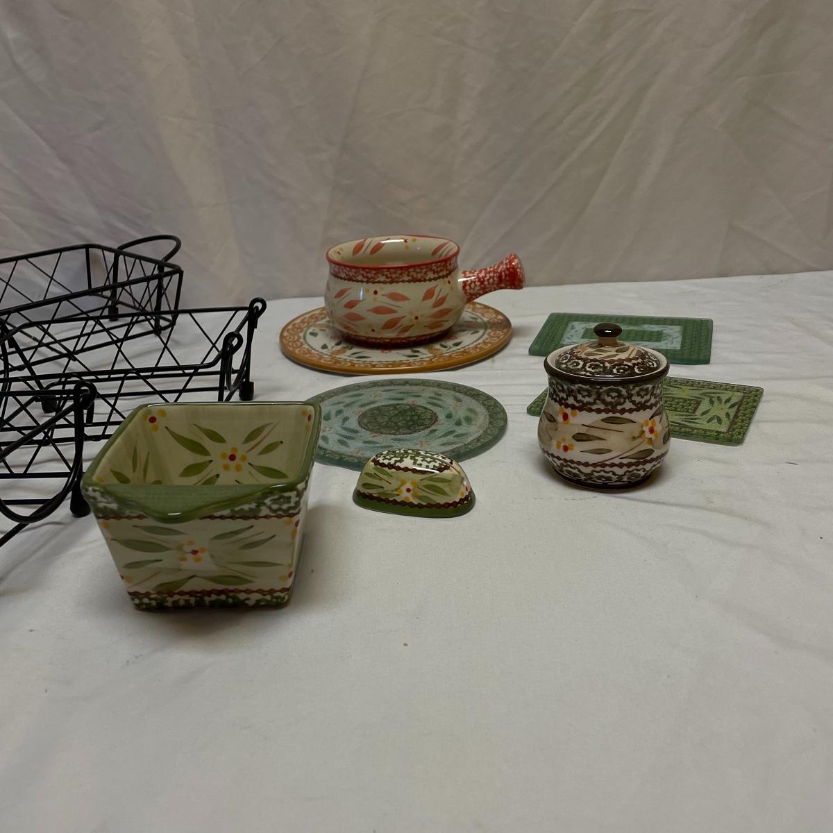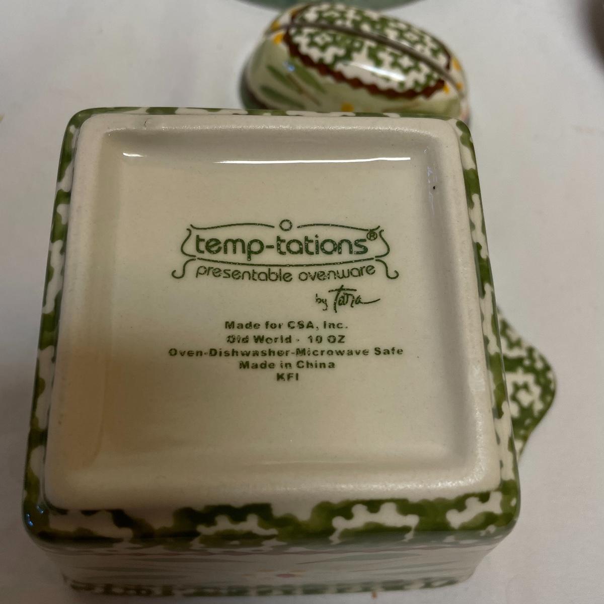 We’re all about convenience with style! Eight Temp-Tations by Tara oven safe dishes with trivets and baskets to make your food look as good as it tastes. The largest baking dish is 9” x 9”. All pieces are in great shape and six pieces have matching green and floral patterns. The trivets can be used by themselves or as a lining for the wire baskets. See images. Local pick up only.