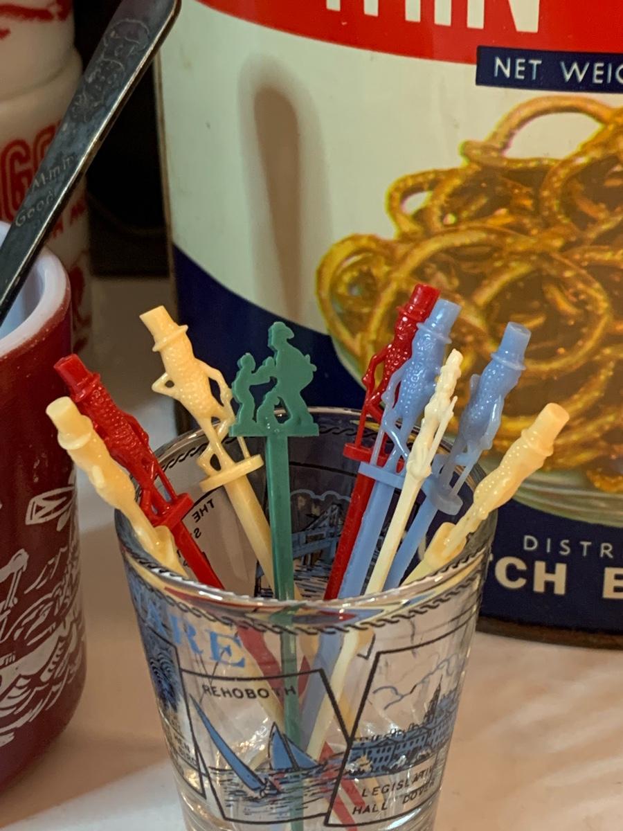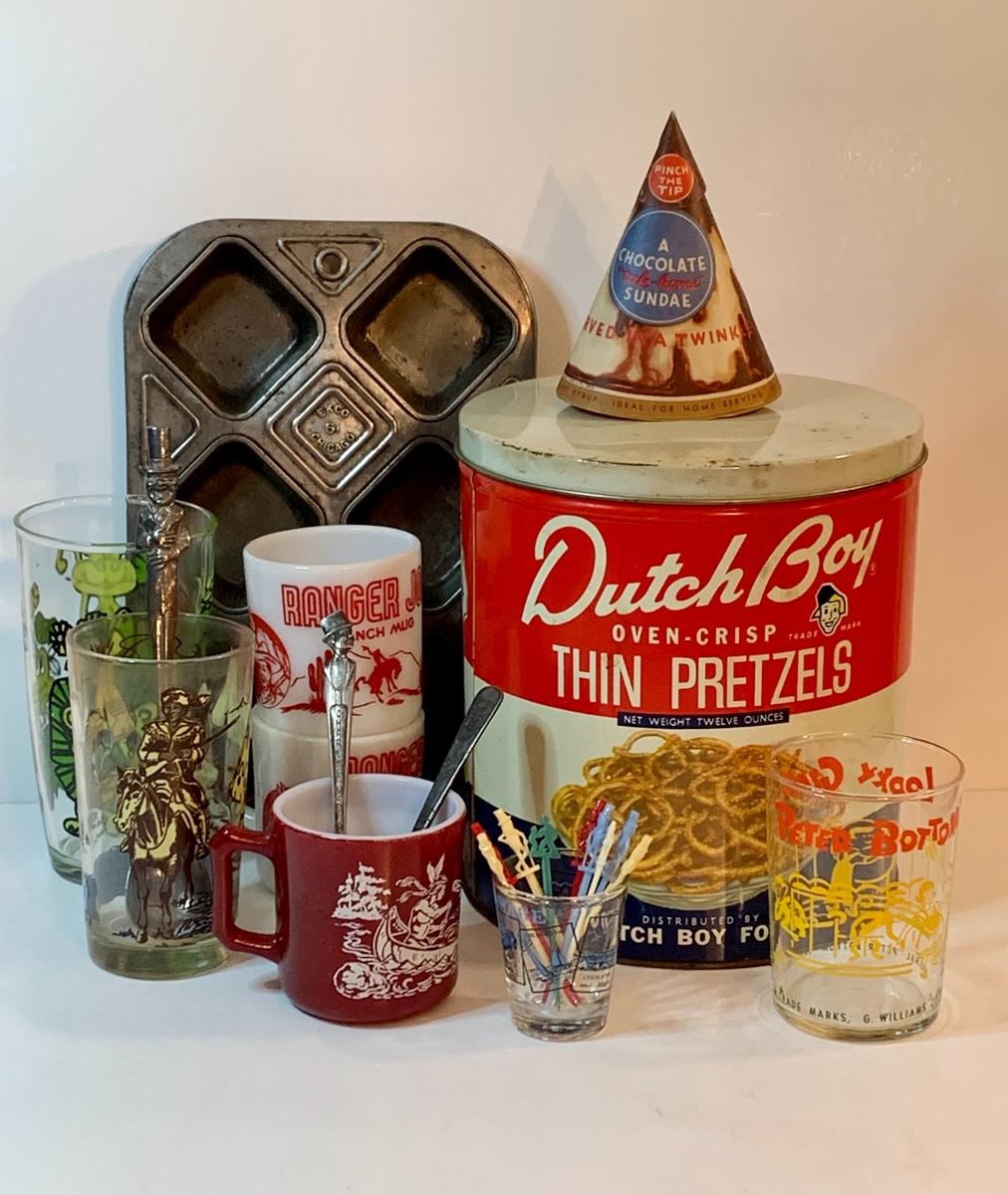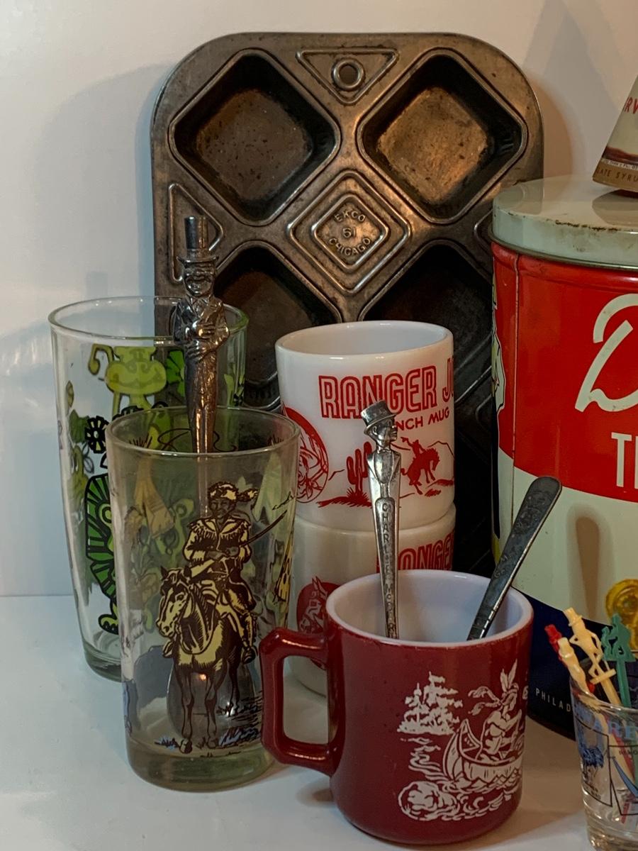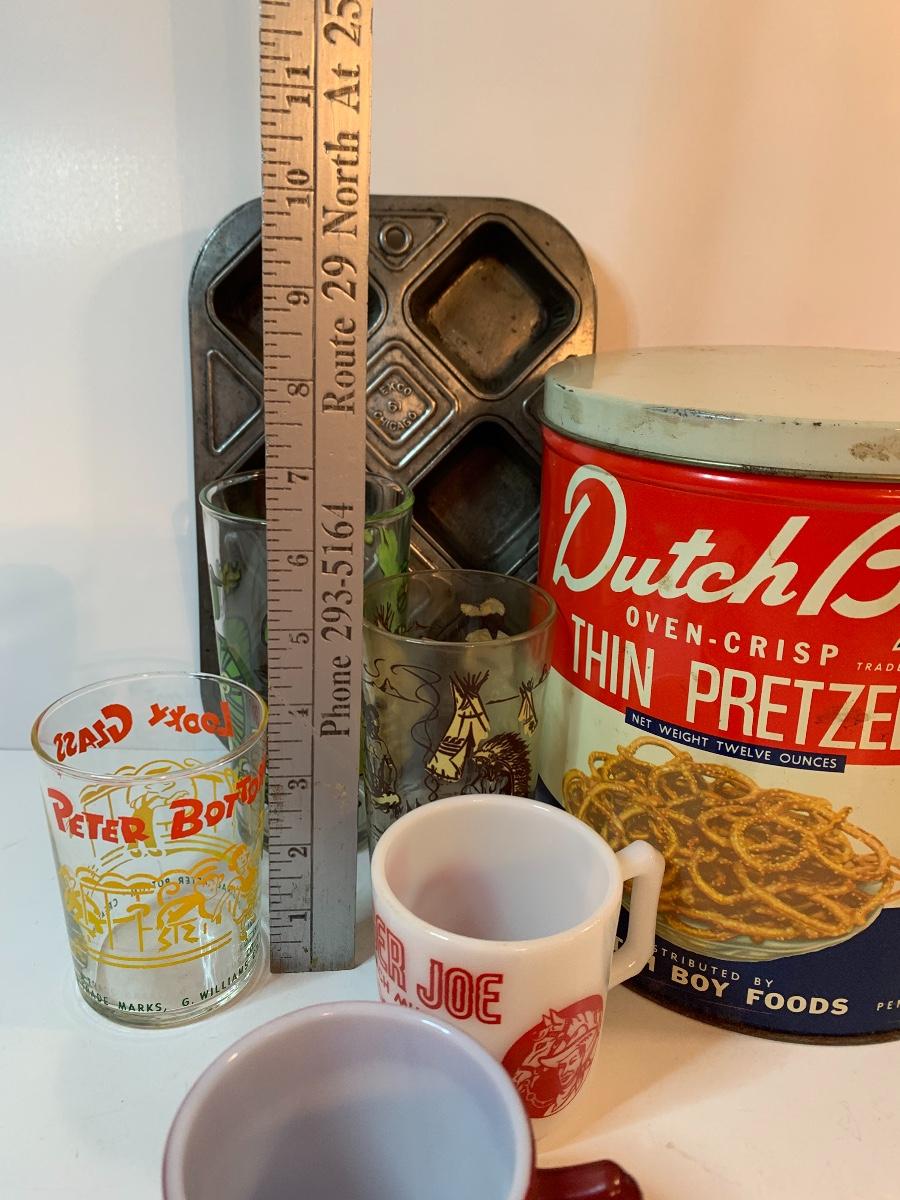 Nice "Kitschy" lot of vintage beverage glasses and milk glass mugs, Planters Peanut hors d" oeuvre picks, Ekco tin, Dutch Boy tin and more. Please see all pictures as they are the best representation of the items. The pictures show condition, measurements if taken, and what is included in the lot. Due to the large amount that we photograph and the time frame, we are not always able to take measurements. All items unless noted, are pre-owned and have been used. If you purchased furniture, you must bring help. We do not allow one person to carry large furniture out on their own. Bring help, tools and a truck for the safety of our client’s homes, and your personal safety. Company policy. Thank you.