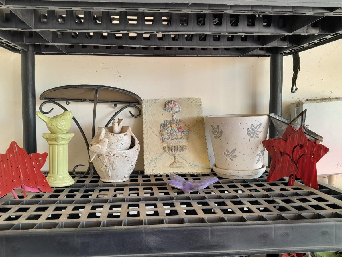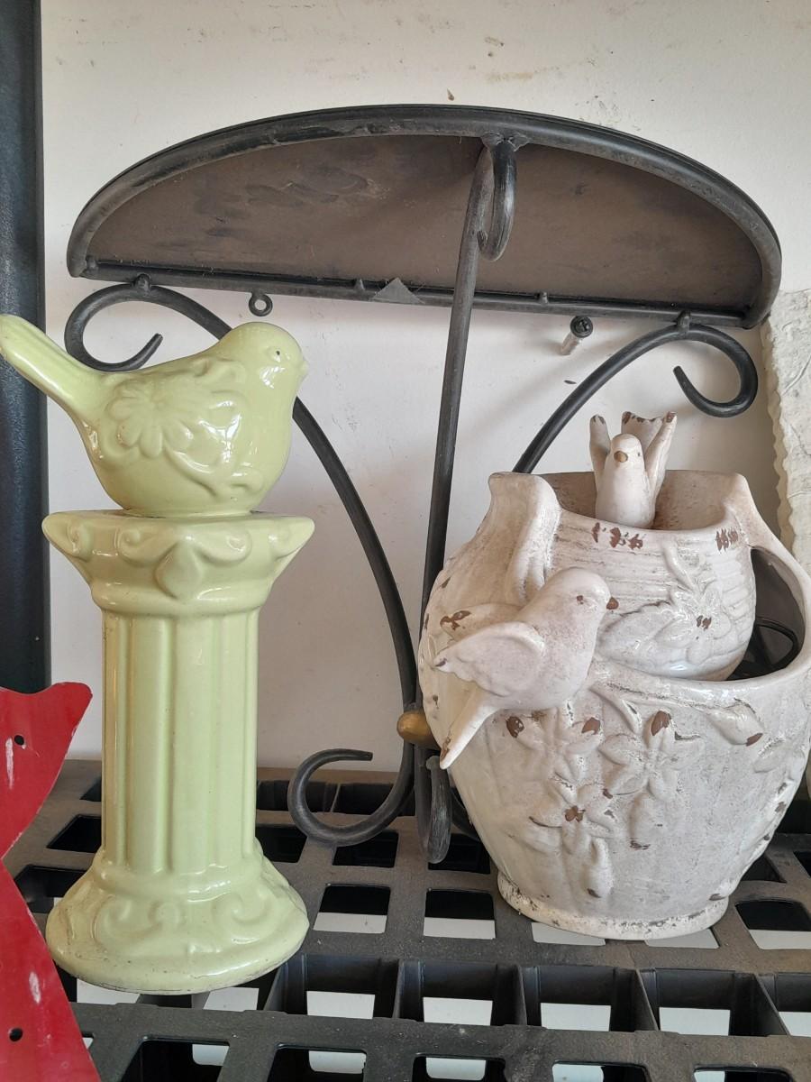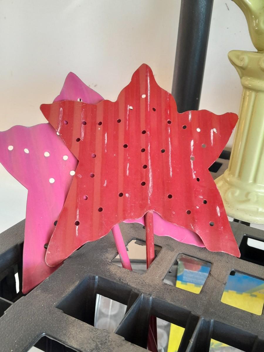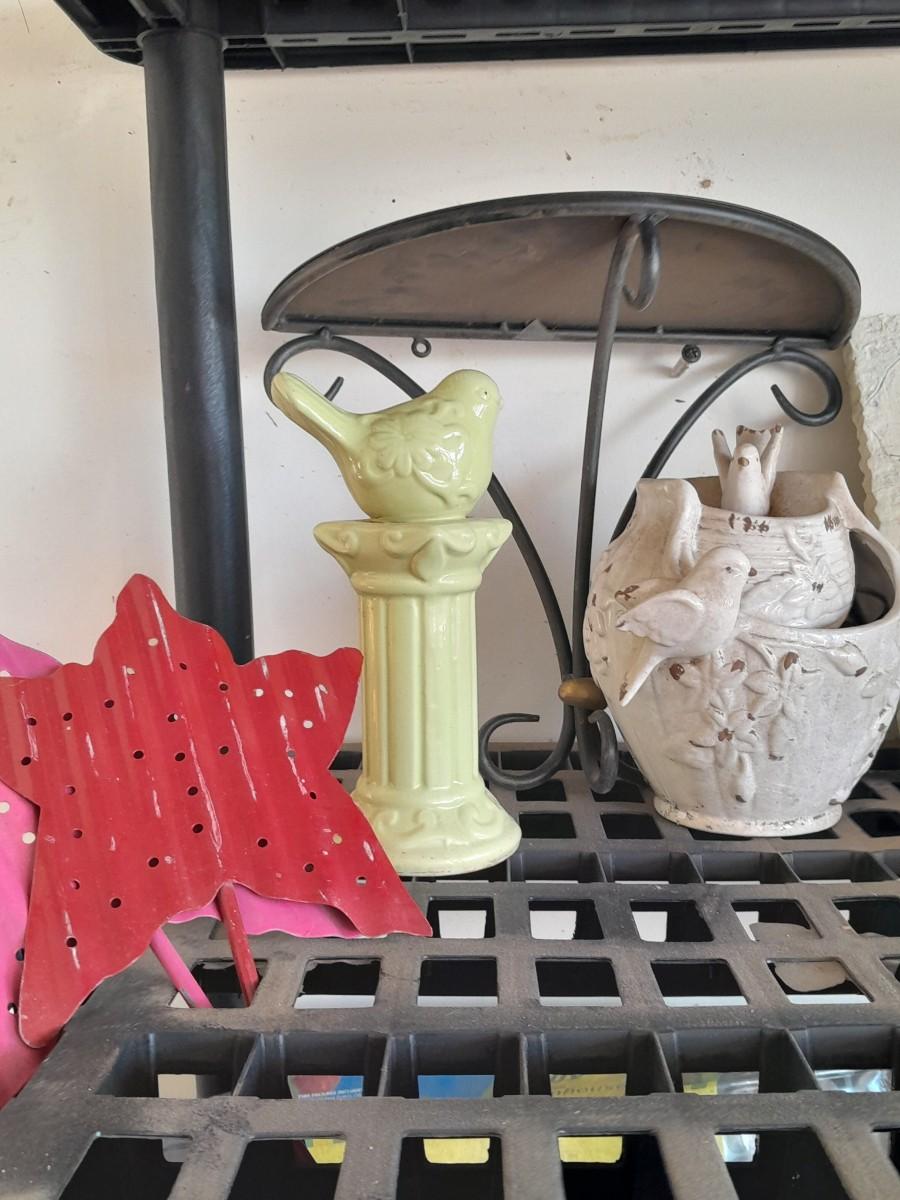 SMALL WATER FEATURE WITH BIRDS, GREEN BIRD ON A PEDESTAL, FLOWERPOT, SEVERAL METAL STAR STAKES, METAL STAR CANDLE HOLDER, AND MORE