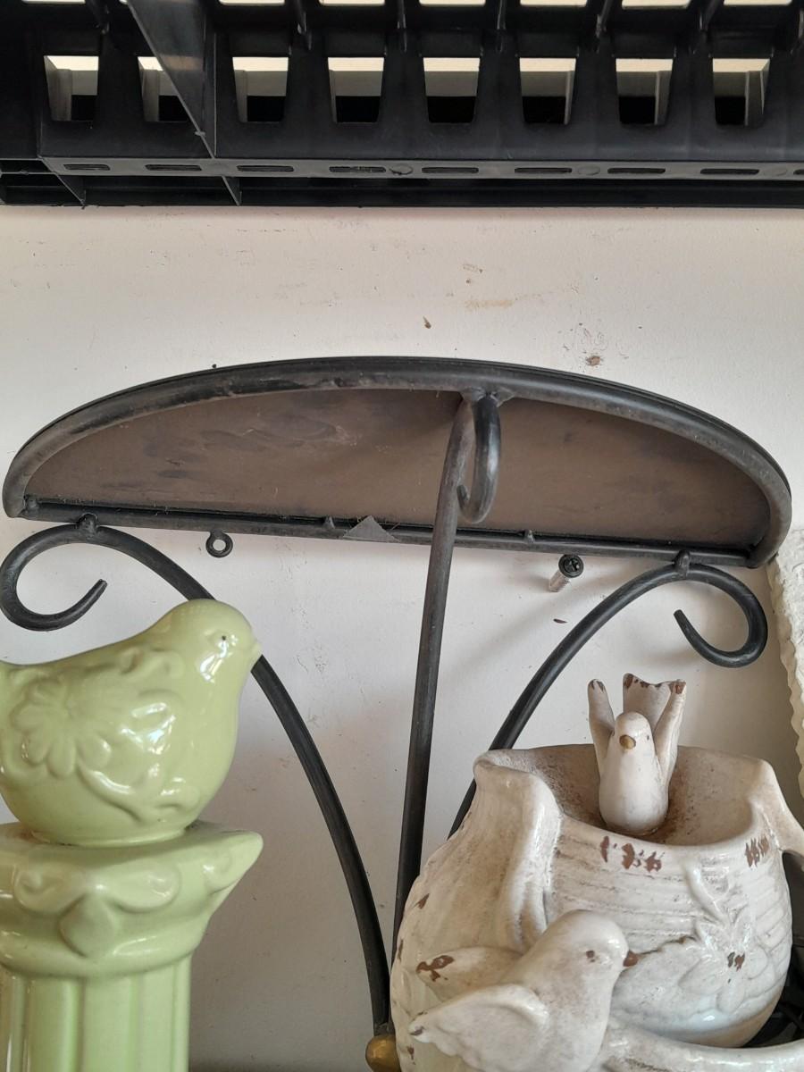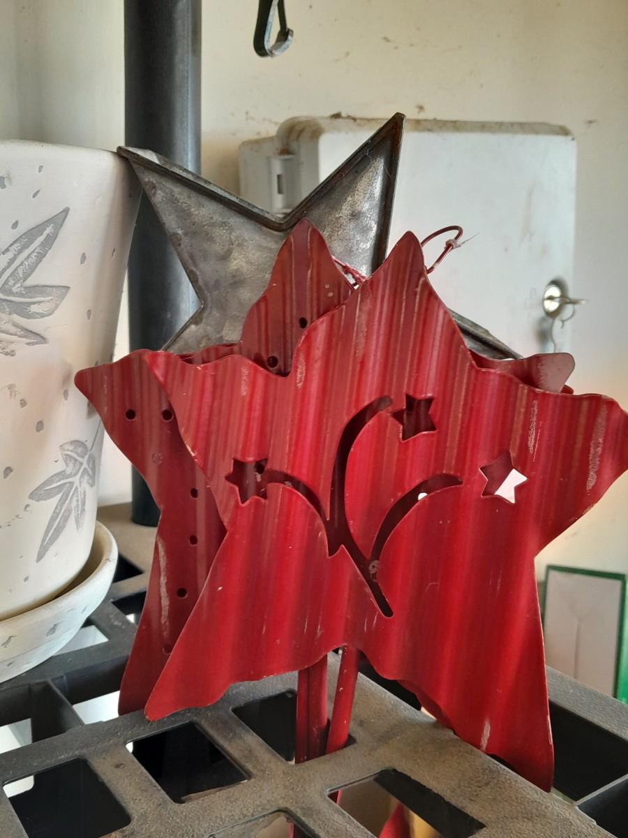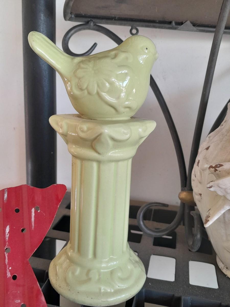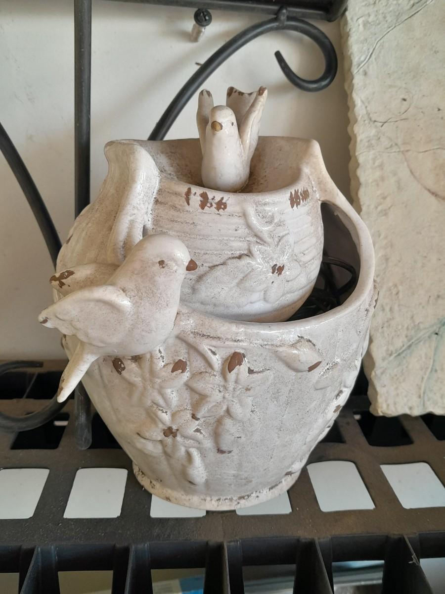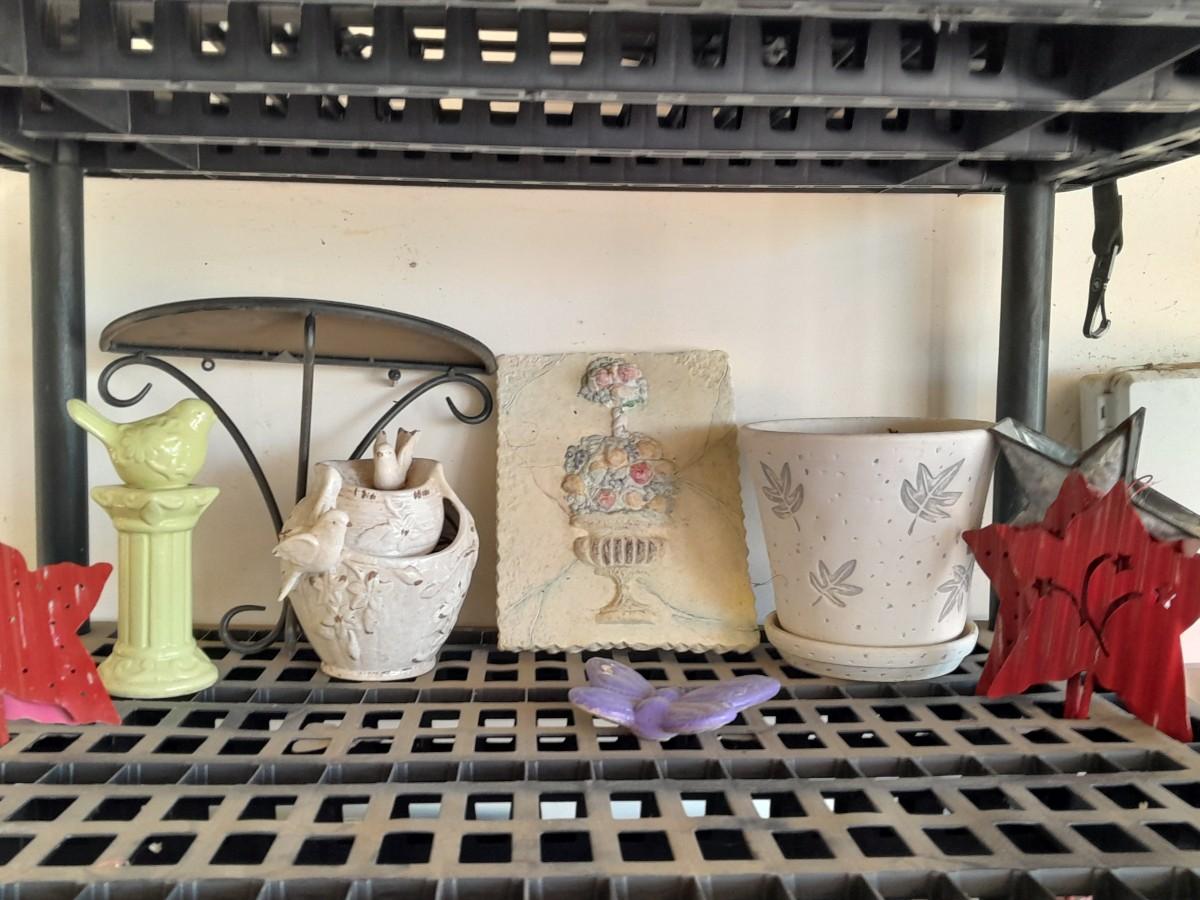 SMALL WATER FEATURE WITH BIRDS, GREEN BIRD ON A PEDESTAL, FLOWERPOT, SEVERAL METAL STAR STAKES, METAL STAR CANDLE HOLDER, AND MORE