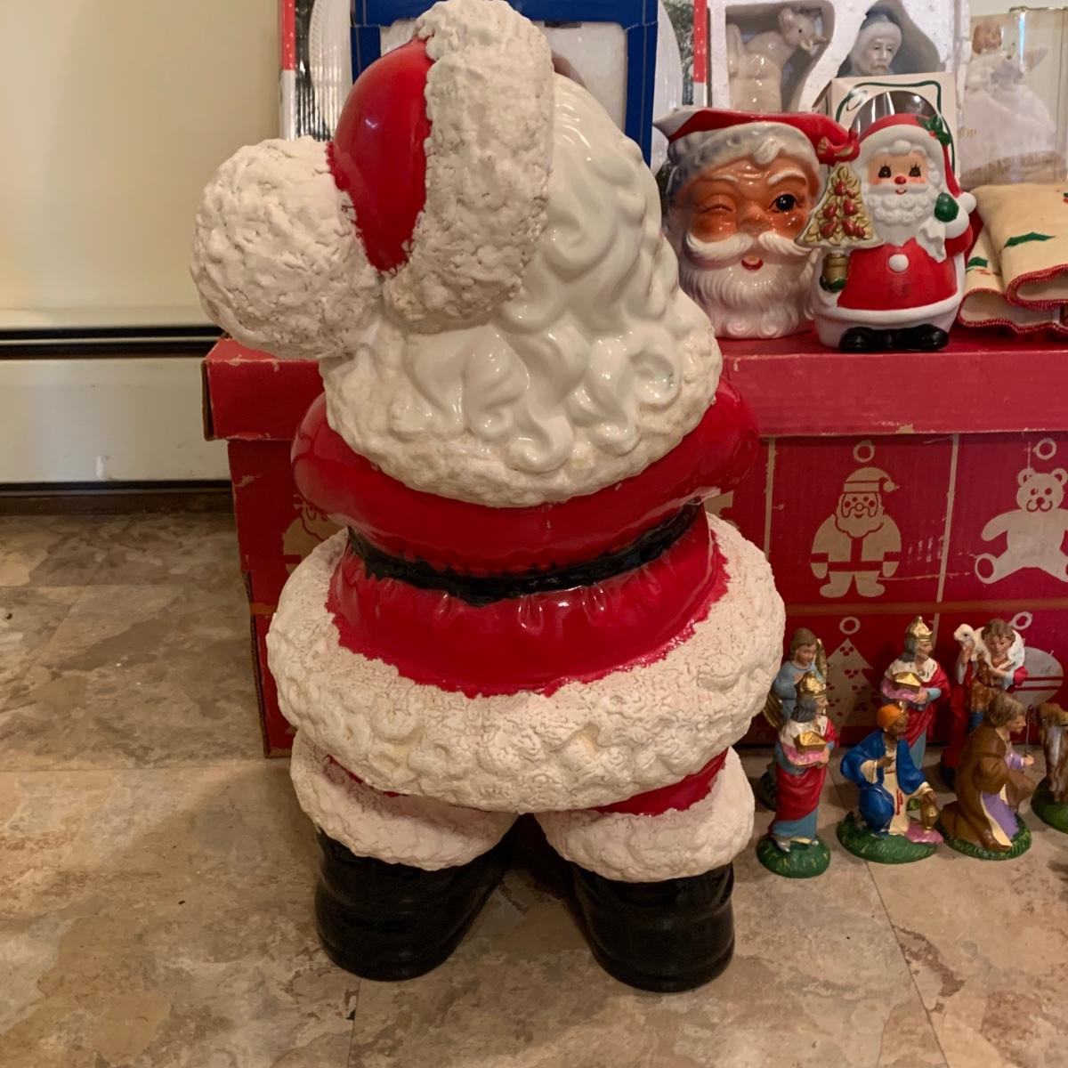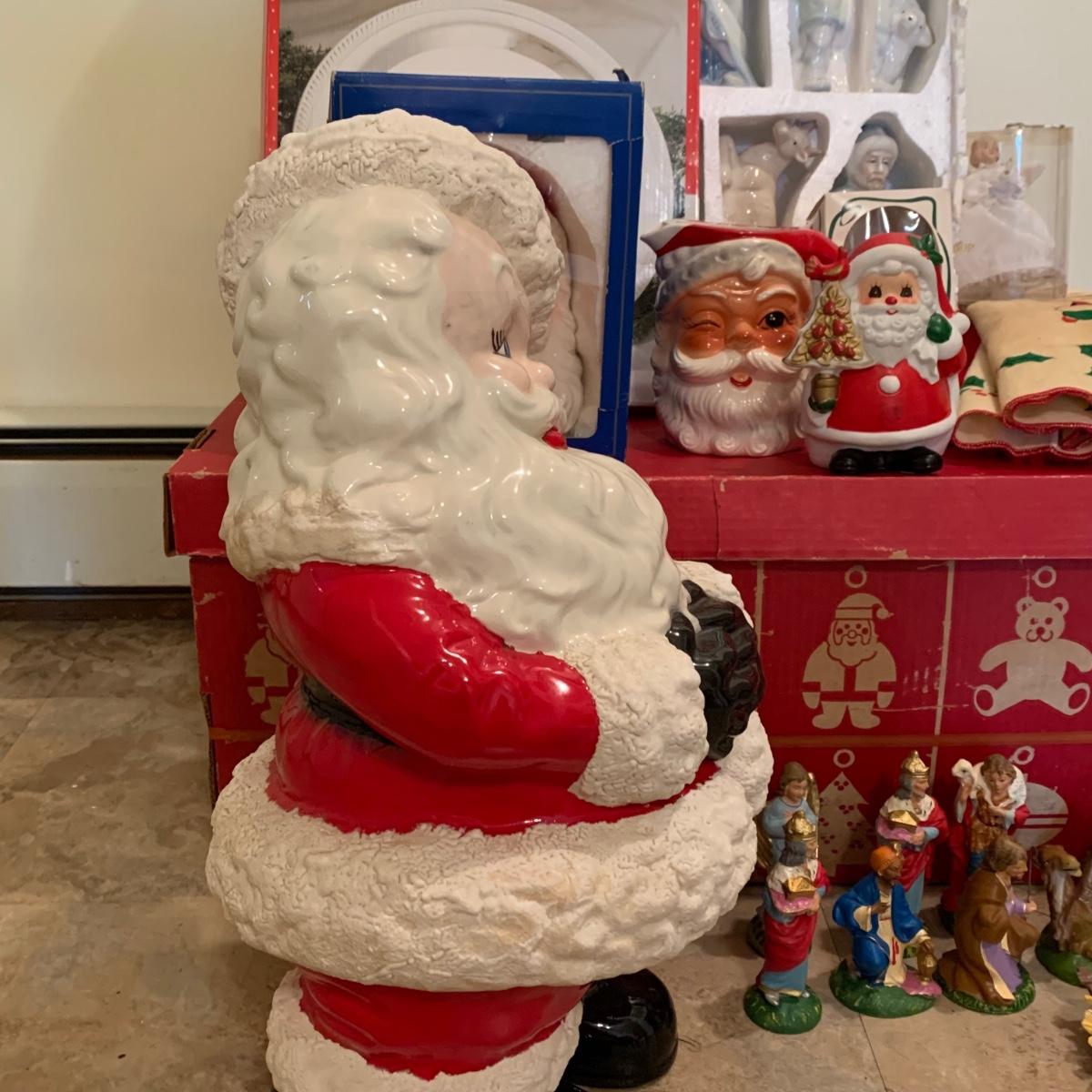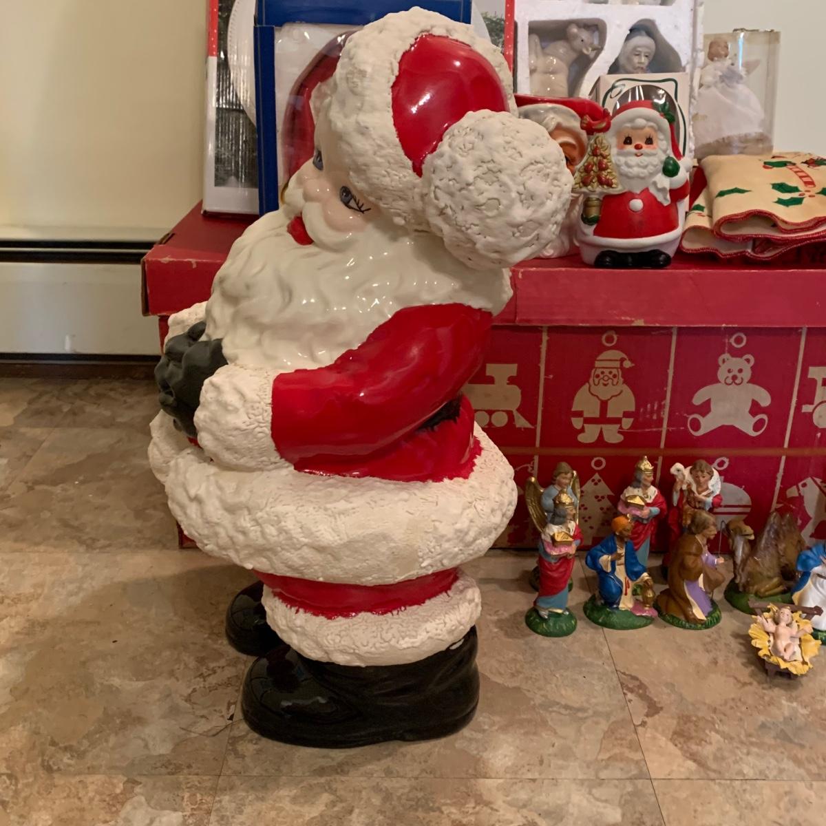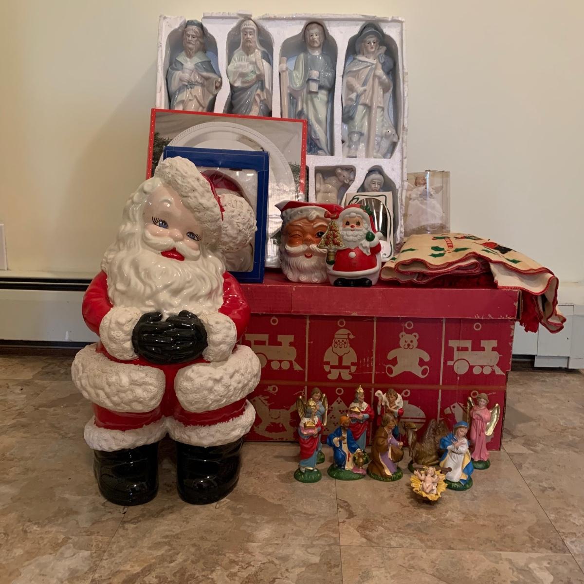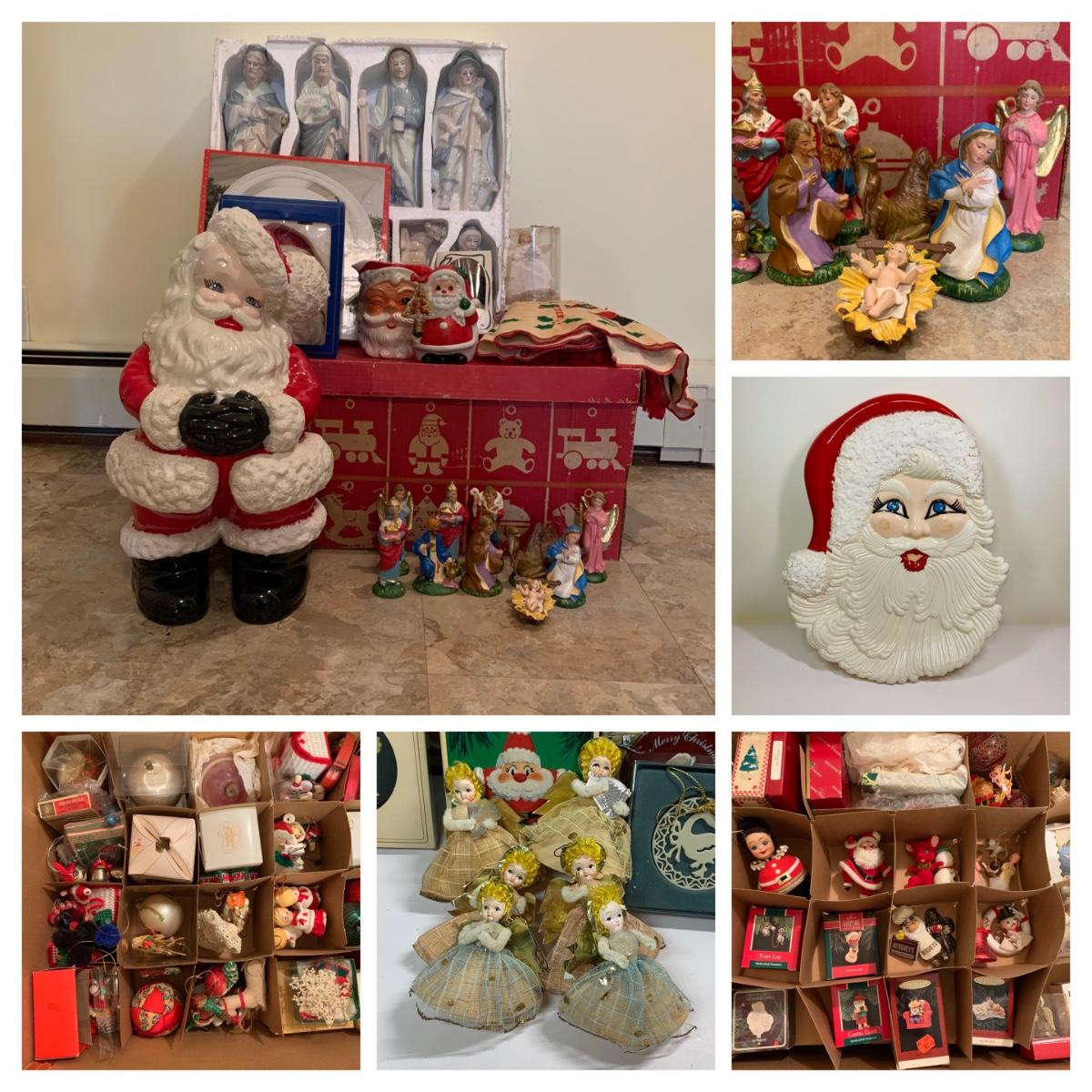 Lot 381: Vintage Christmas Collection: Hallmark, Annalee, Tree Skirt, Ceramic Santa, Santa Tray, New & Old Nativities and so much more