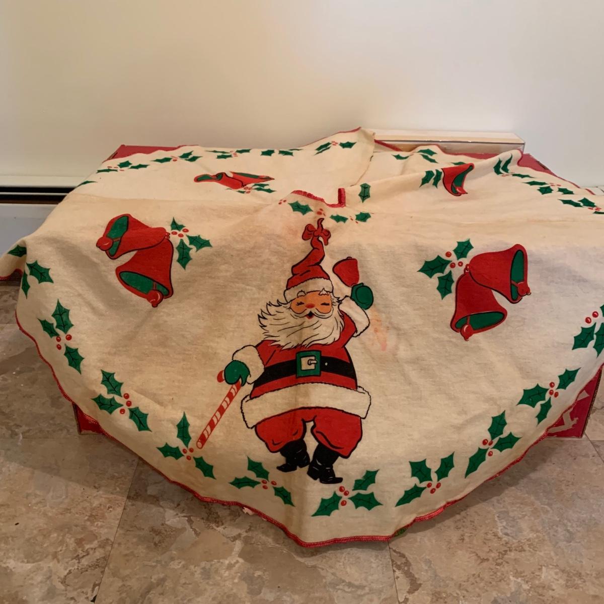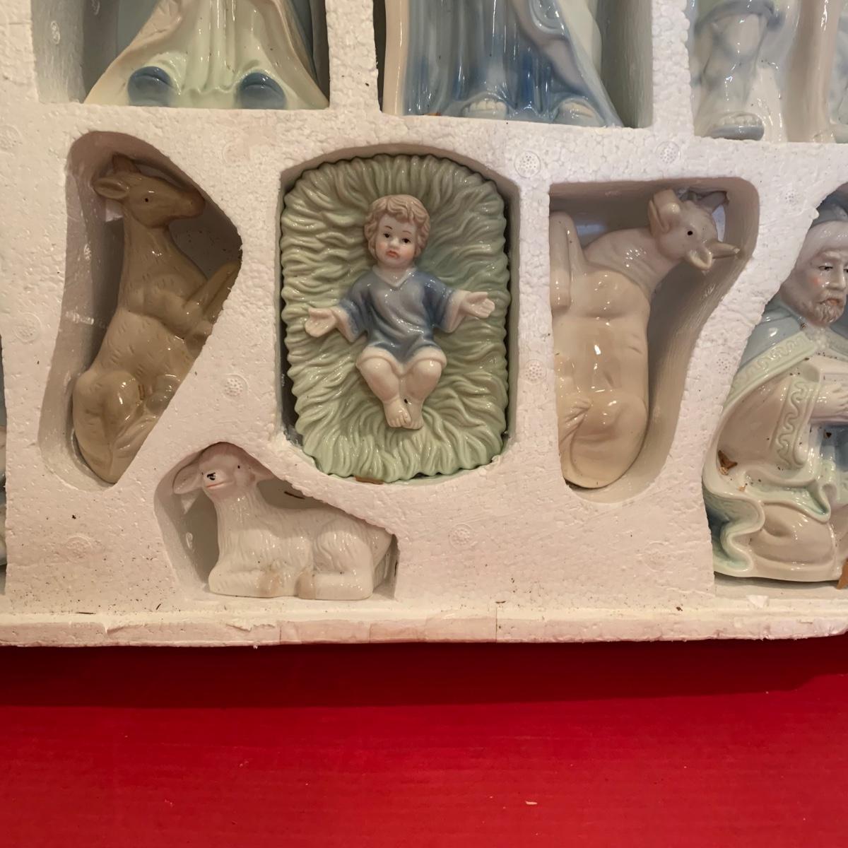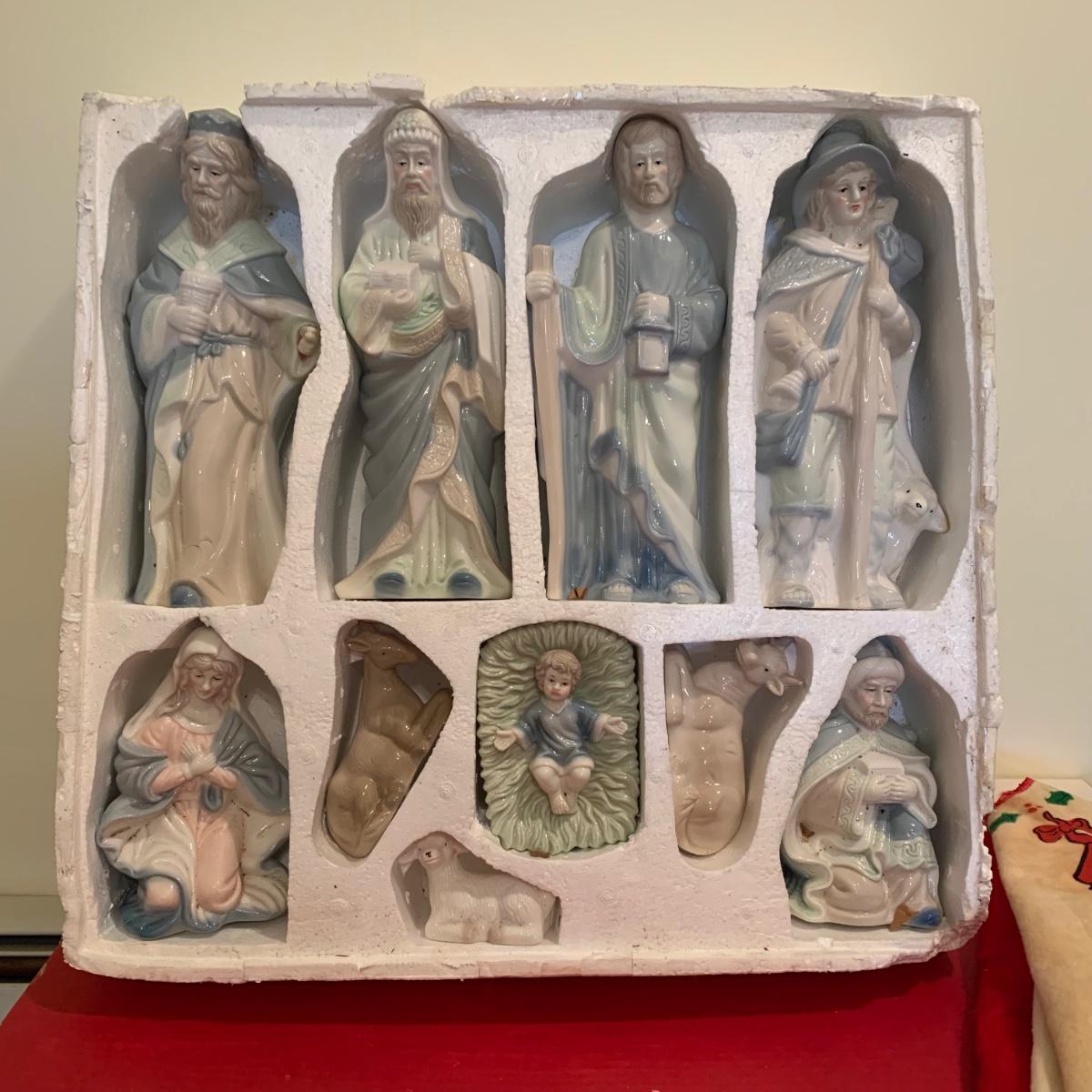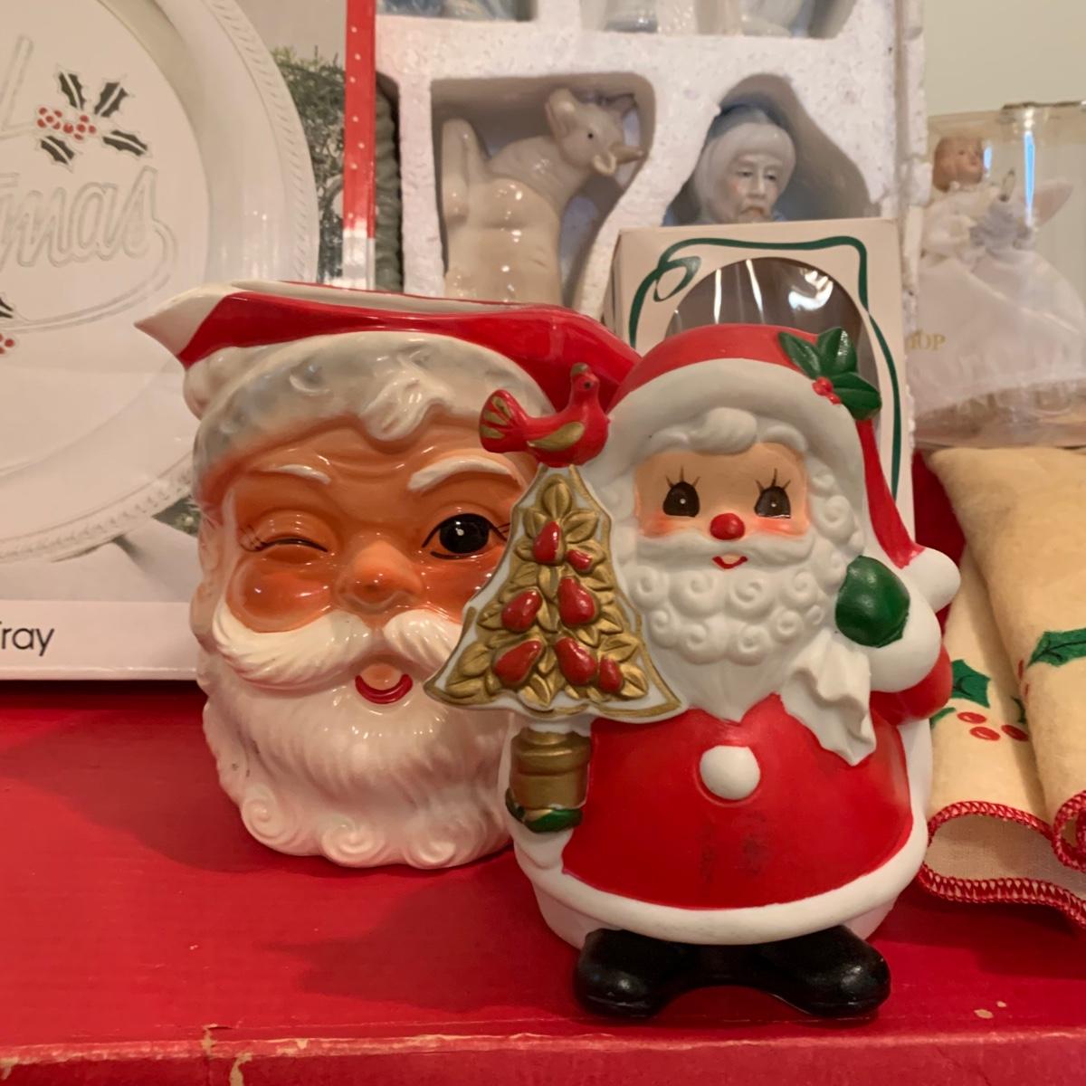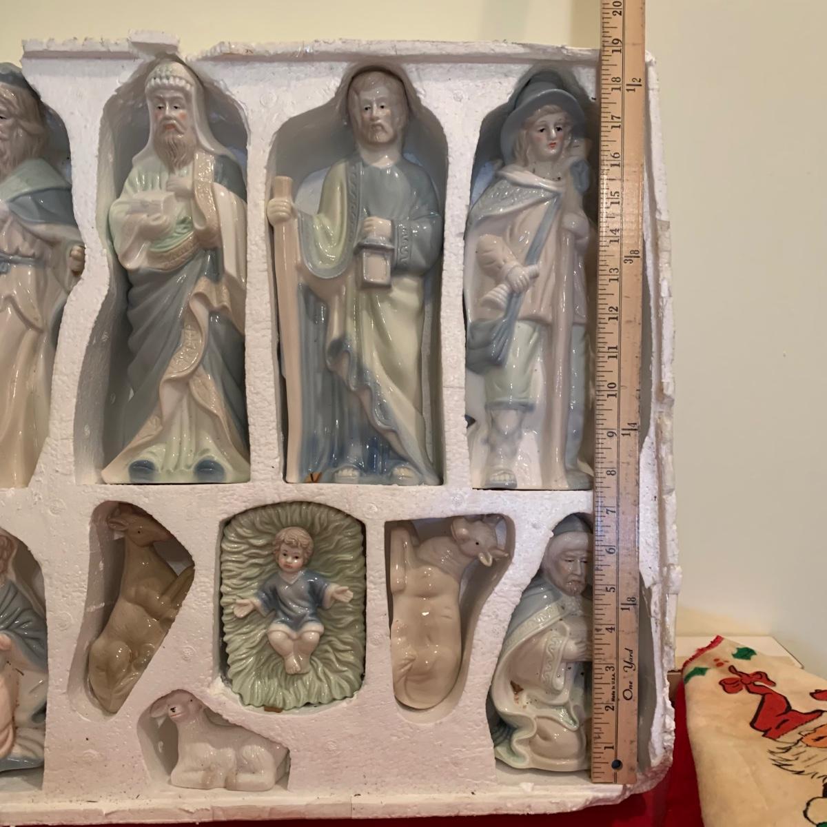 Lot 381: Vintage Christmas Collection: Hallmark, Annalee, Tree Skirt, Ceramic Santa, Santa Tray, New & Old Nativities and so much more