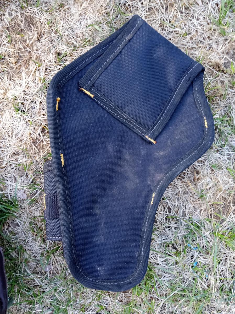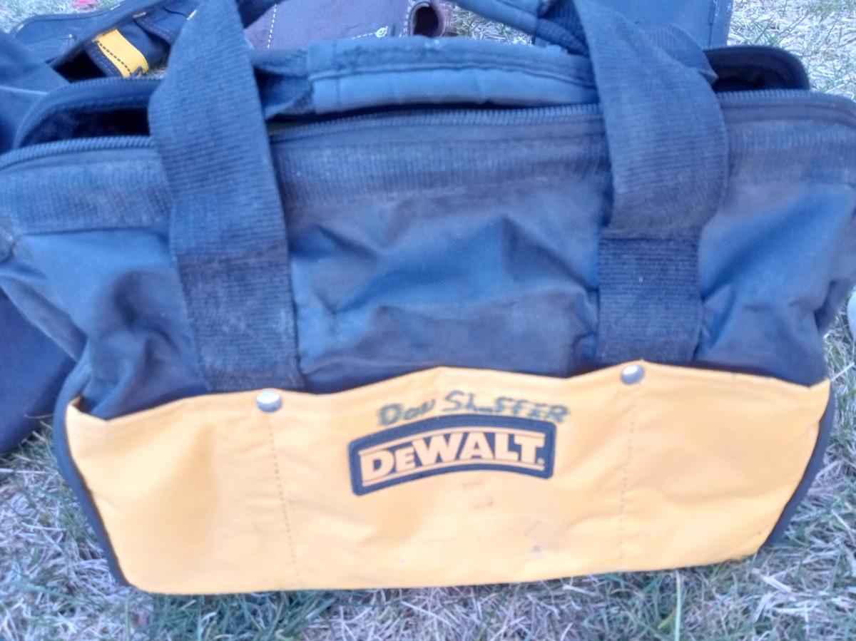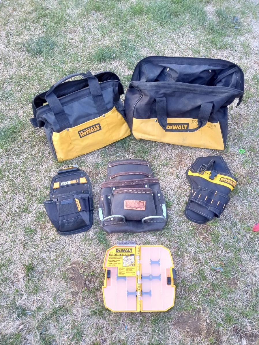 CRAFTSMAN LEATHER BELT TOOL POUCH, DRILL HOLSTER, 2 DEWALT TOOL BAGS WITH PO NAME WRITTEN ON THEM, DEWALT ORGANIZER