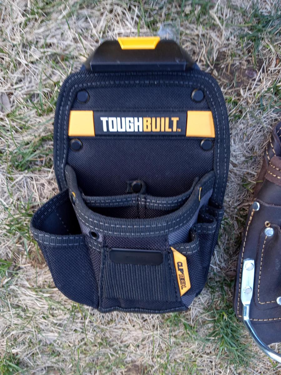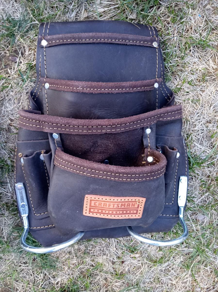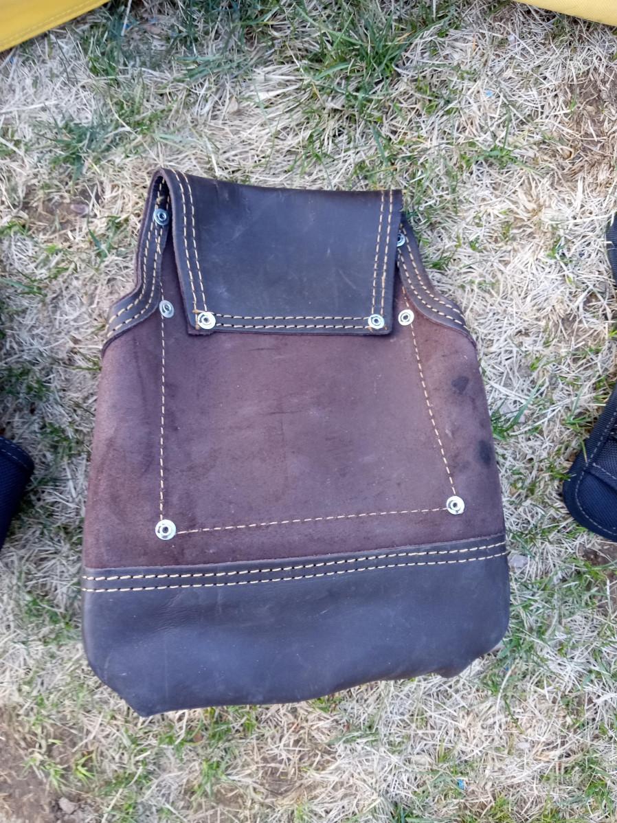 CRAFTSMAN LEATHER BELT TOOL POUCH, DRILL HOLSTER, 2 DEWALT TOOL BAGS WITH PO NAME WRITTEN ON THEM, DEWALT ORGANIZER