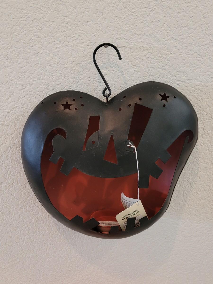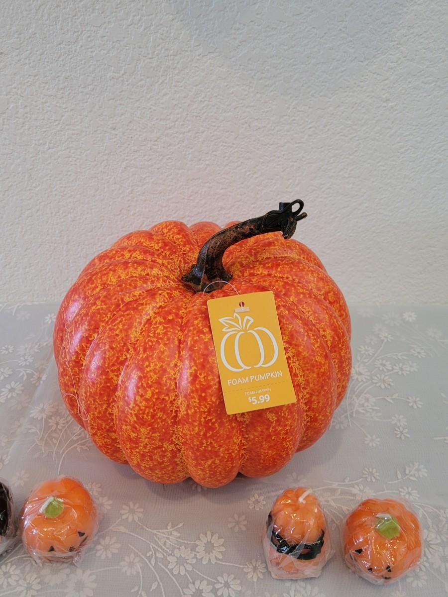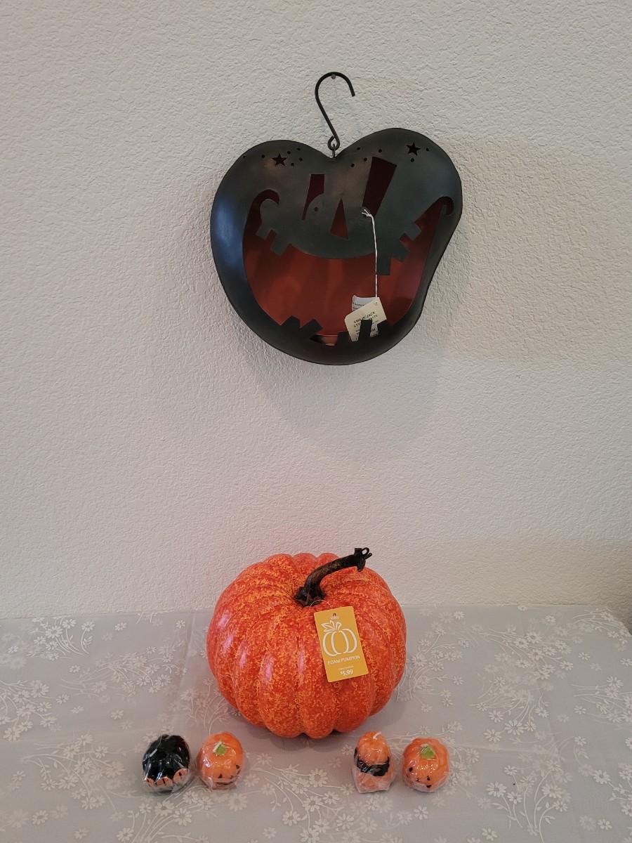Lot 382: Metal Hanging Luminary Pumpkin, Small Candles and Foam Pumpkin Deco
