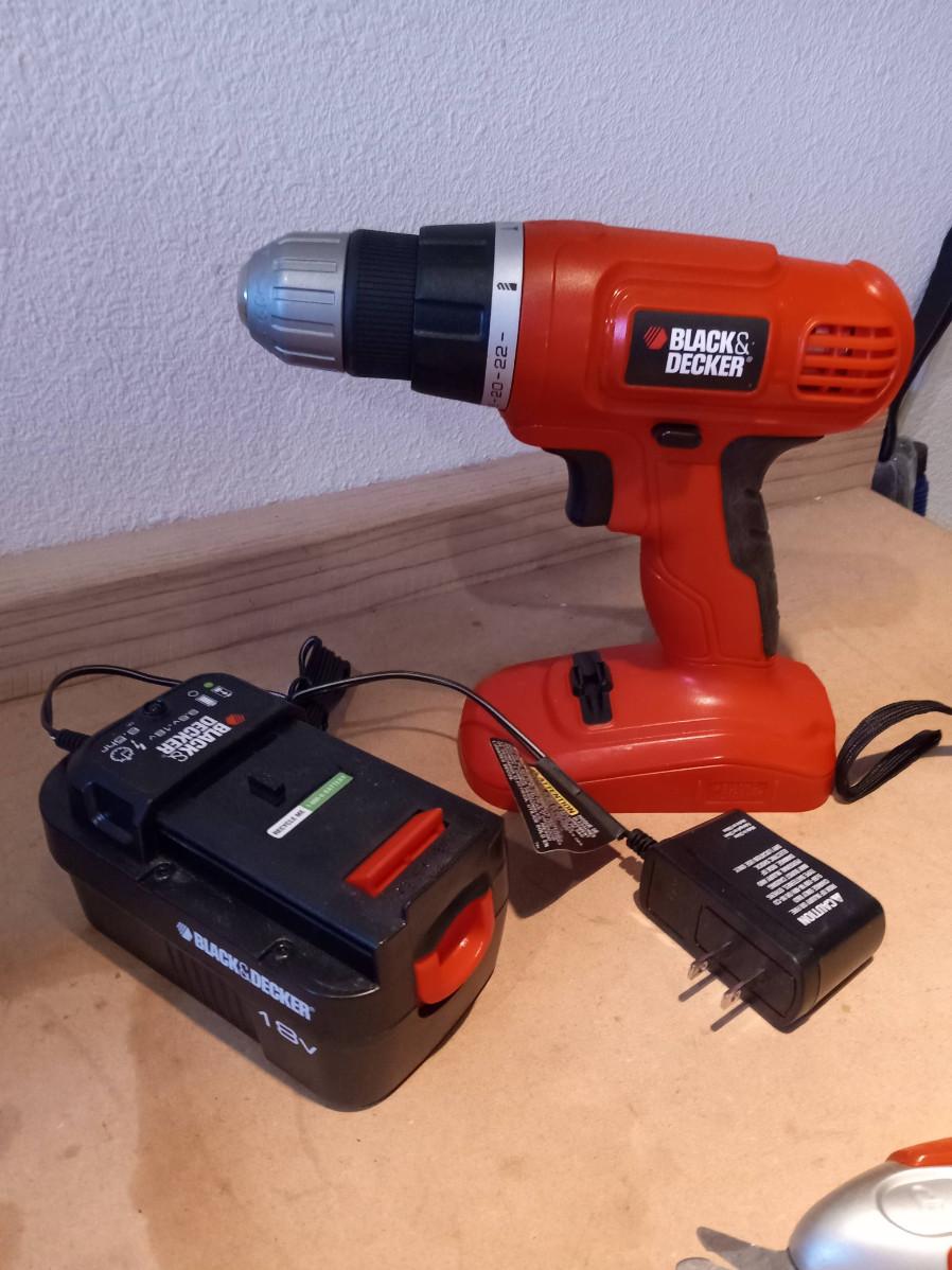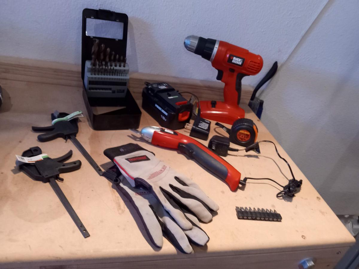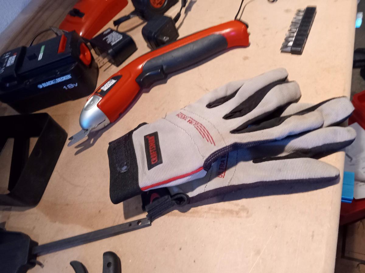 CORDLESS DRILL, BIT SET, CLAMPS, GLOVES AND RECHARGEABLE CUTTERS