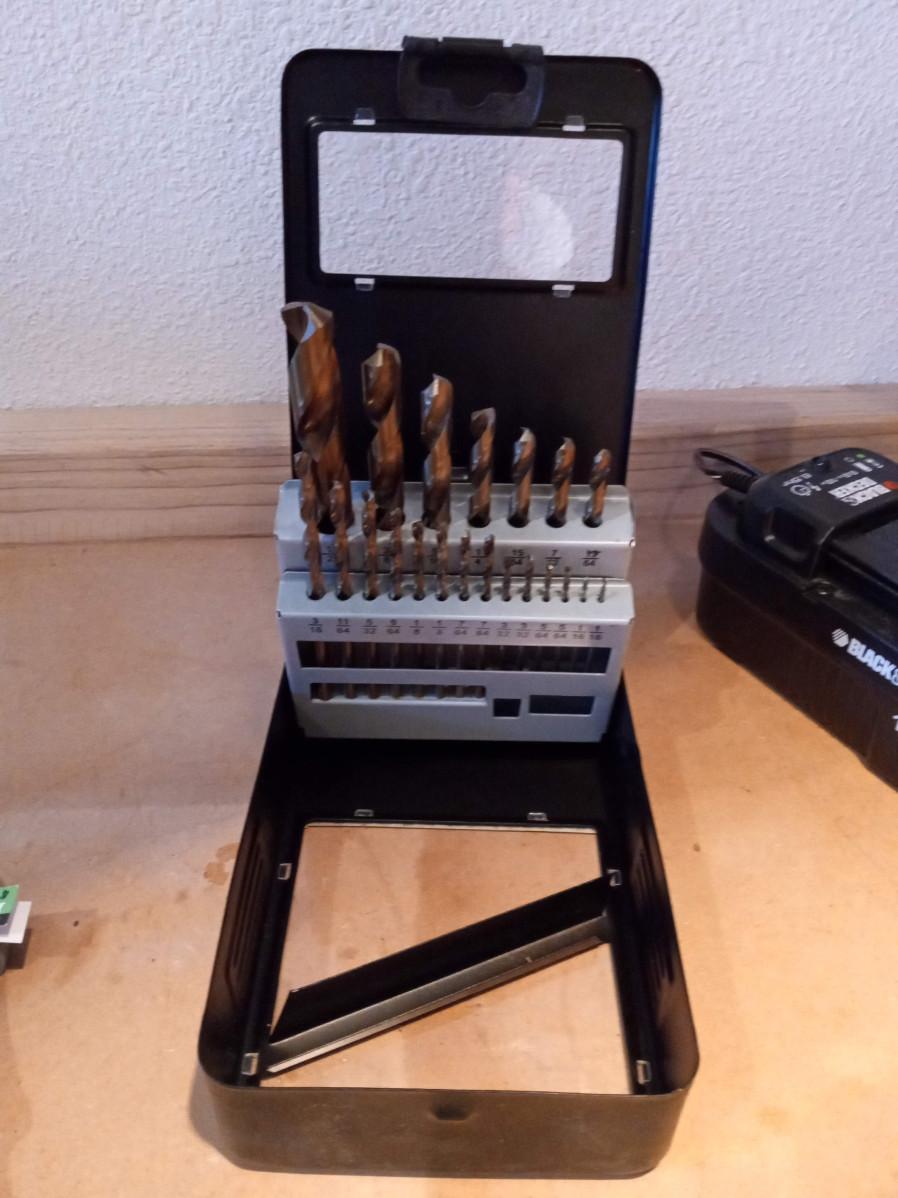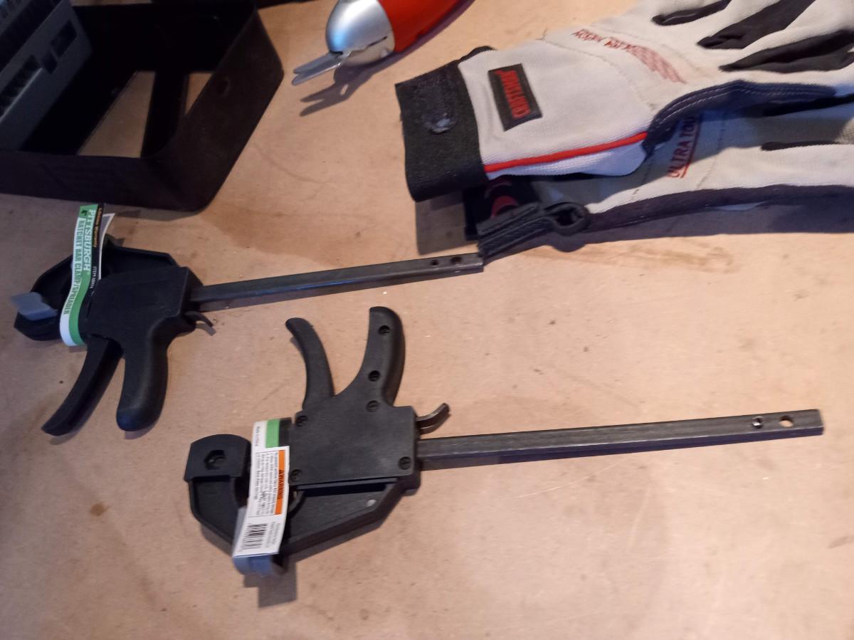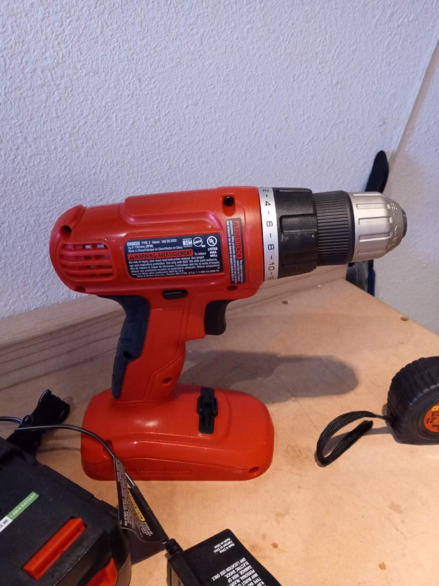 CORDLESS DRILL, BIT SET, CLAMPS, GLOVES AND RECHARGEABLE CUTTERS