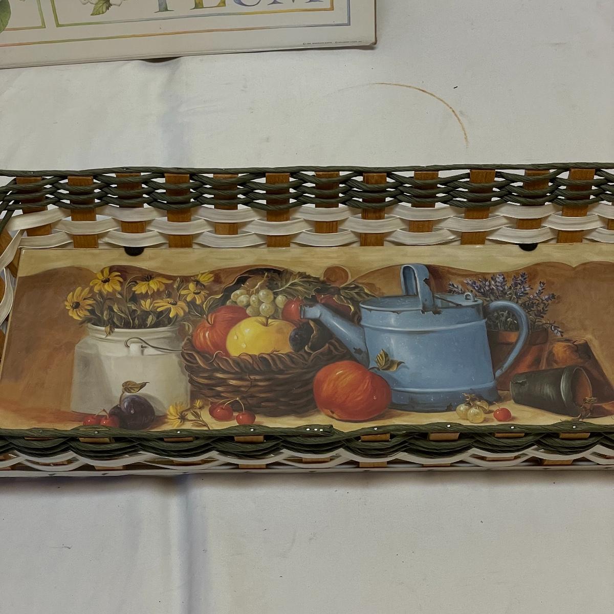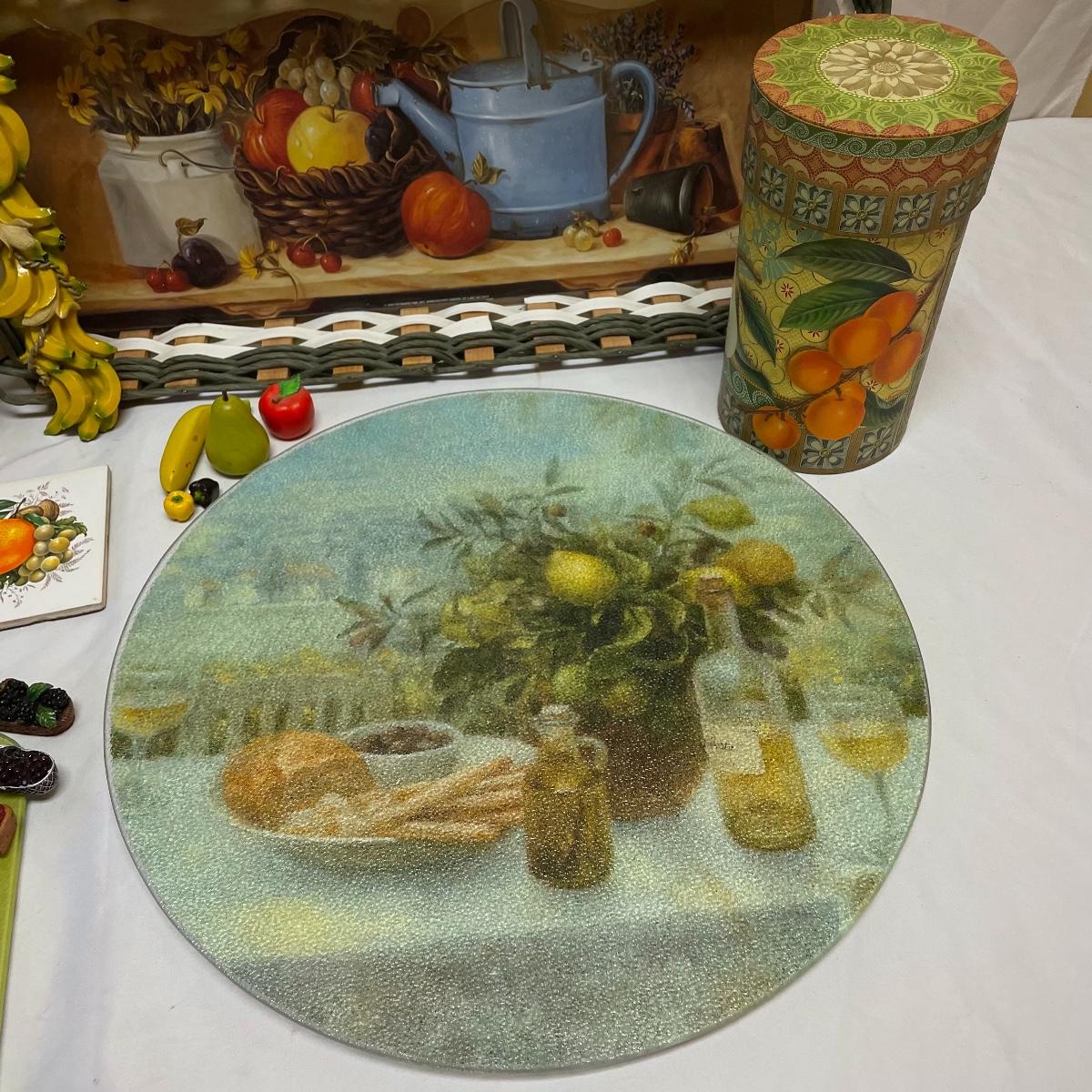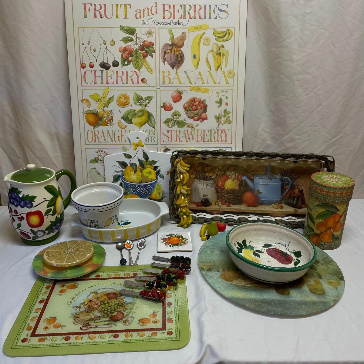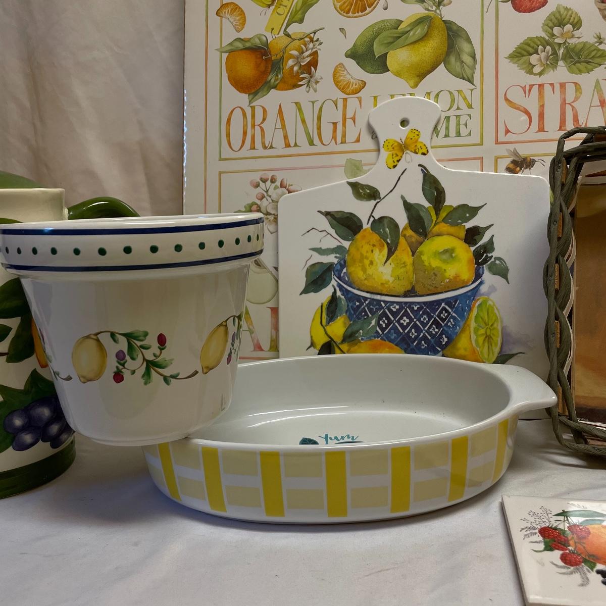 Look at this delicious collection for your home and kitchen! A Made-In-The USA decorative basket for your wall measuring 22” x 10” x 3” ; it has a farmhouse print behind a glass panel and it’s ready to hang! Lot also features a 16”d glass lazy Susan with a lovely lemon-olive scene transporting you straight to the vineyard. Lot also features a textured hand painted pitcher with lid, fruity spreaders set, a crazed hand painted bowl to brighten up your kitchen! Also- lemons galore! A 10” stoneware casserole dish, a decorative cutting board and planter. See images. Local pick up only.