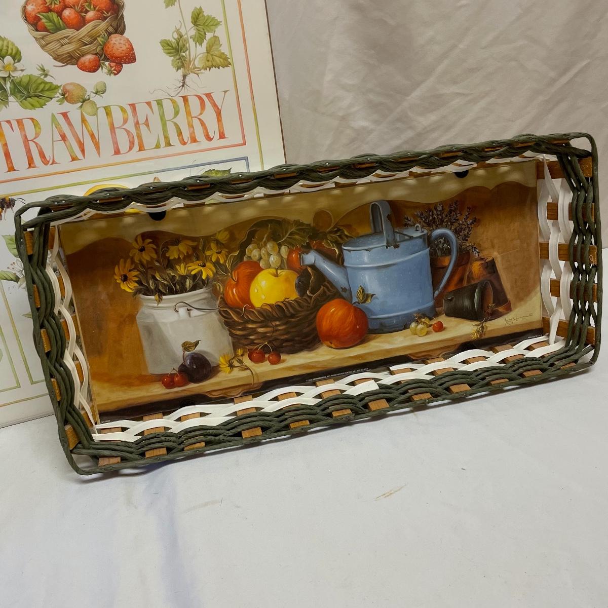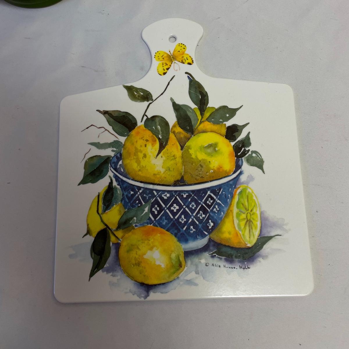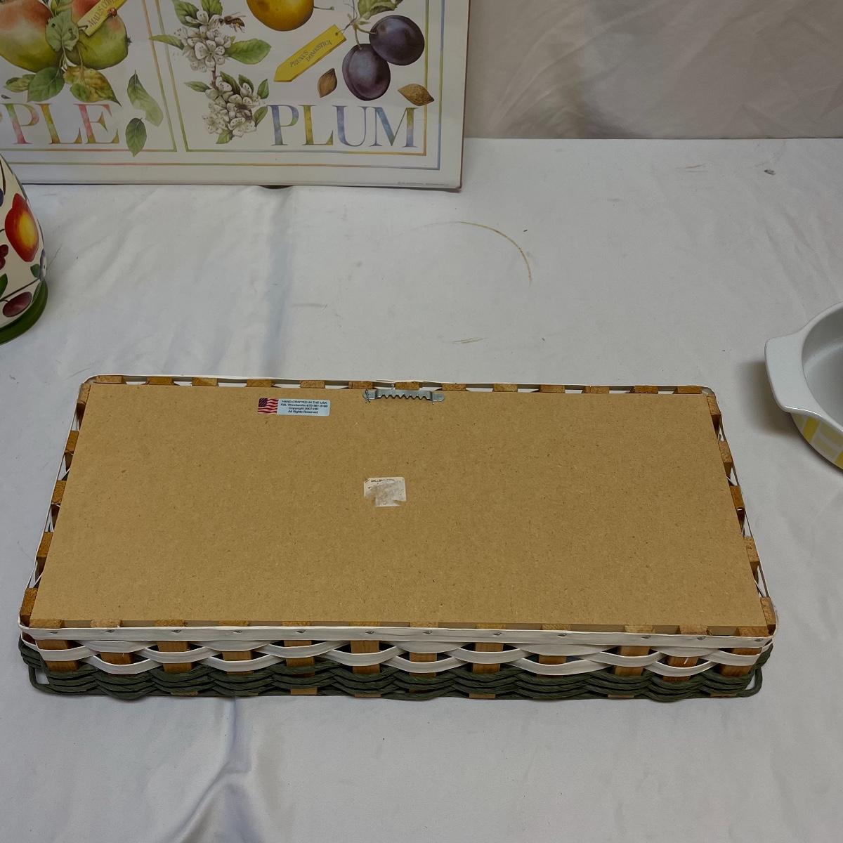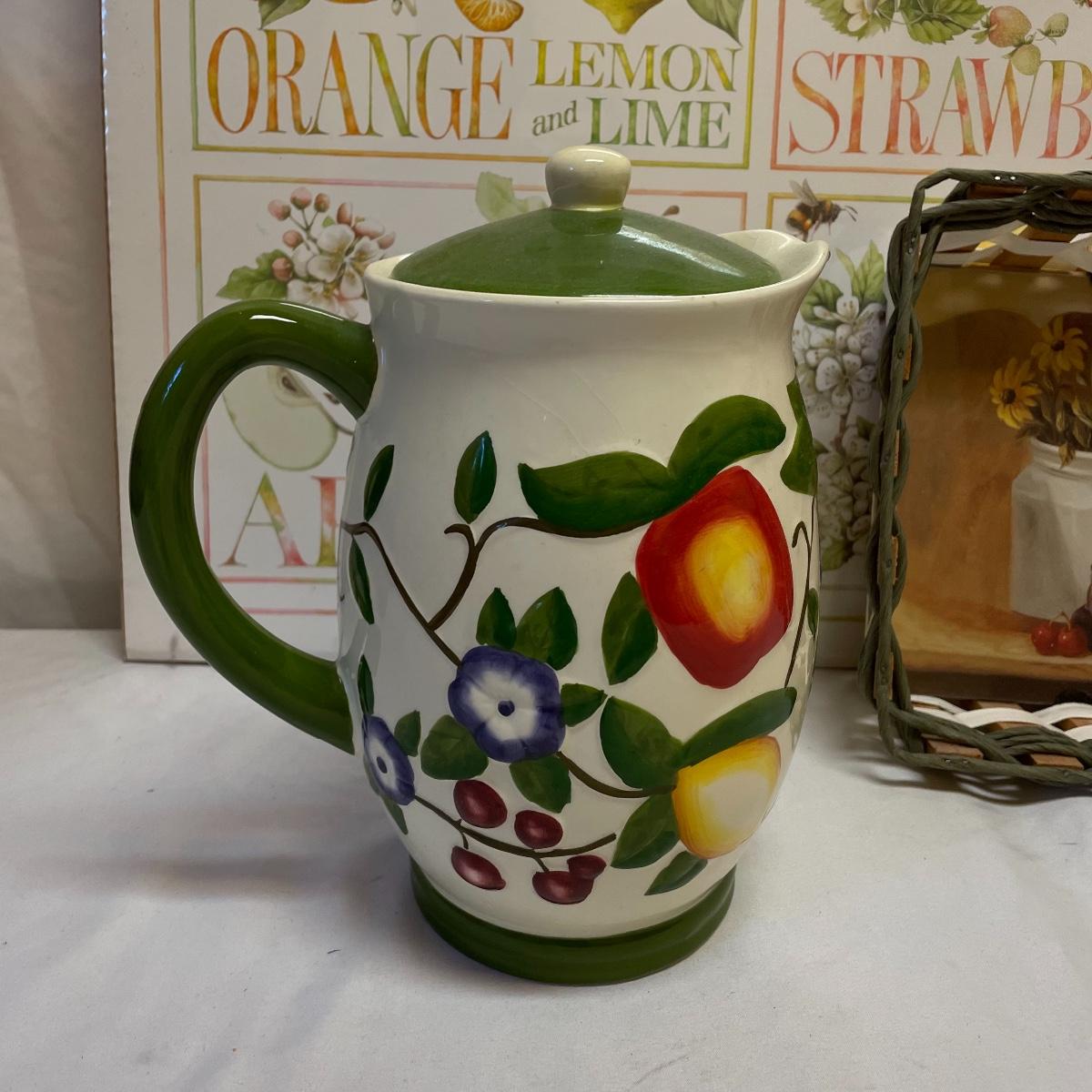 Look at this delicious collection for your home and kitchen! A Made-In-The USA decorative basket for your wall measuring 22” x 10” x 3” ; it has a farmhouse print behind a glass panel and it’s ready to hang! Lot also features a 16”d glass lazy Susan with a lovely lemon-olive scene transporting you straight to the vineyard. Lot also features a textured hand painted pitcher with lid, fruity spreaders set, a crazed hand painted bowl to brighten up your kitchen! Also- lemons galore! A 10” stoneware casserole dish, a decorative cutting board and planter. See images. Local pick up only.