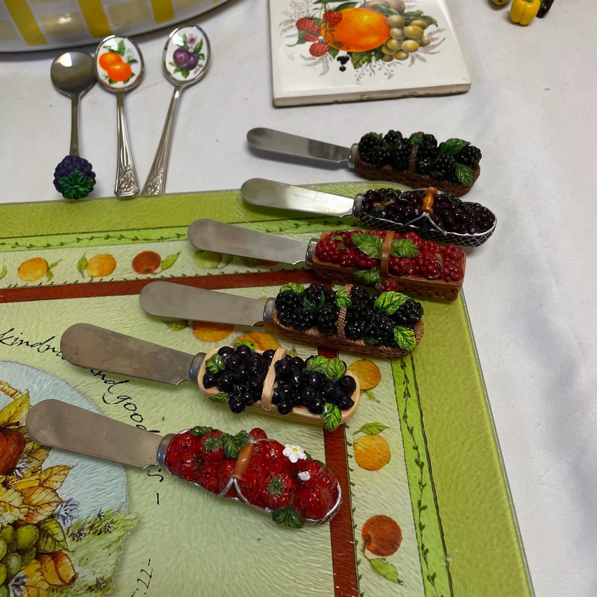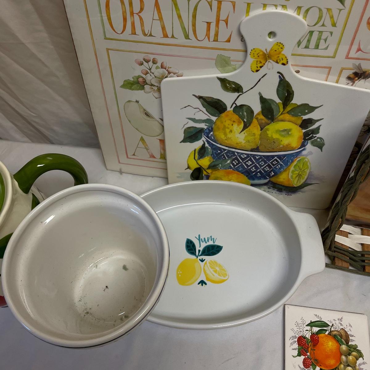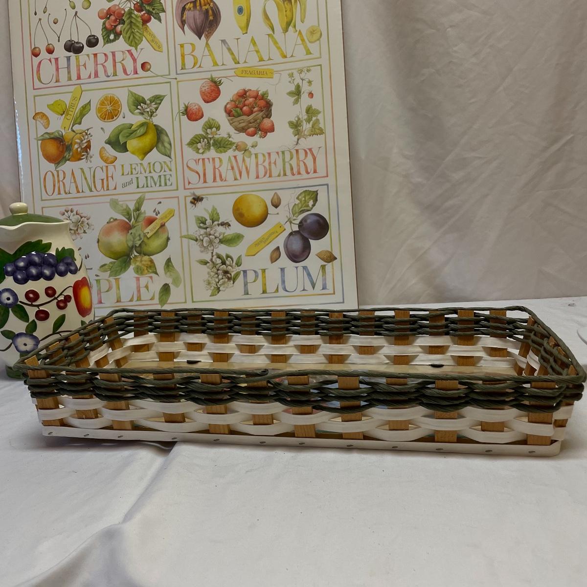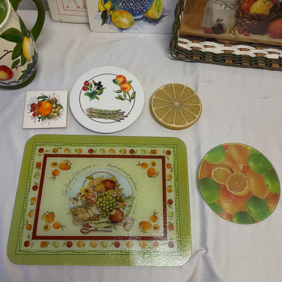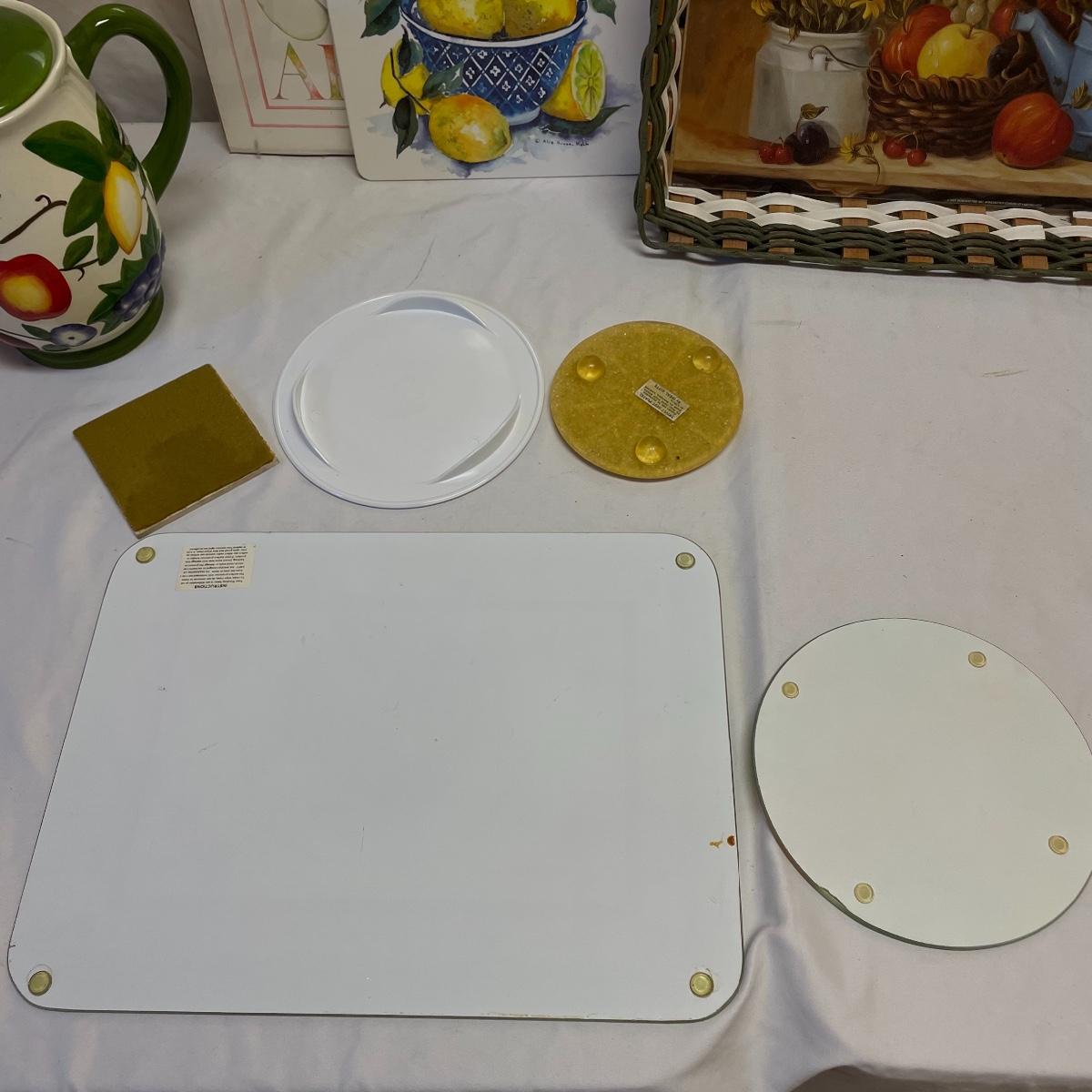 Look at this delicious collection for your home and kitchen! A Made-In-The USA decorative basket for your wall measuring 22” x 10” x 3” ; it has a farmhouse print behind a glass panel and it’s ready to hang! Lot also features a 16”d glass lazy Susan with a lovely lemon-olive scene transporting you straight to the vineyard. Lot also features a textured hand painted pitcher with lid, fruity spreaders set, a crazed hand painted bowl to brighten up your kitchen! Also- lemons galore! A 10” stoneware casserole dish, a decorative cutting board and planter. See images. Local pick up only.