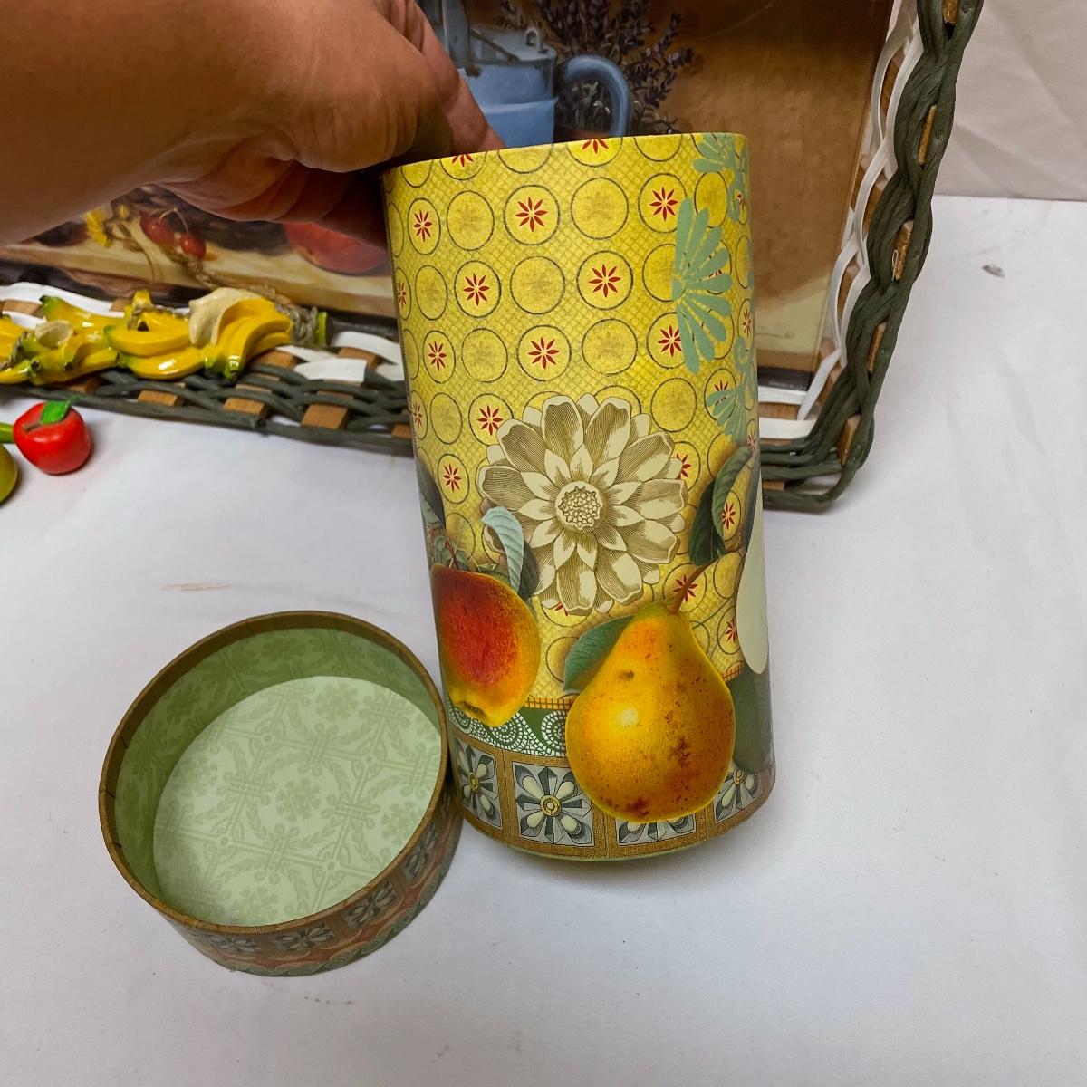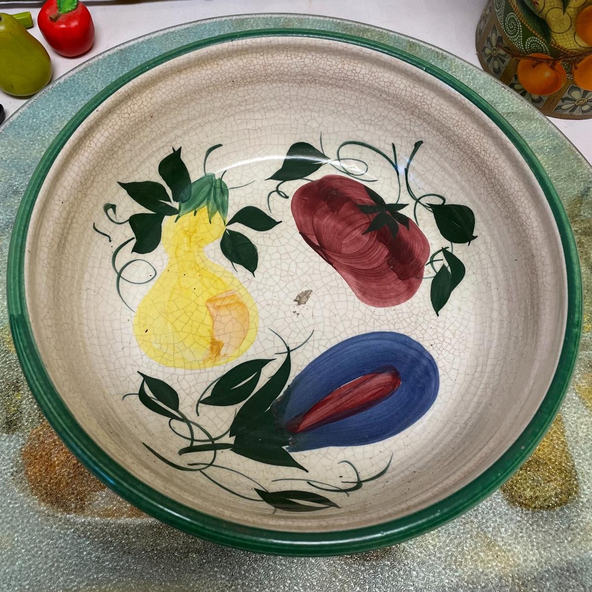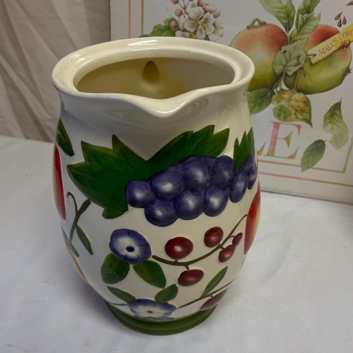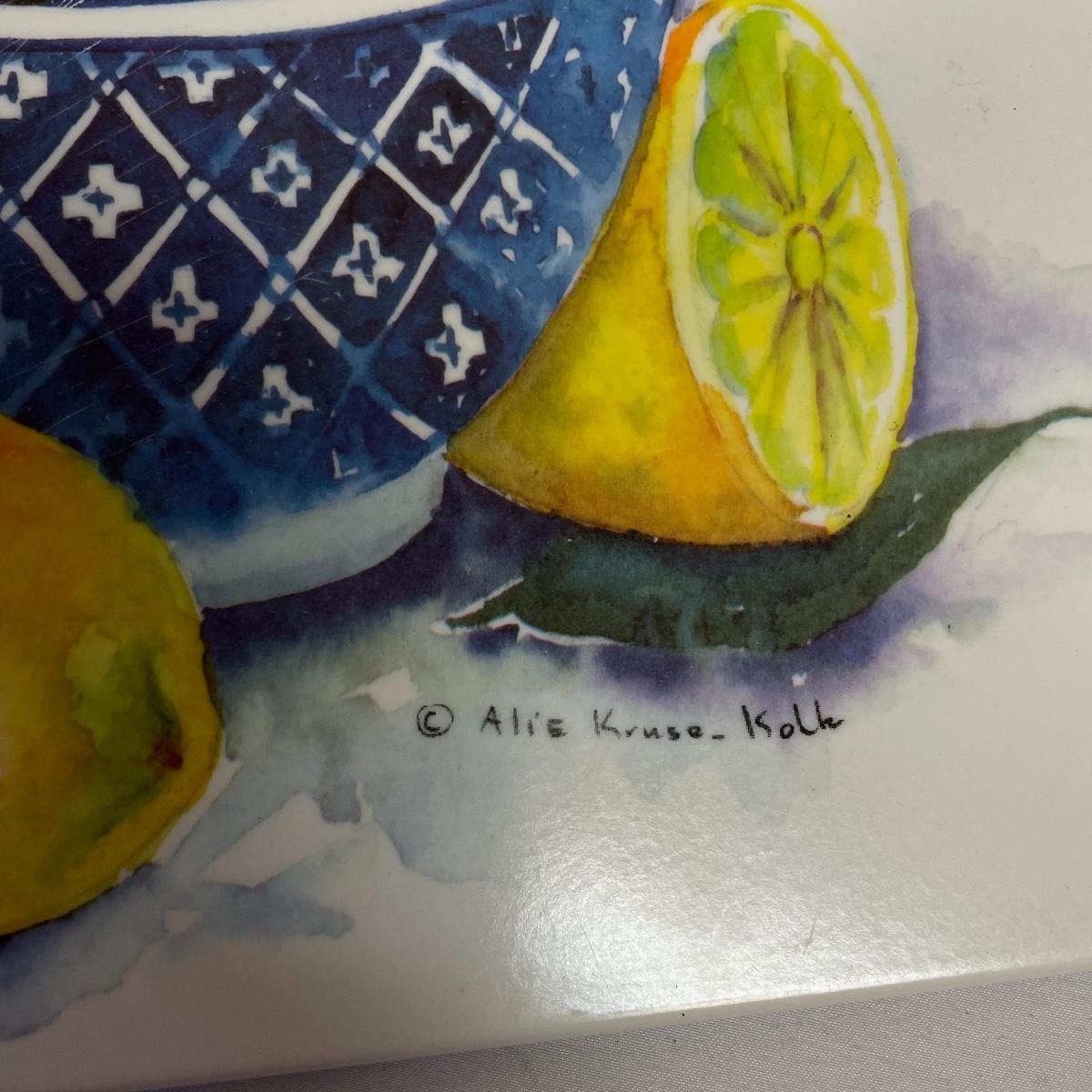 Look at this delicious collection for your home and kitchen! A Made-In-The USA decorative basket for your wall measuring 22” x 10” x 3” ; it has a farmhouse print behind a glass panel and it’s ready to hang! Lot also features a 16”d glass lazy Susan with a lovely lemon-olive scene transporting you straight to the vineyard. Lot also features a textured hand painted pitcher with lid, fruity spreaders set, a crazed hand painted bowl to brighten up your kitchen! Also- lemons galore! A 10” stoneware casserole dish, a decorative cutting board and planter. See images. Local pick up only.