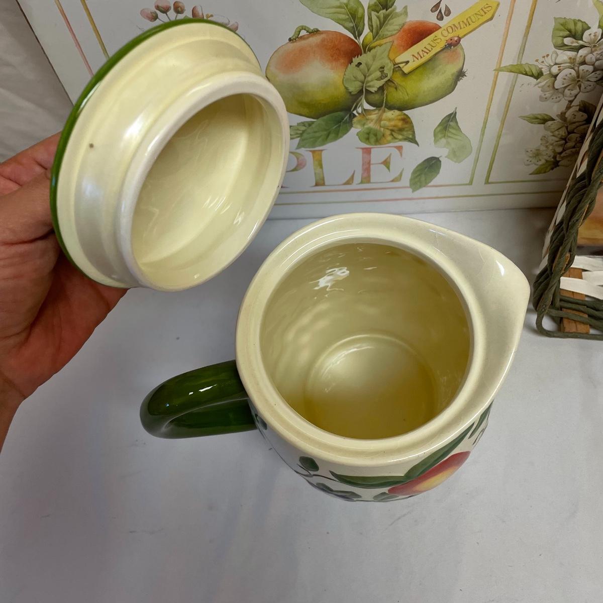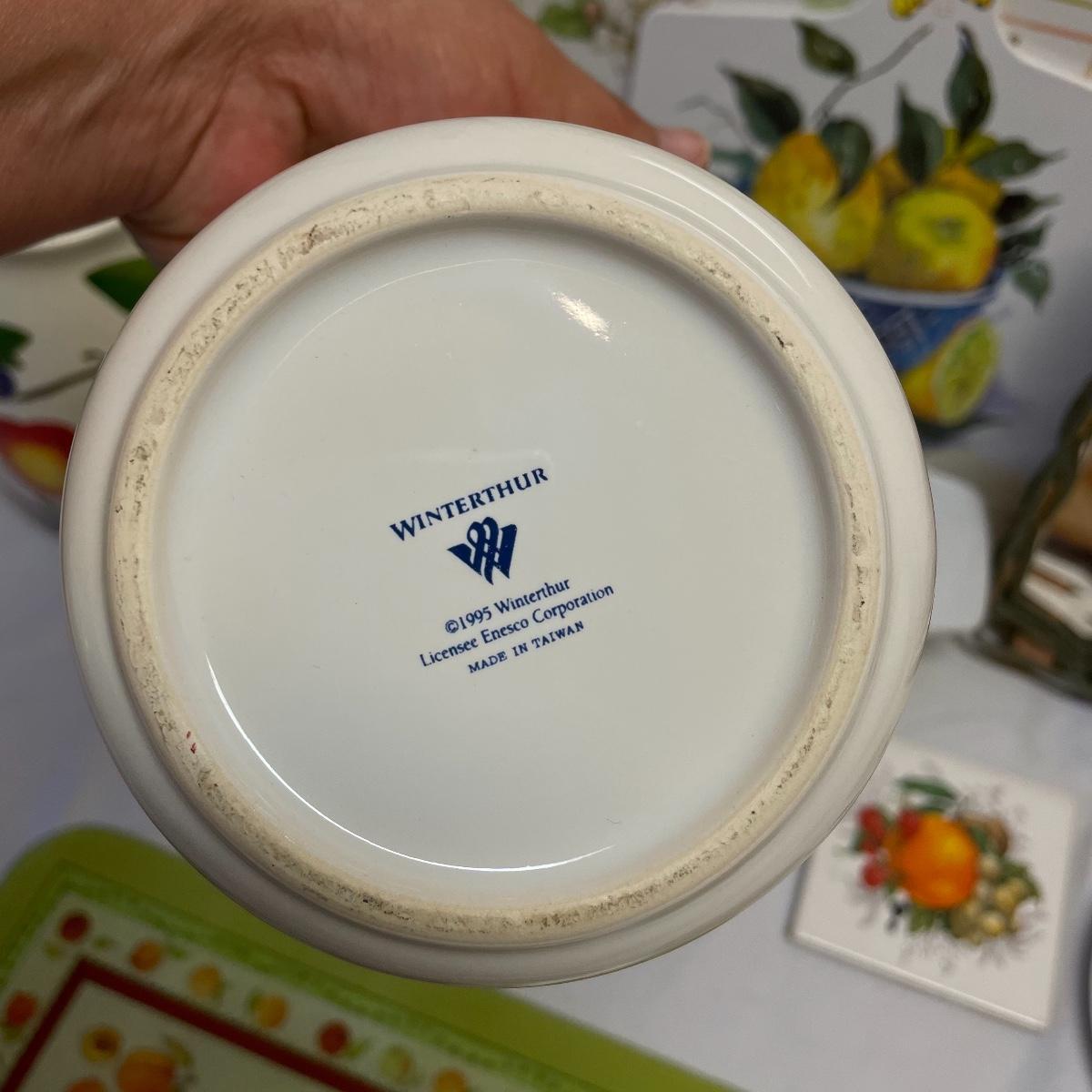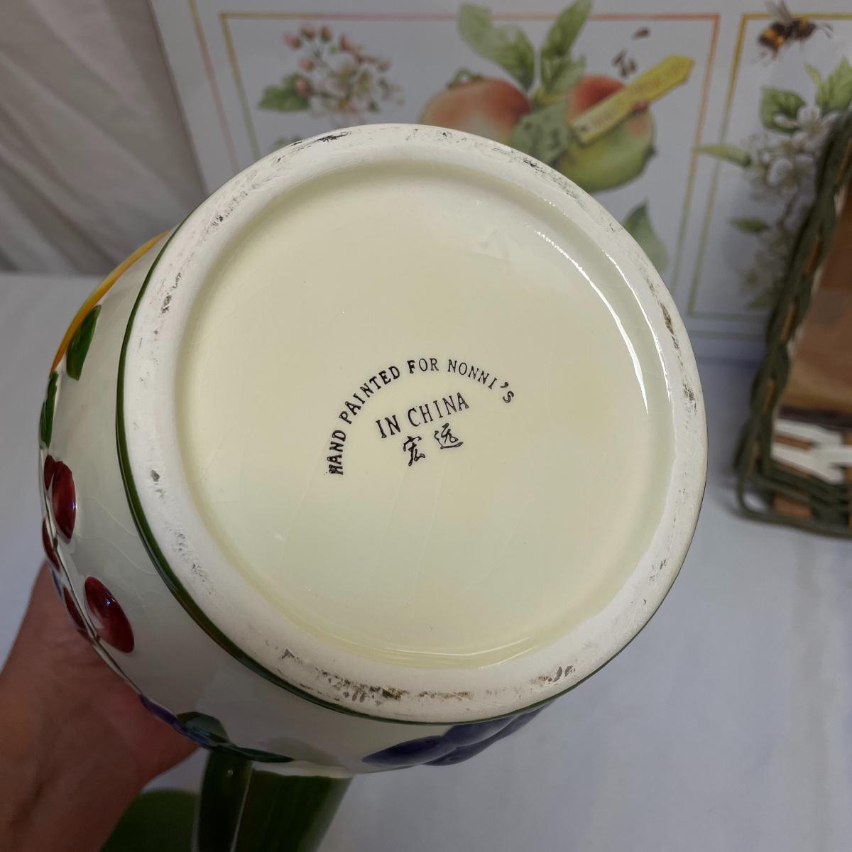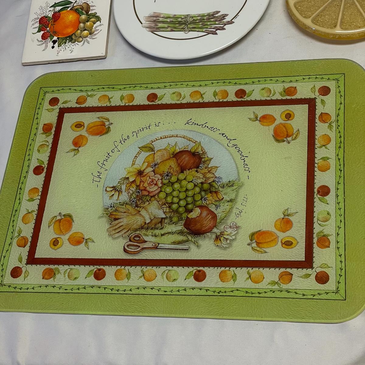 Look at this delicious collection for your home and kitchen! A Made-In-The USA decorative basket for your wall measuring 22” x 10” x 3” ; it has a farmhouse print behind a glass panel and it’s ready to hang! Lot also features a 16”d glass lazy Susan with a lovely lemon-olive scene transporting you straight to the vineyard. Lot also features a textured hand painted pitcher with lid, fruity spreaders set, a crazed hand painted bowl to brighten up your kitchen! Also- lemons galore! A 10” stoneware casserole dish, a decorative cutting board and planter. See images. Local pick up only.