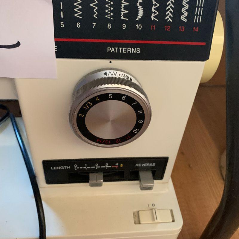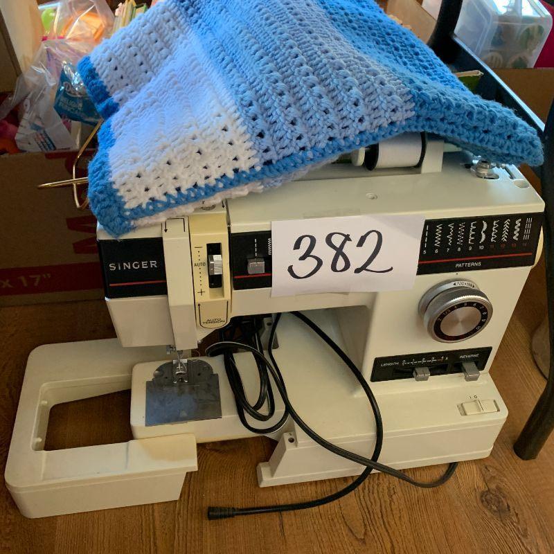 LOT 382 SEWING MACHINE AND CROCHETED BAG