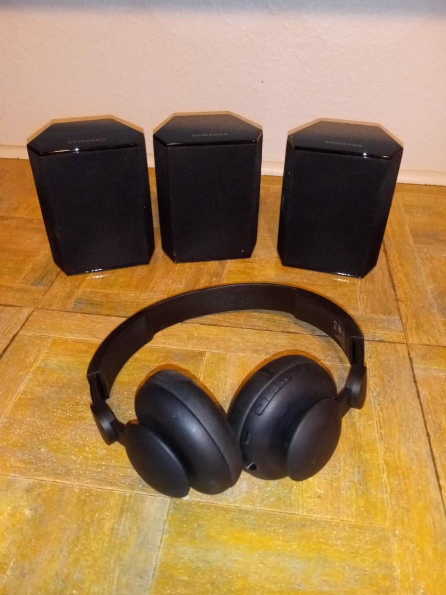 LOT 383 SAMSUNG SURROUND SPEAKER SYSTEM AND ONN WIRELESS HEADPHONES