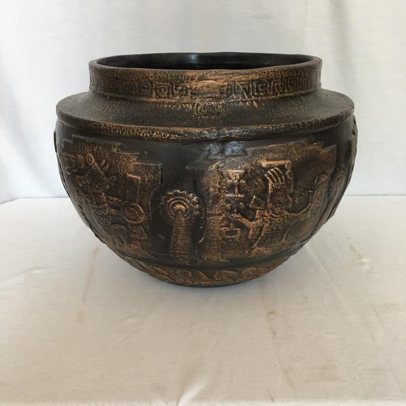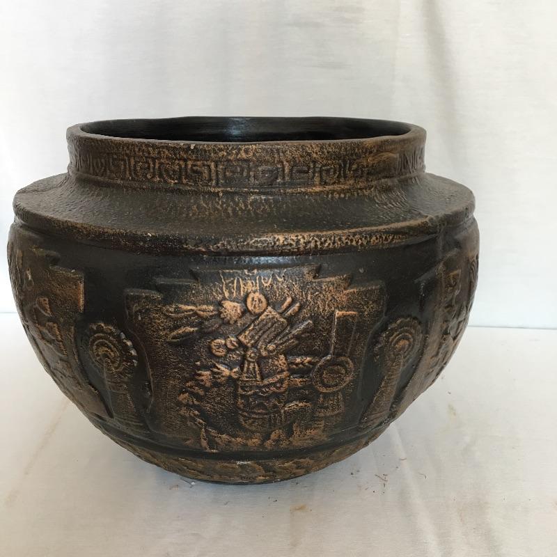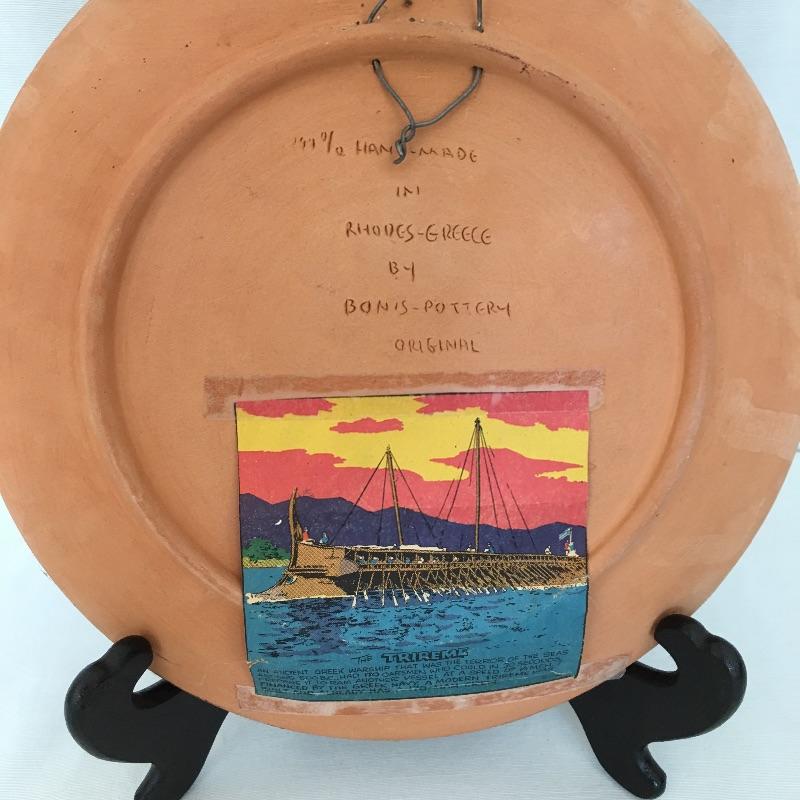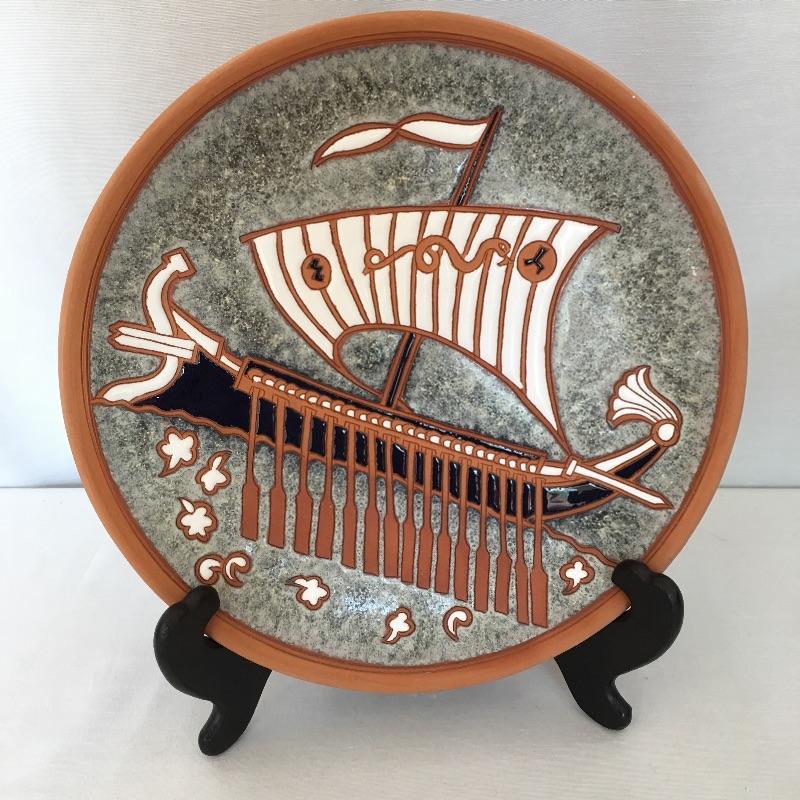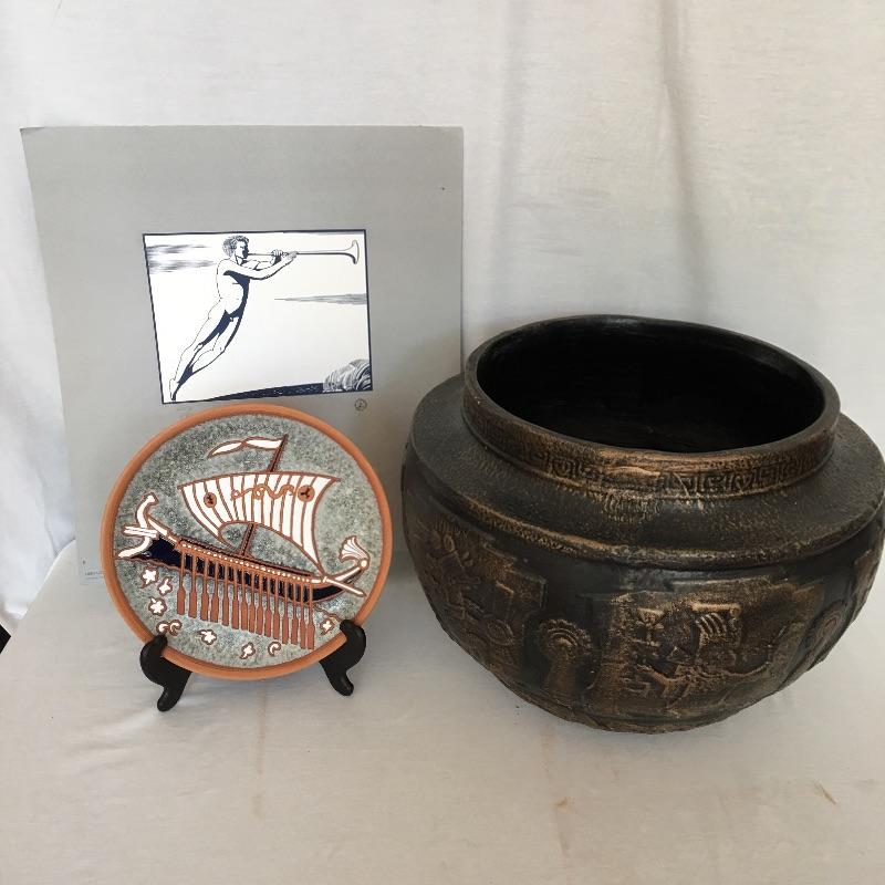 Large glazed terra cotta planter and handmade Greek plate inspired by the Greek warships and a Greek inspired numbered print from Heritage Club. Planter measures 16”D and 13” tall.