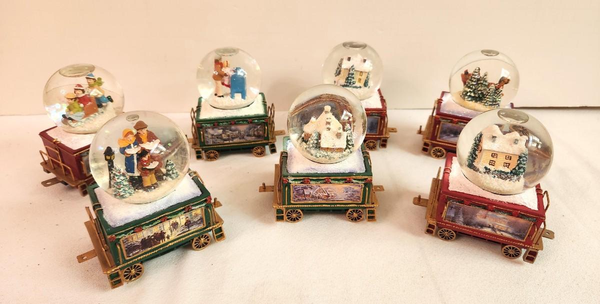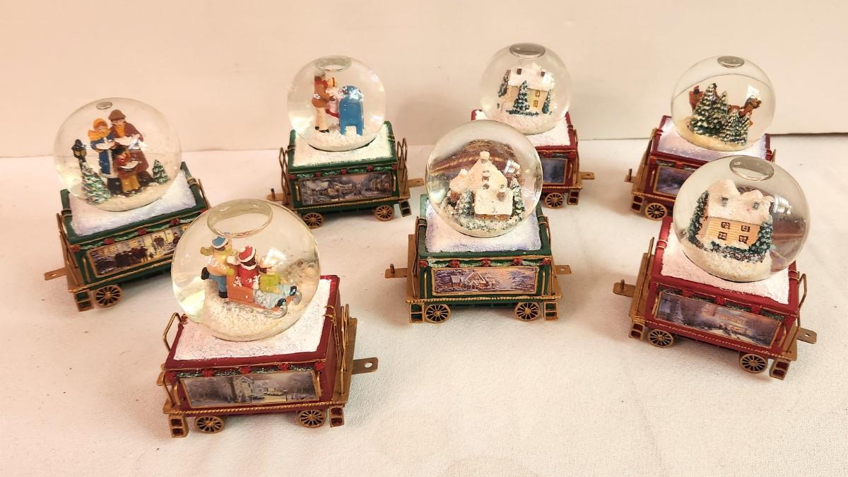 Note - these are as found, no engine included. This was a limited edition of snow globe "Wonderland Express" train cars - each is numbered. You get 7 different cars here. This was retired some years ago, so I am sure that an engine could be found on ebay, etc. Would still look very cute displayed on a mantle.