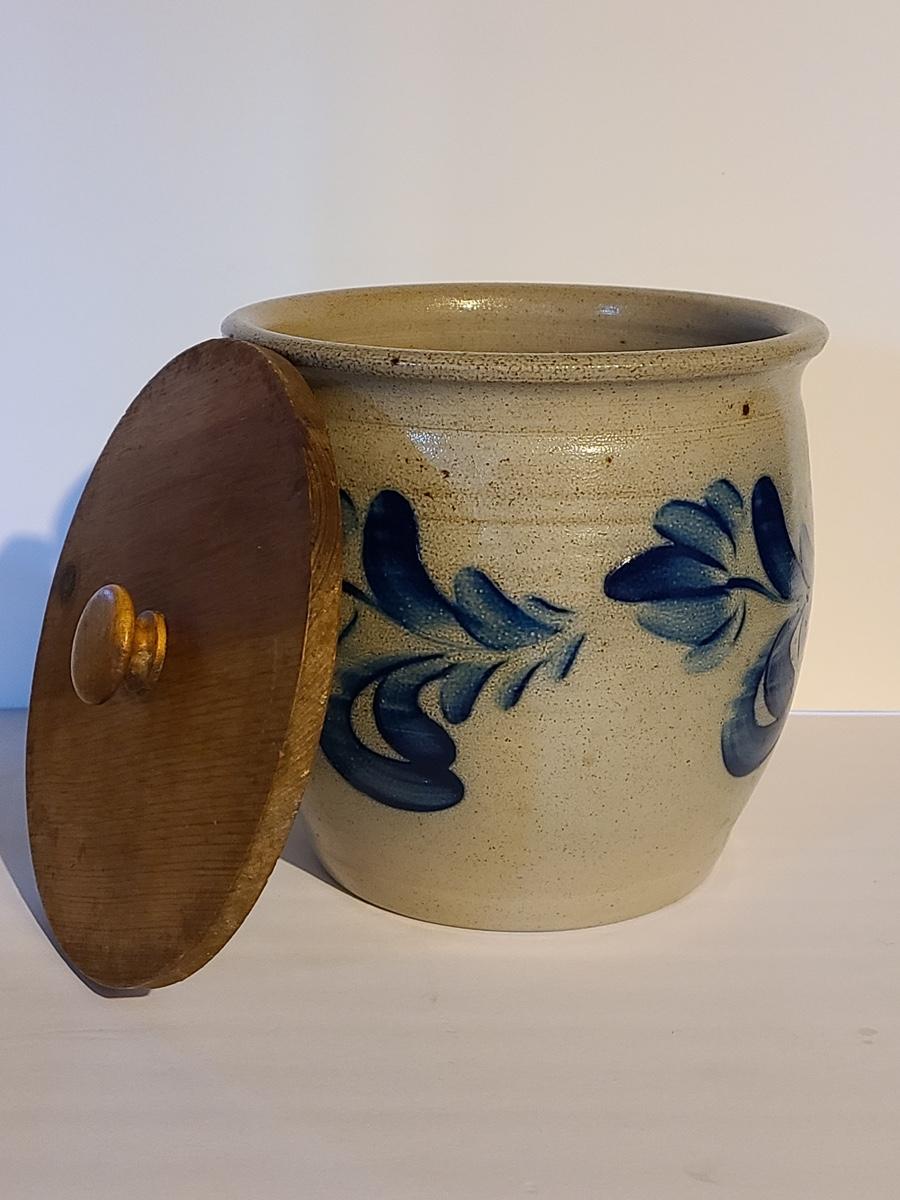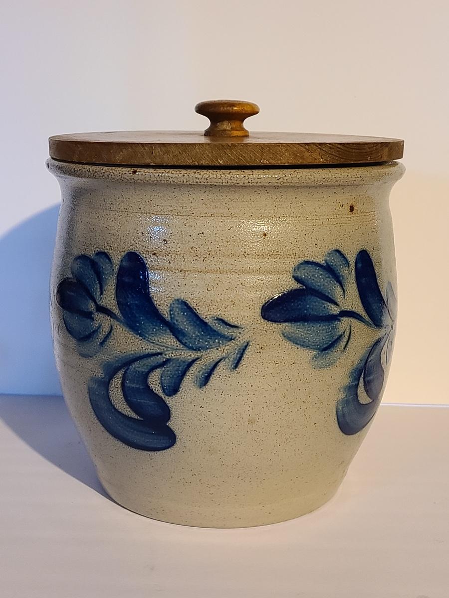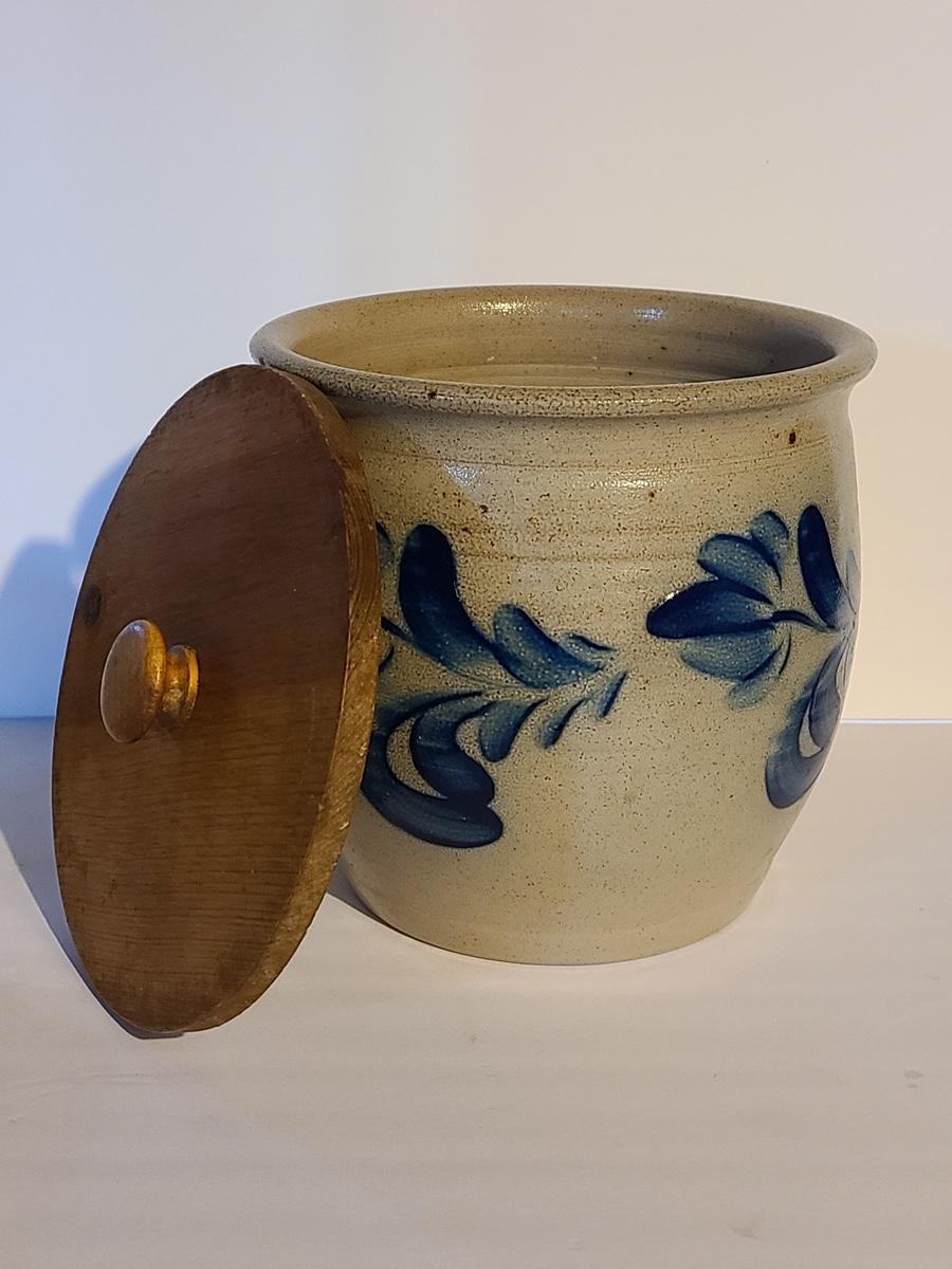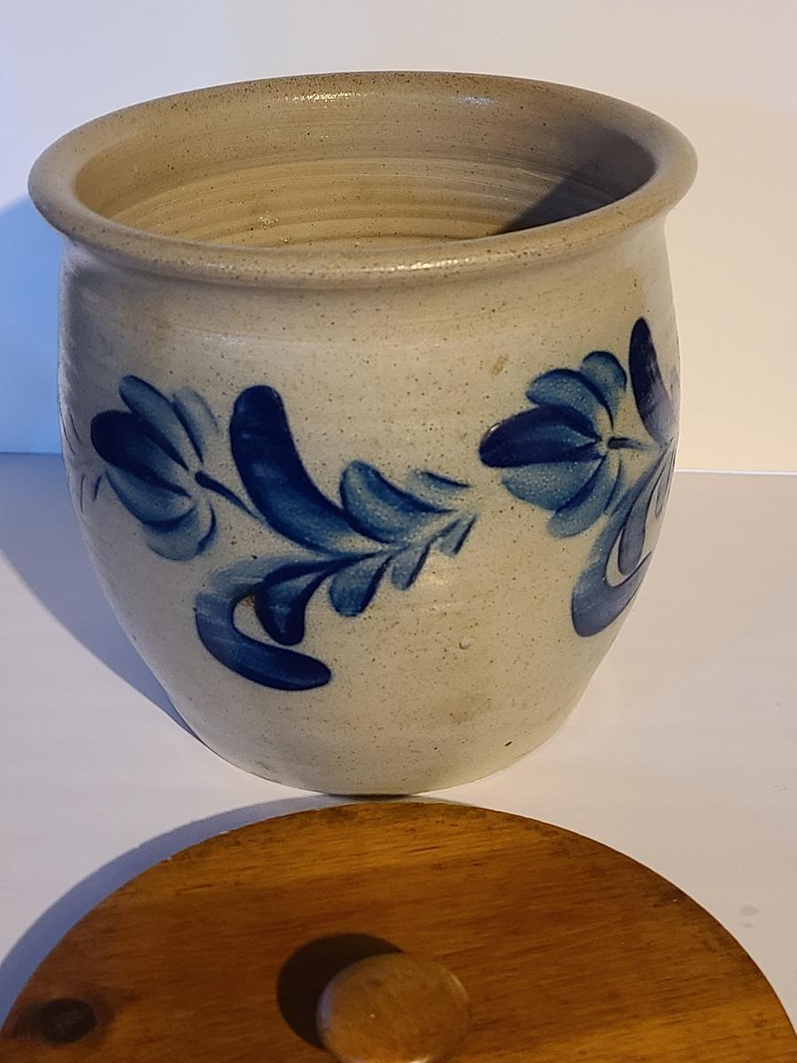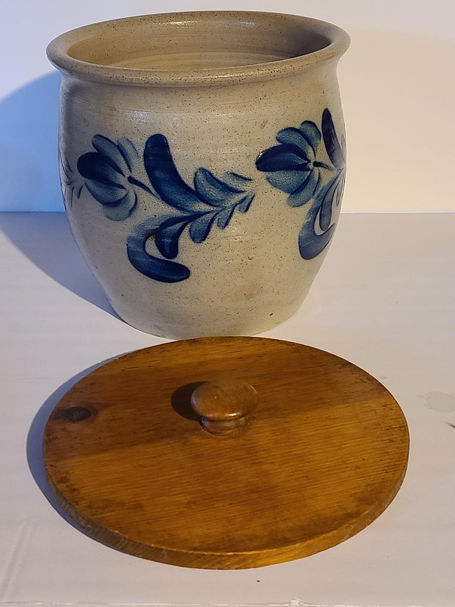 Lot 383: Salt Glaze Cobalt Blue Embellished Eldreth Pottery Crock with Wood Lid