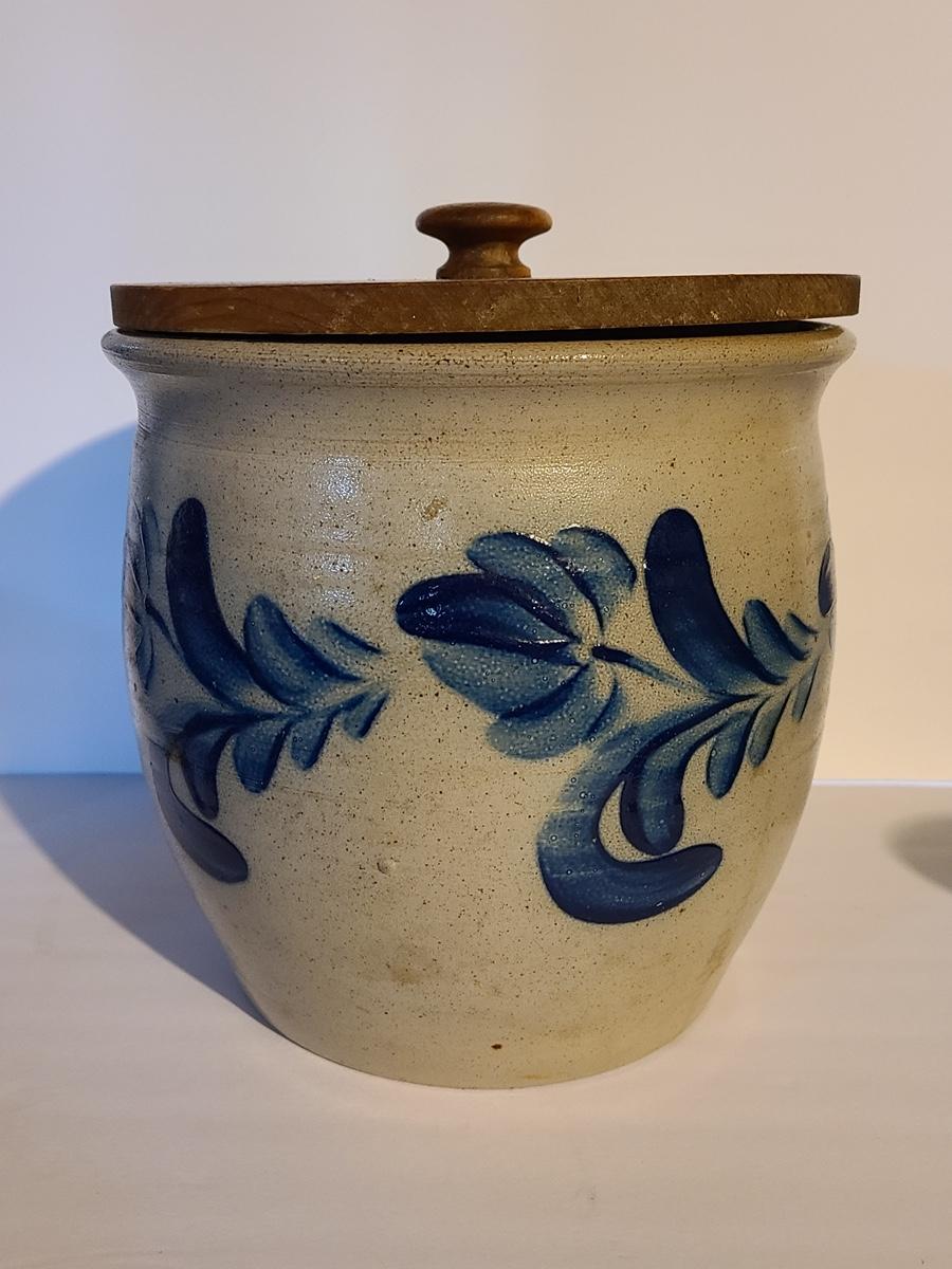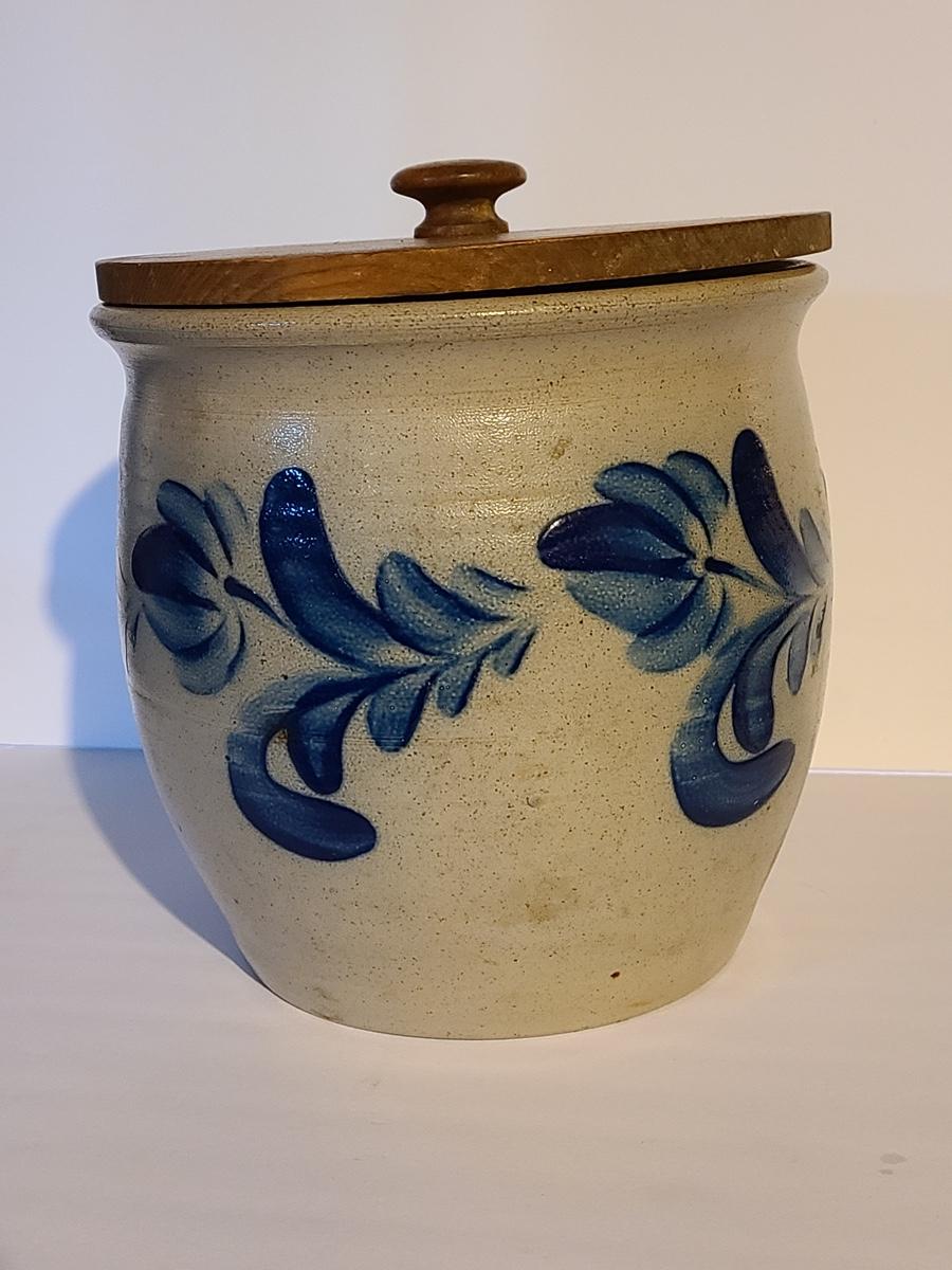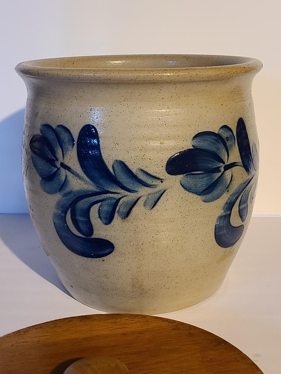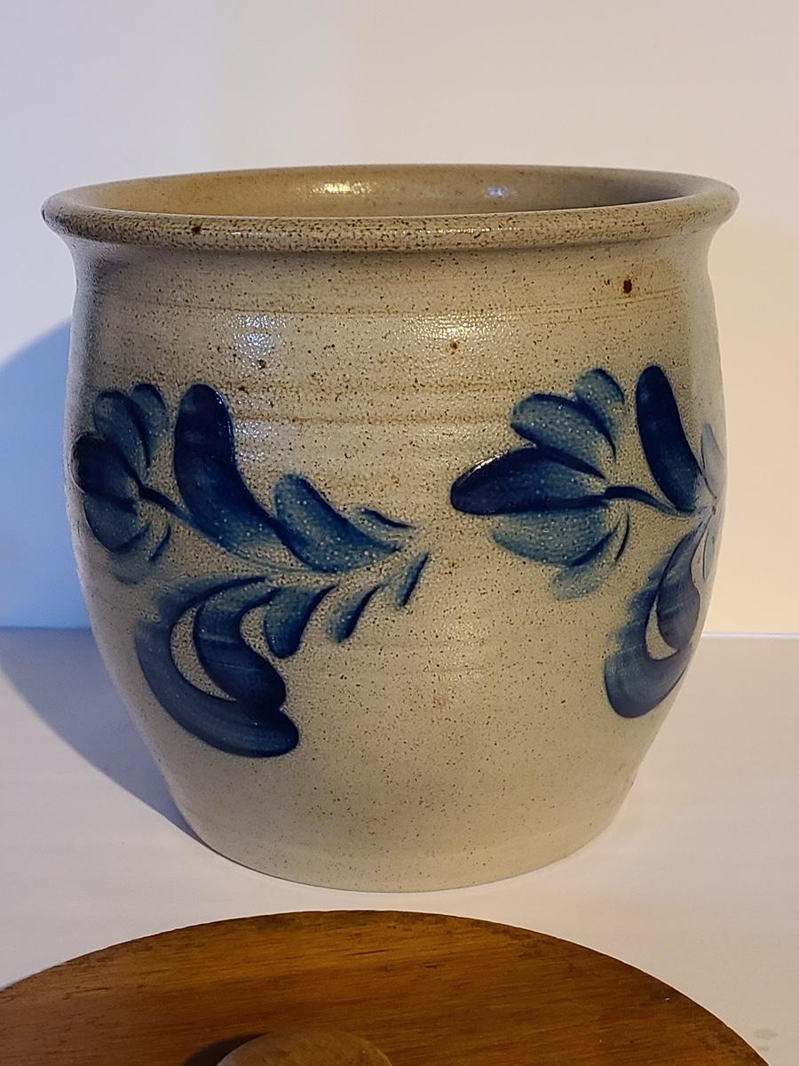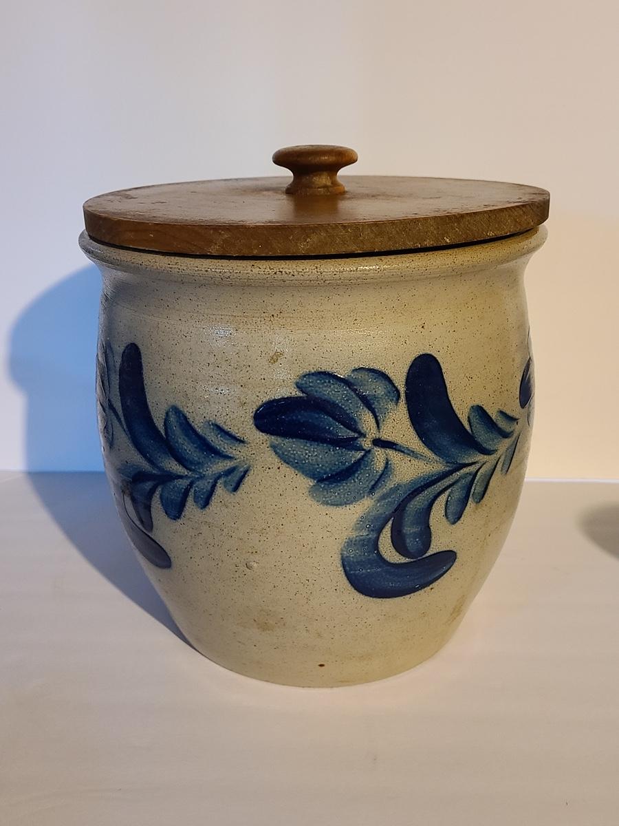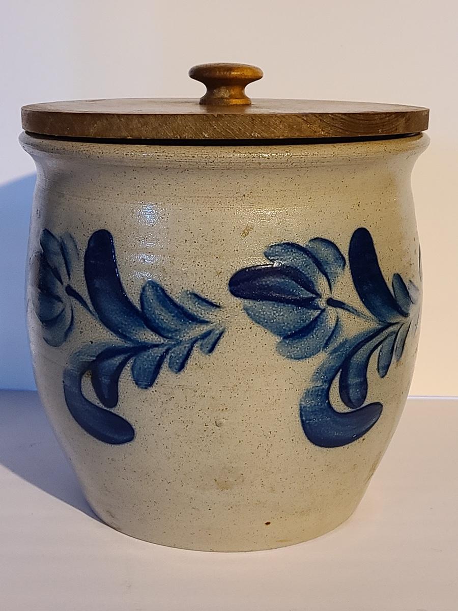 Lot 383: Salt Glaze Cobalt Blue Embellished Eldreth Pottery Crock with Wood Lid