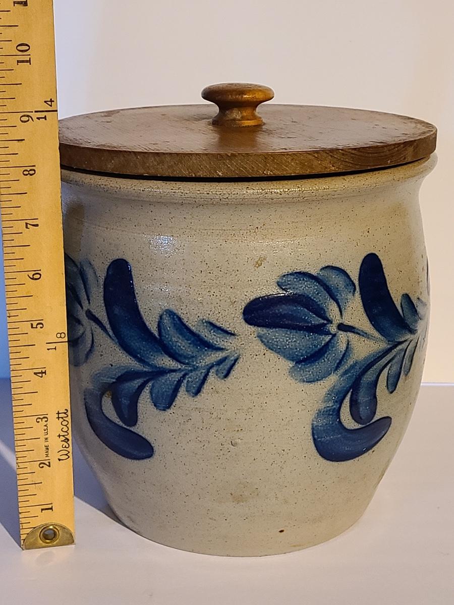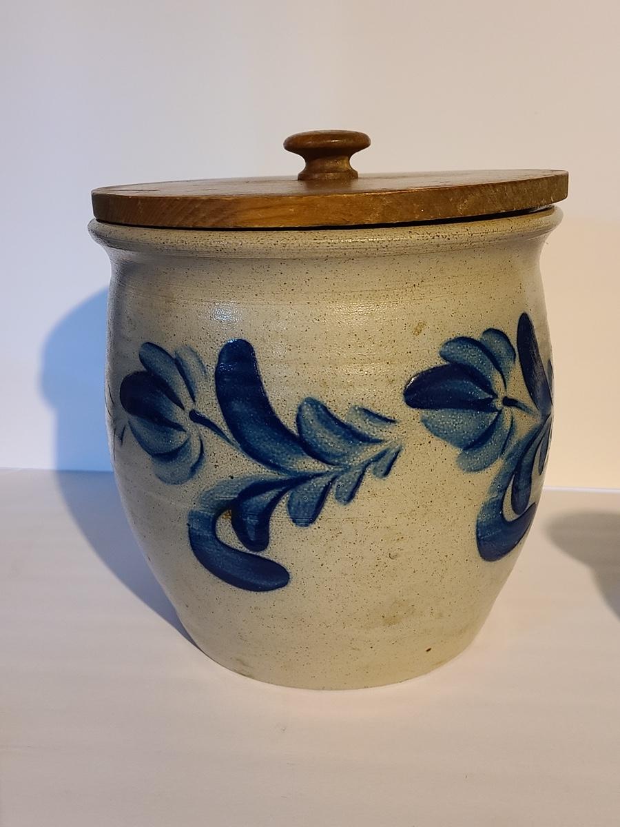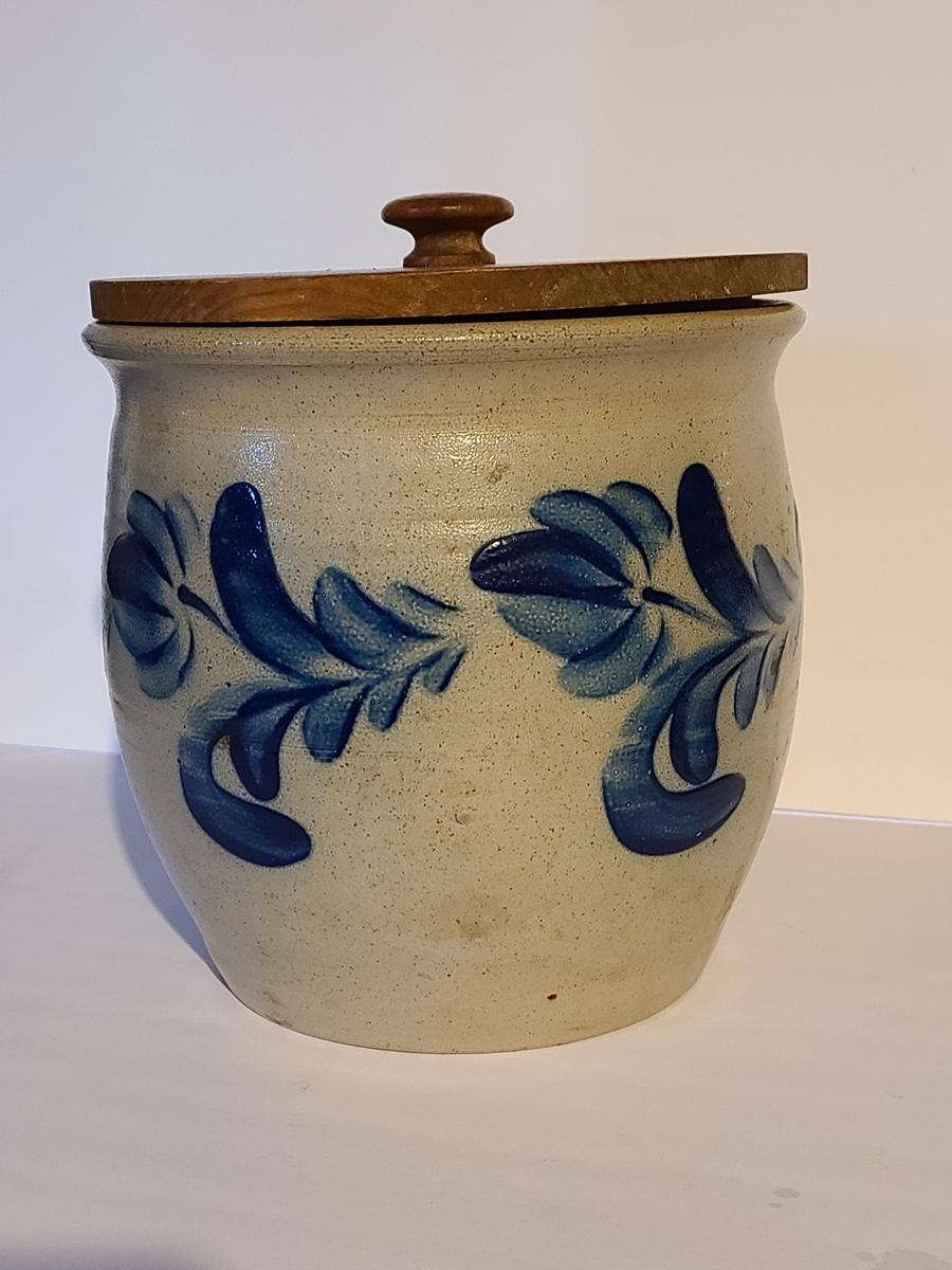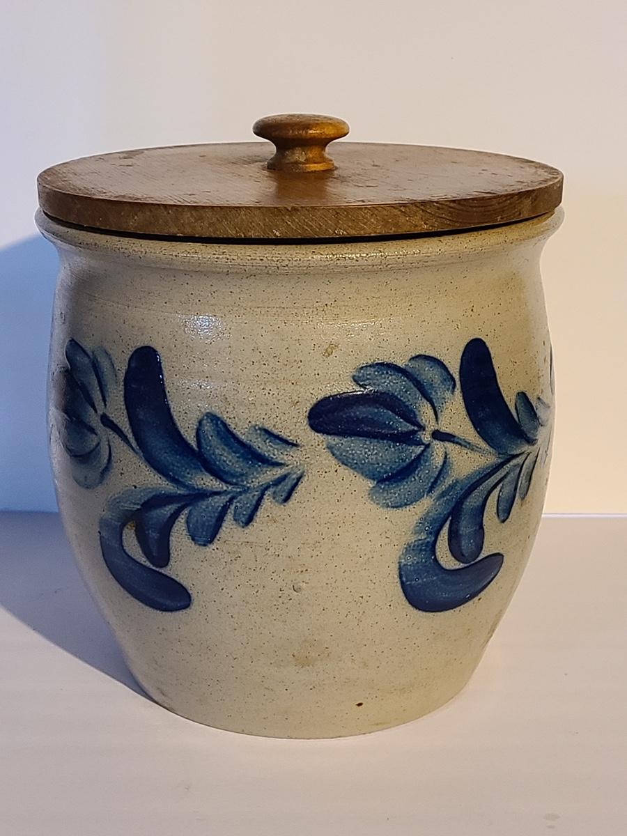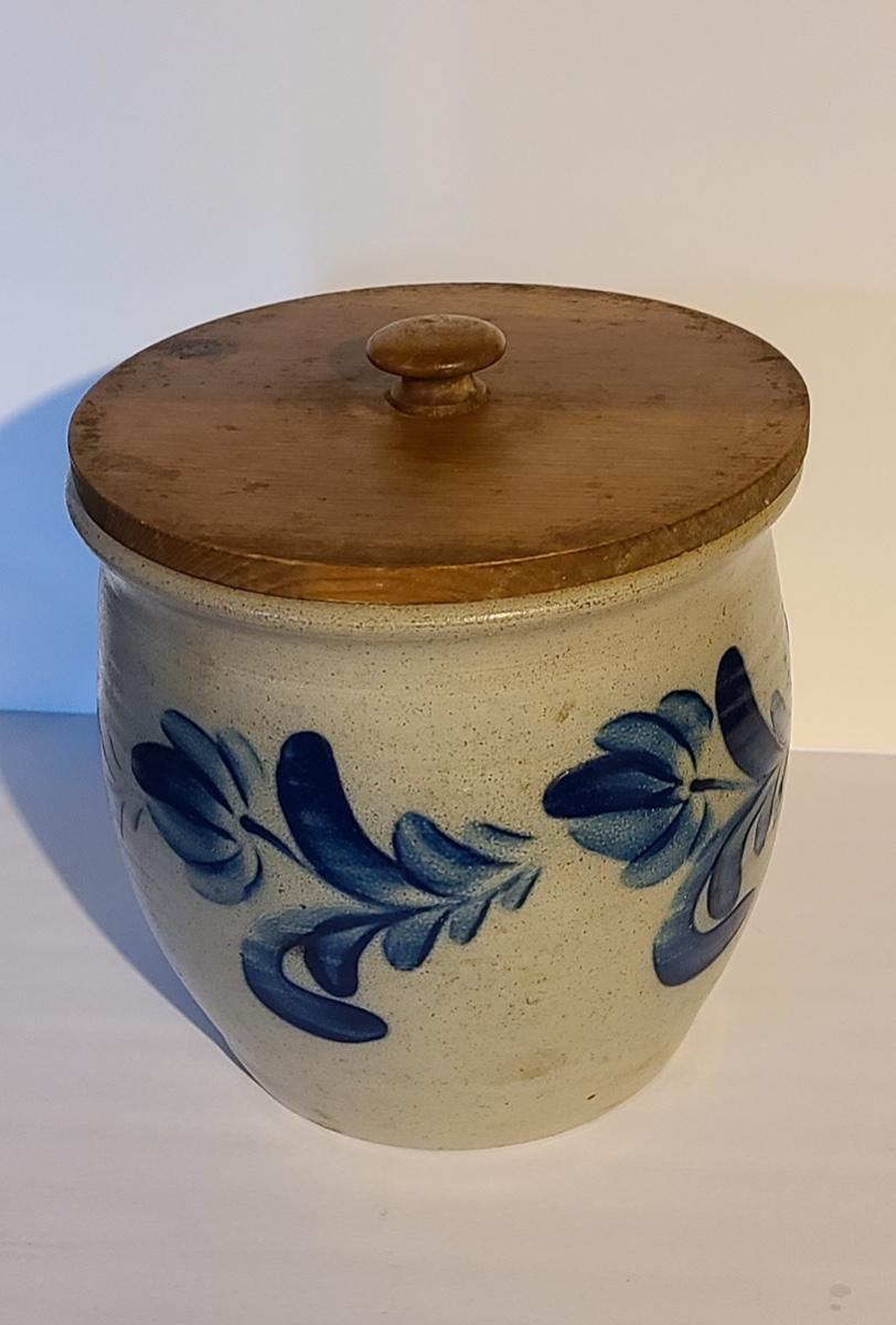Lot 383: Salt Glaze Cobalt Blue Embellished Eldreth Pottery Crock with Wood Lid