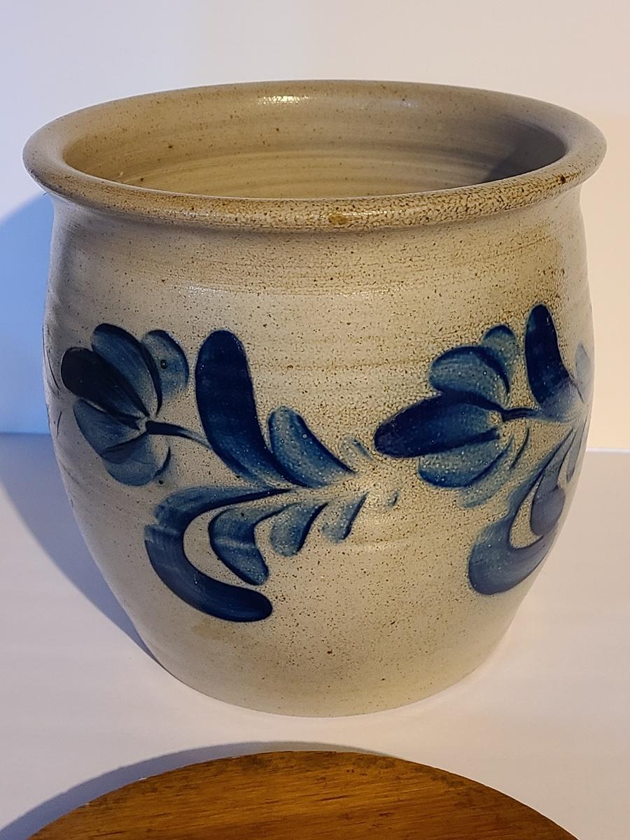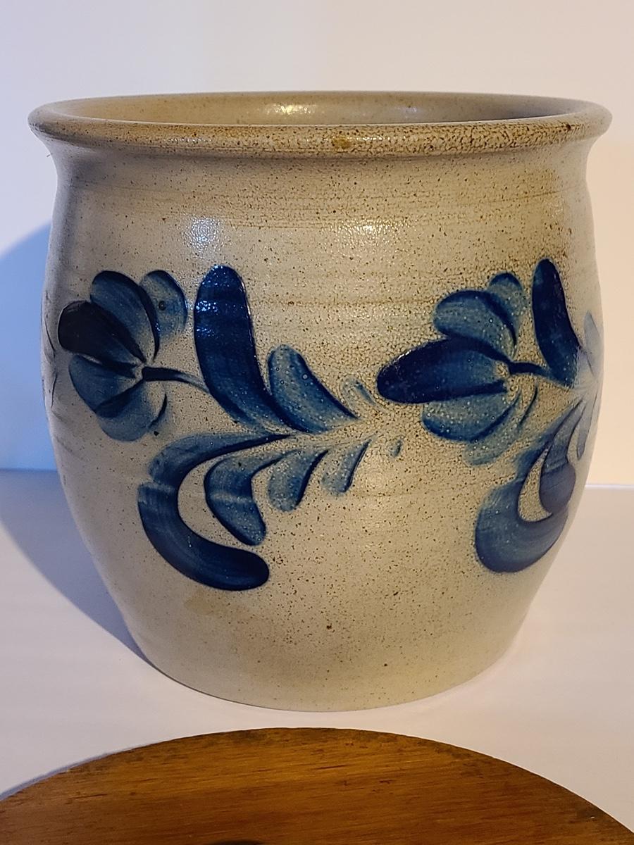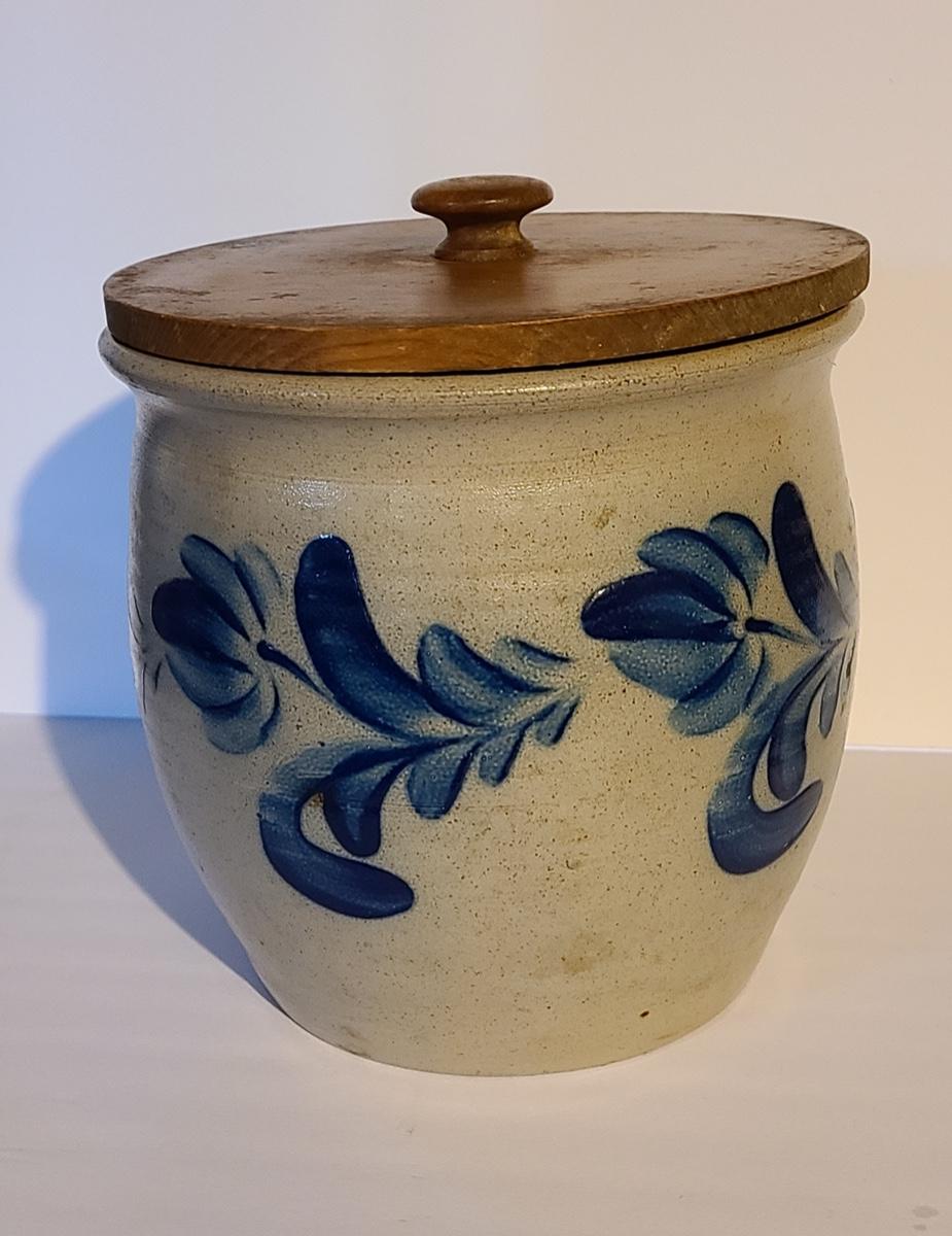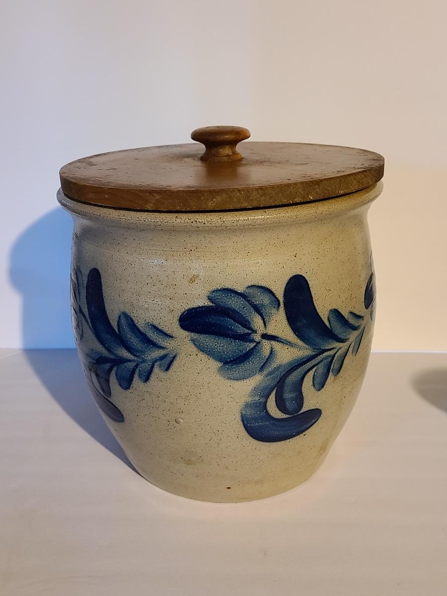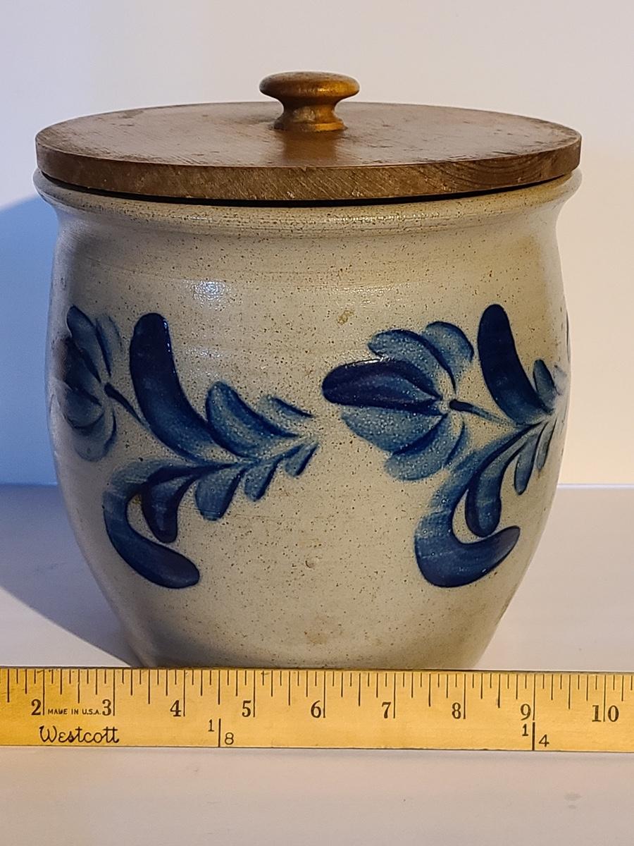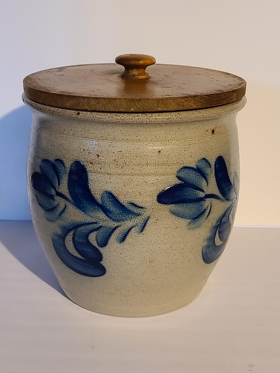 Lot 383: Salt Glaze Cobalt Blue Embellished Eldreth Pottery Crock with Wood Lid