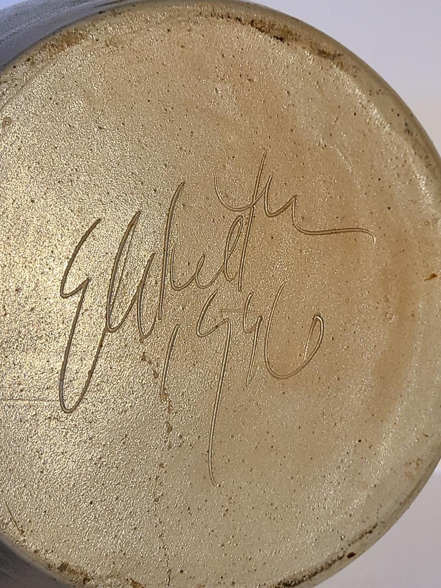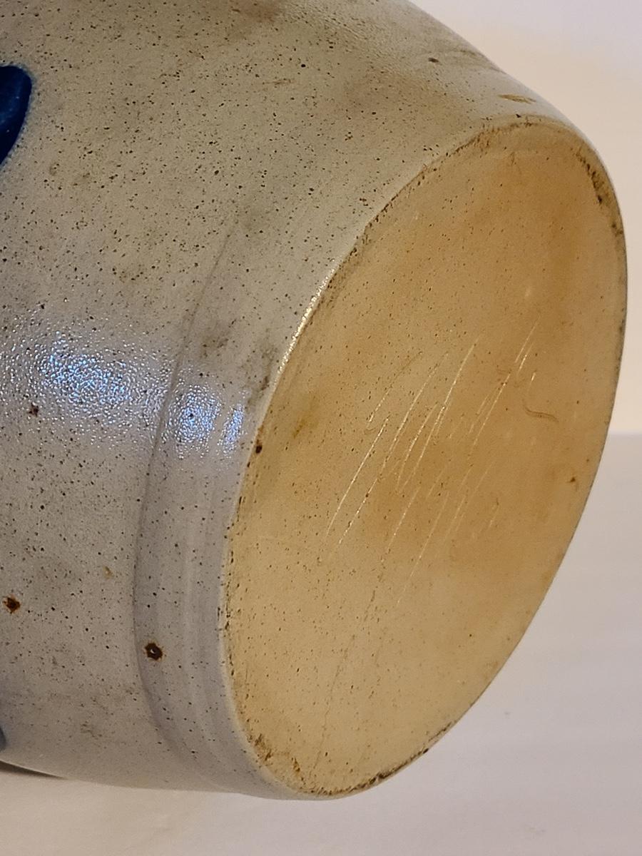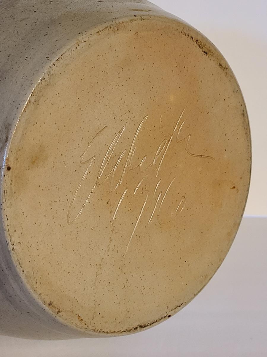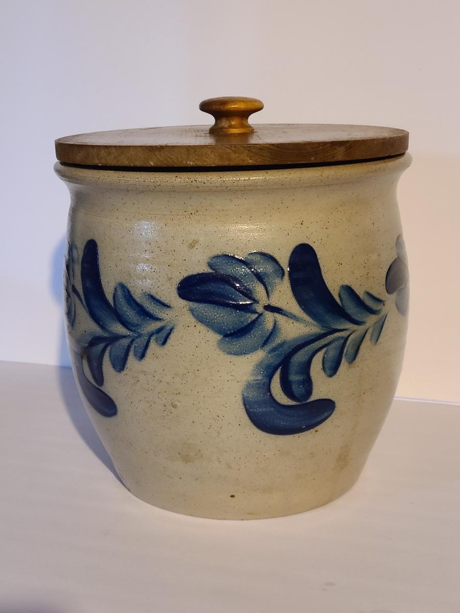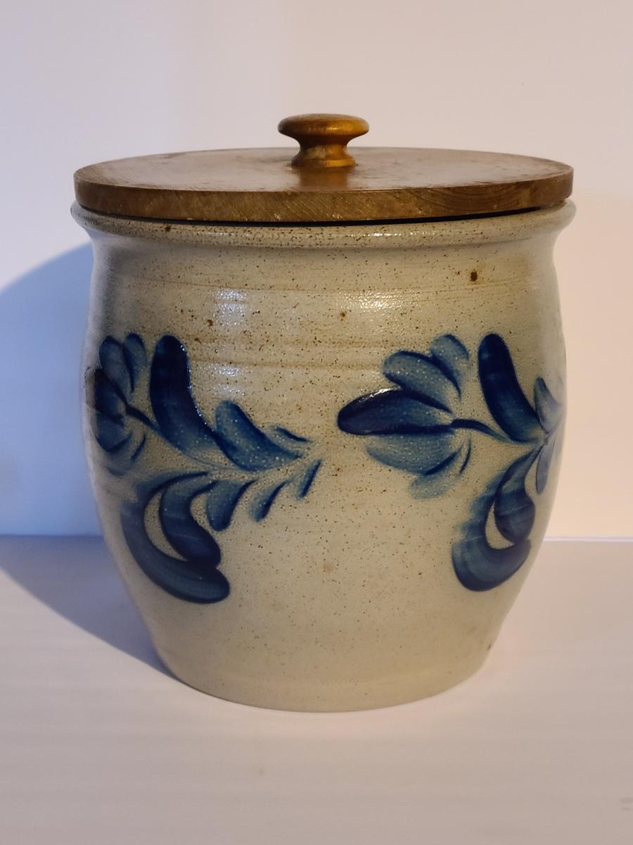 Lot 383: Salt Glaze Cobalt Blue Embellished Eldreth Pottery Crock with Wood Lid