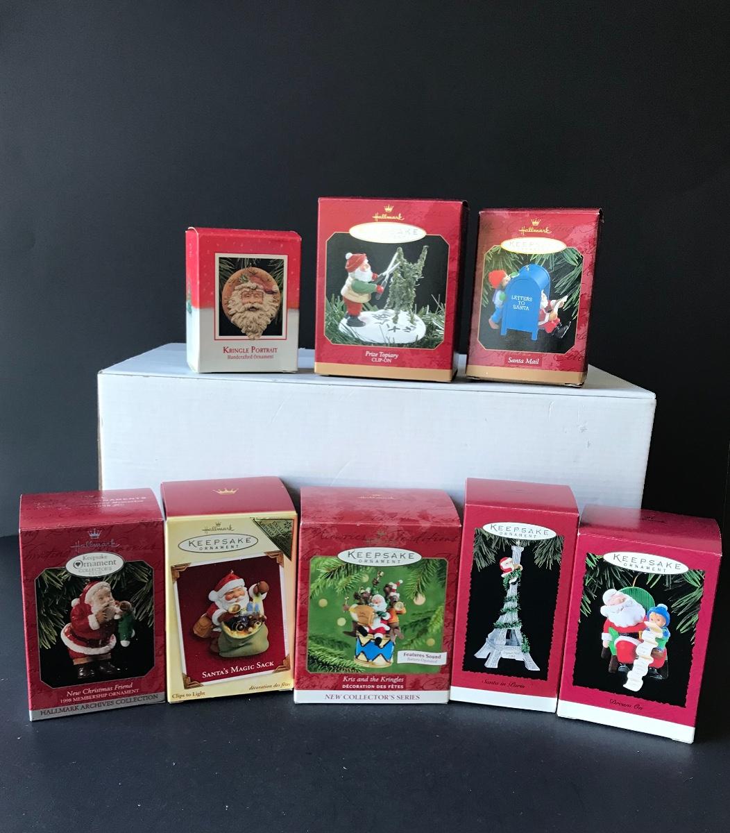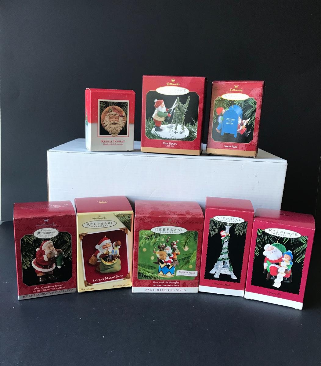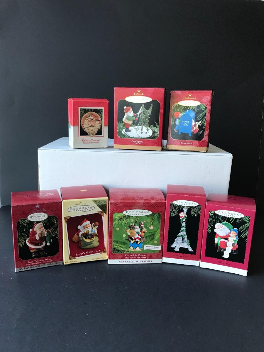 Santa Claus Christmas Ornaments -Hallmark Keepsake. All Holiday items in this auction are as-seen. The client collected a lot of holiday pieces and some are new in box, some were displayed once and come with original box, and some have been displayed and come with no box. They are all pre-owned in some fashion and have been stored in an attic or on shelf in library. Please see all pictures. The pictures show condition, measurements if taken, and what is included in the lot. Due to the large amount that we photograph and the time frame, we are not always able to take measurements. All items unless noted, are pre-owned and have been used. Thank you