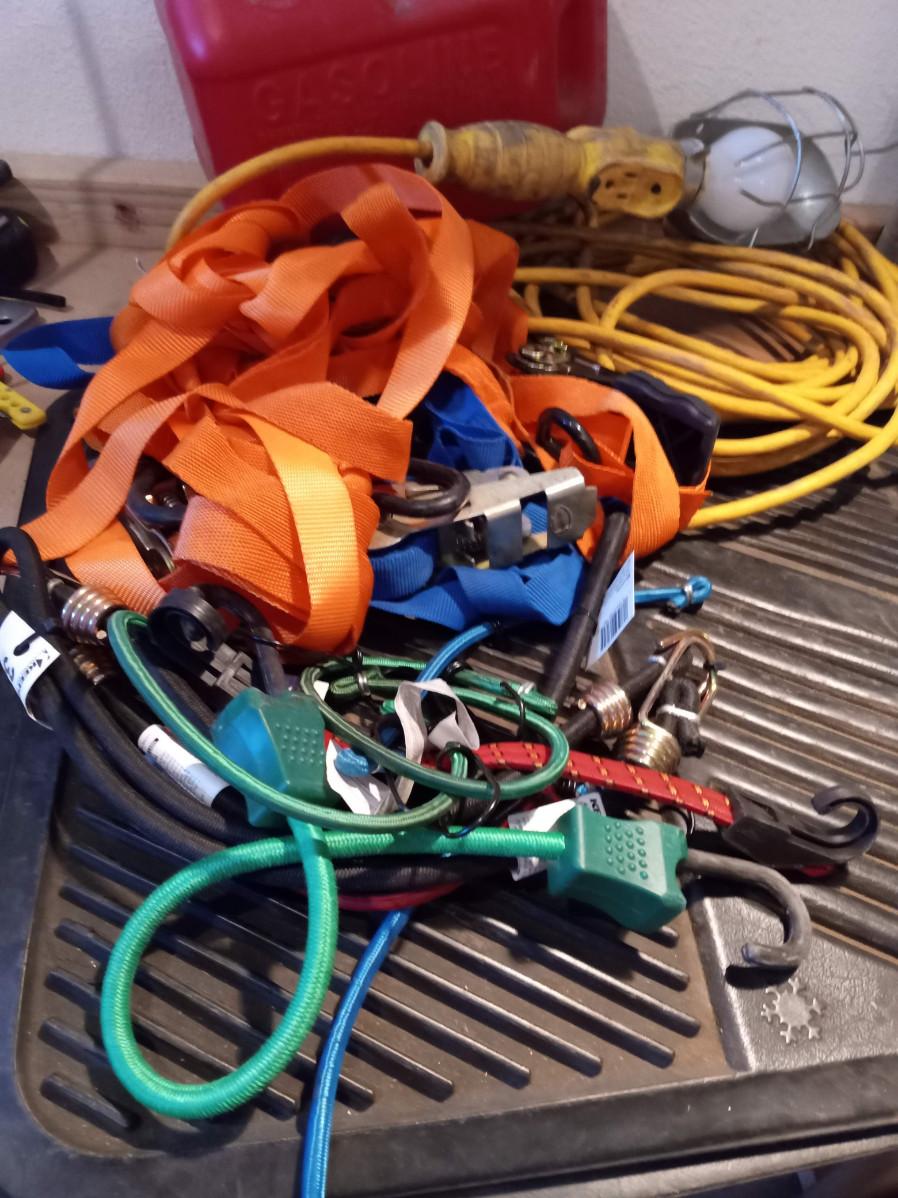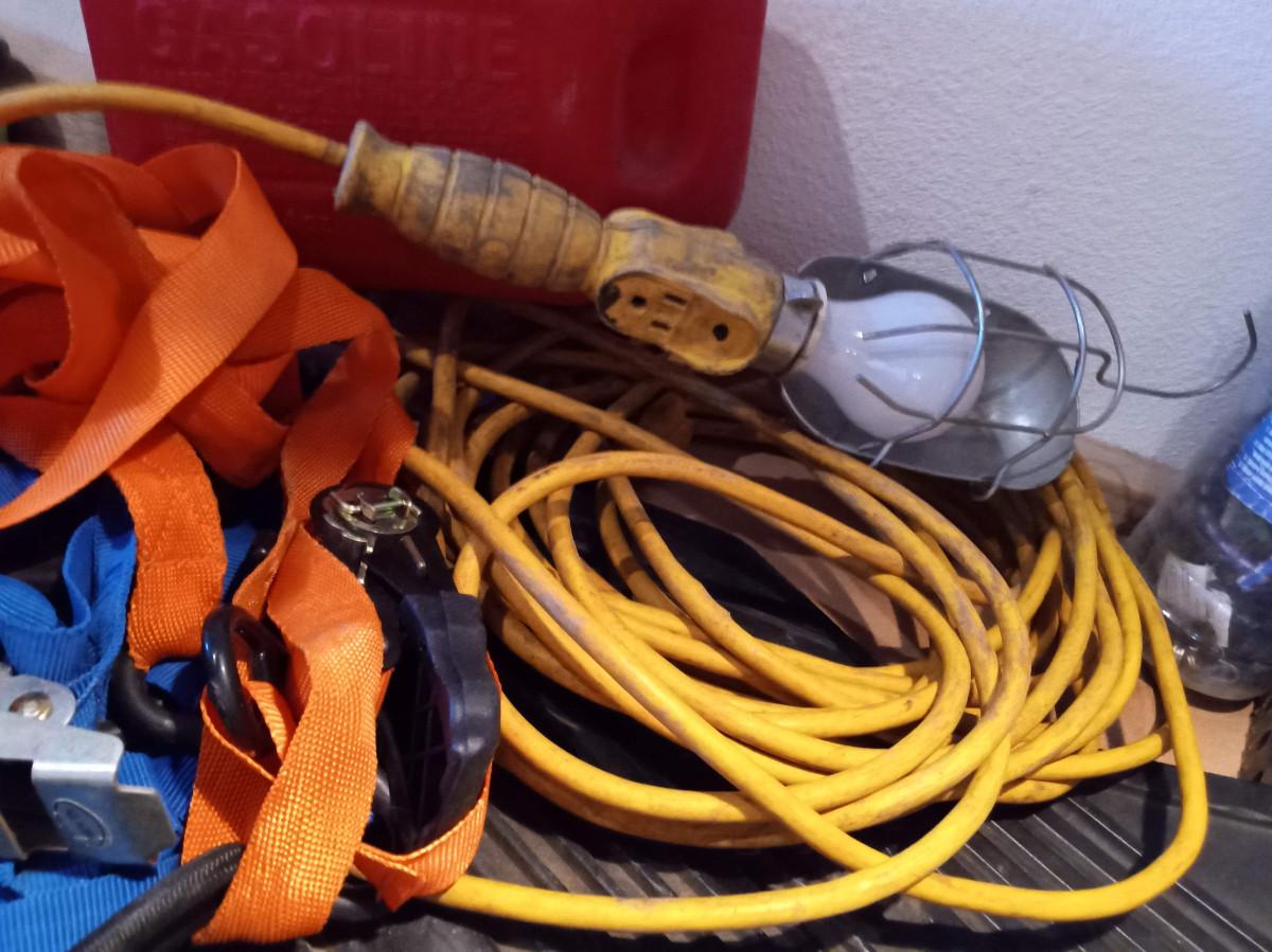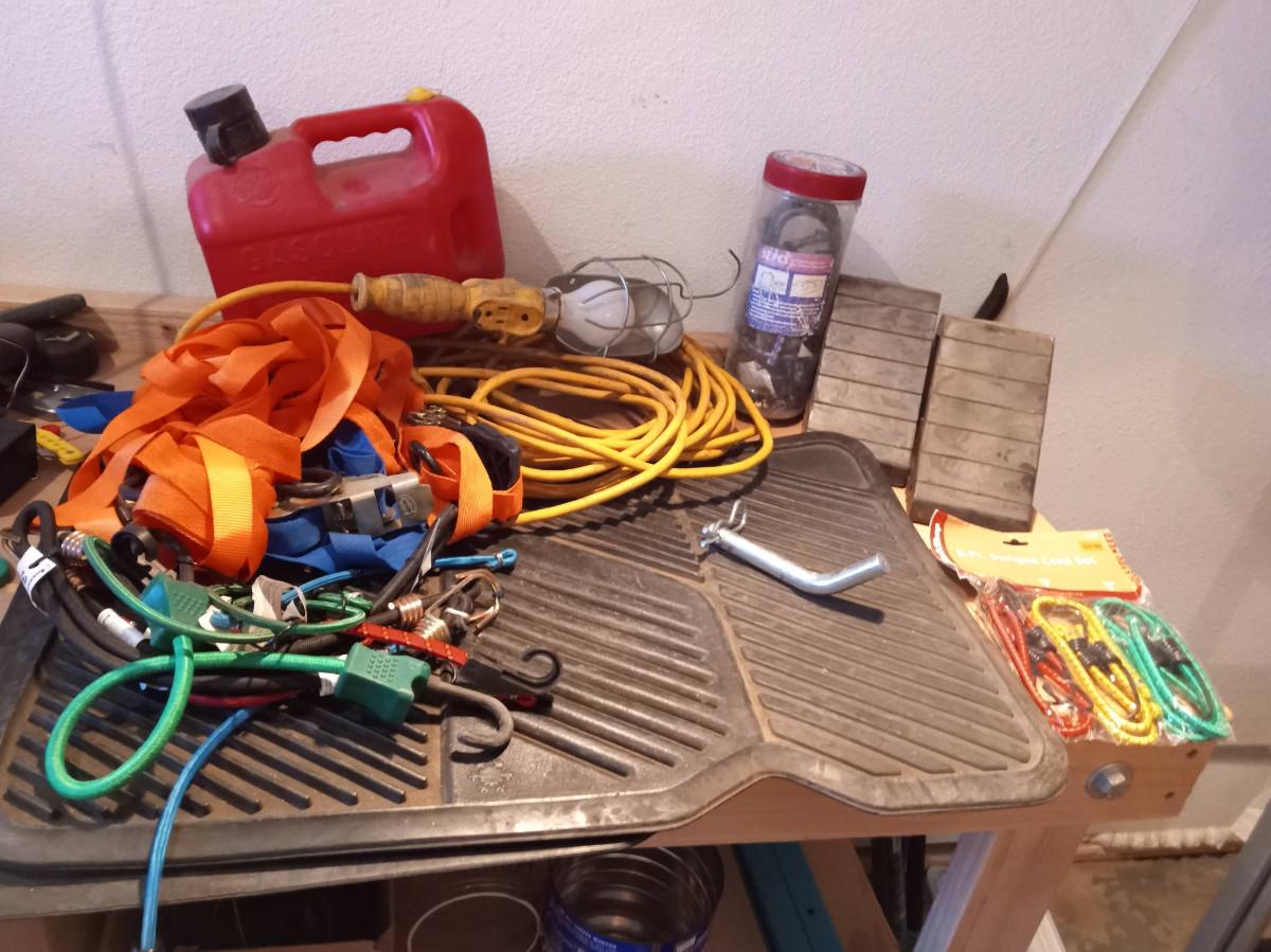 2 TIRE BLOCKS, 2 THICK RUBBER FLOOR MATS, RATCHET STRAPS, BUNGEE CORDS, GAS CAN AND A TROUBLE LIGHT