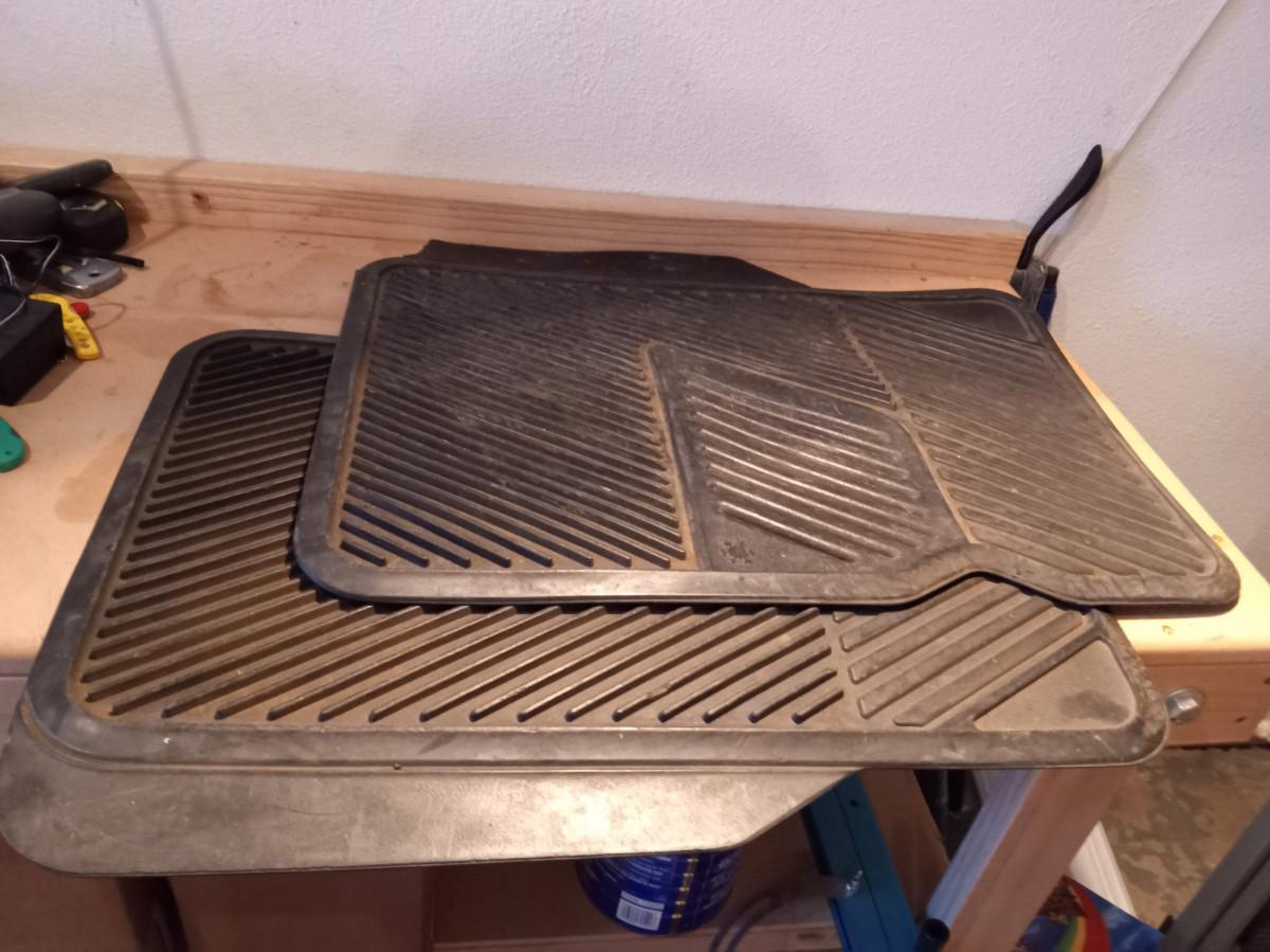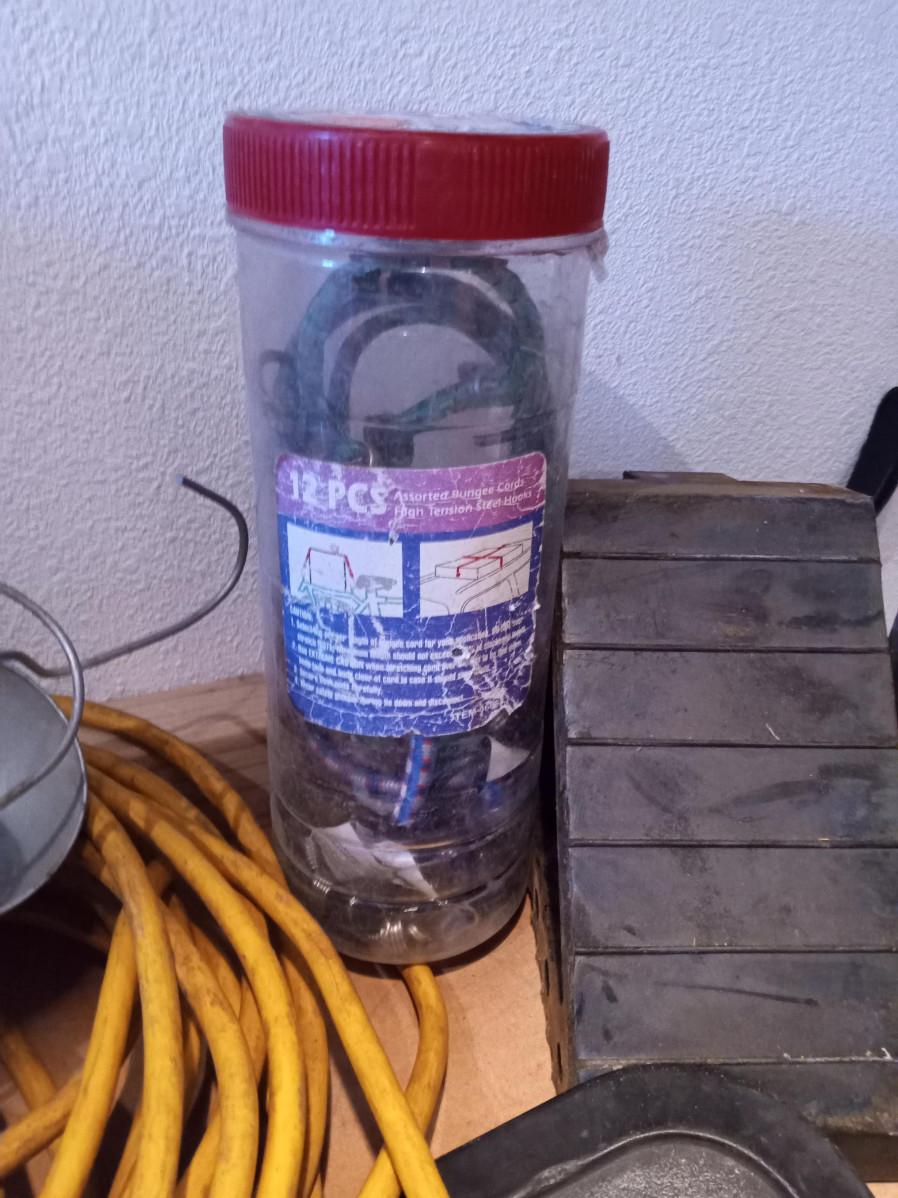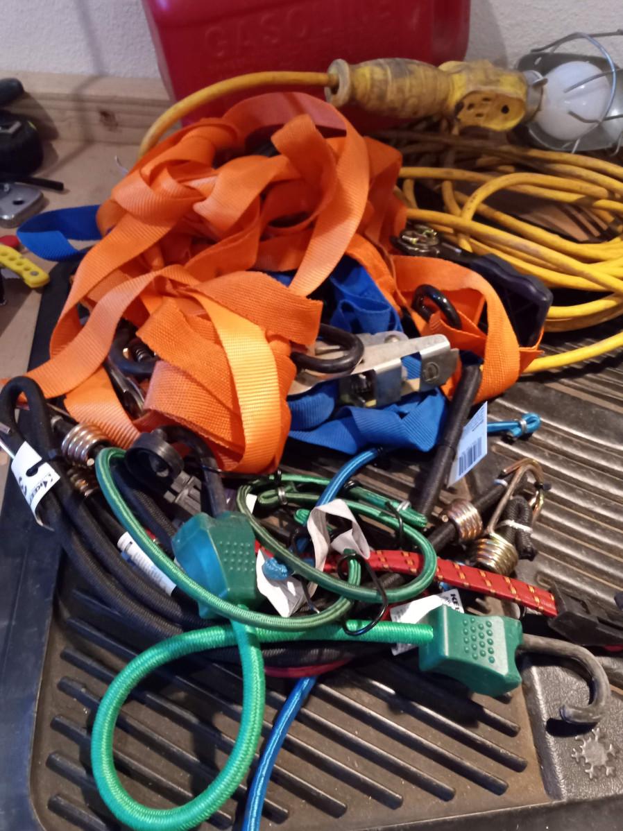 2 TIRE BLOCKS, 2 THICK RUBBER FLOOR MATS, RATCHET STRAPS, BUNGEE CORDS, GAS CAN AND A TROUBLE LIGHT