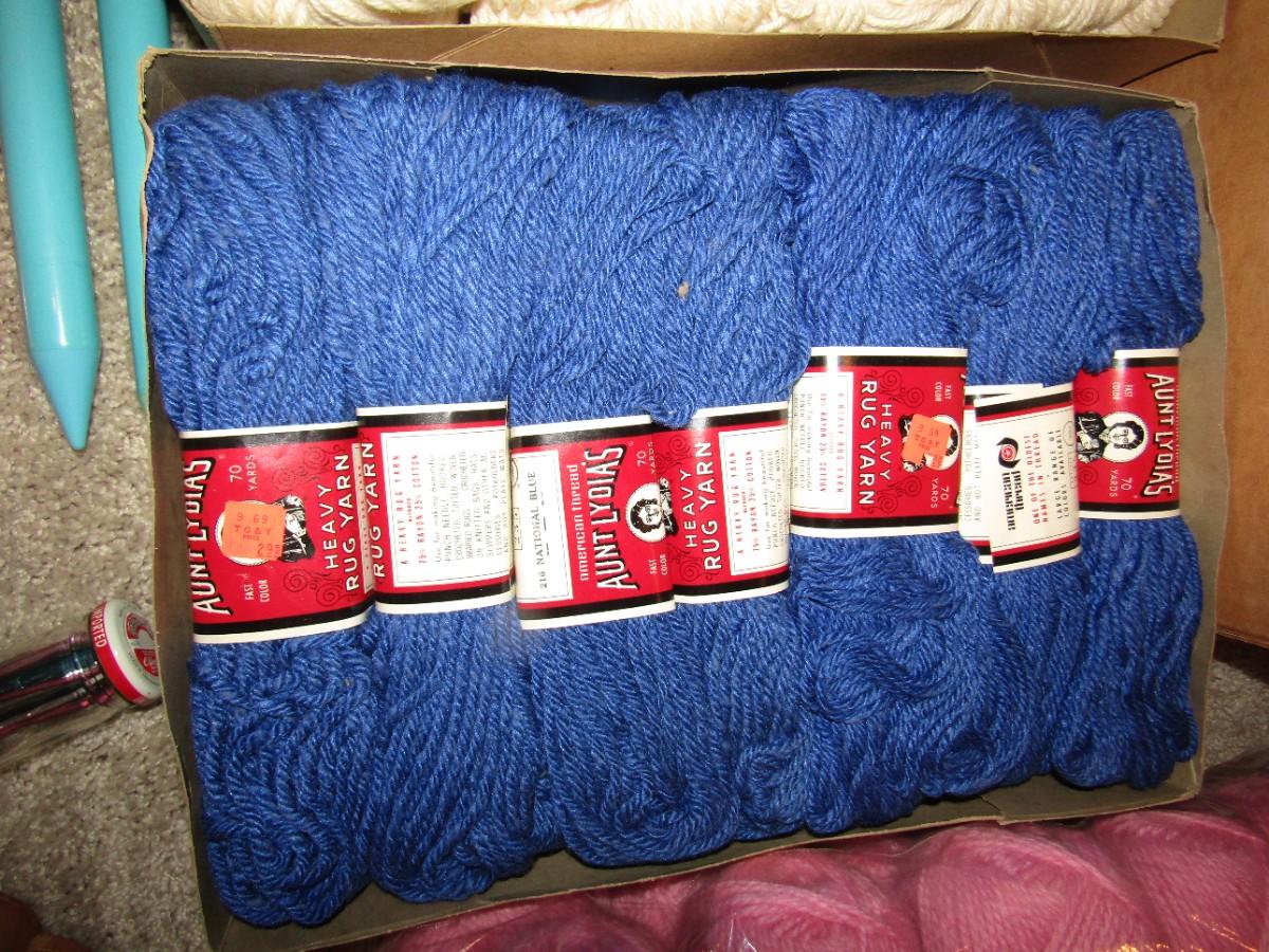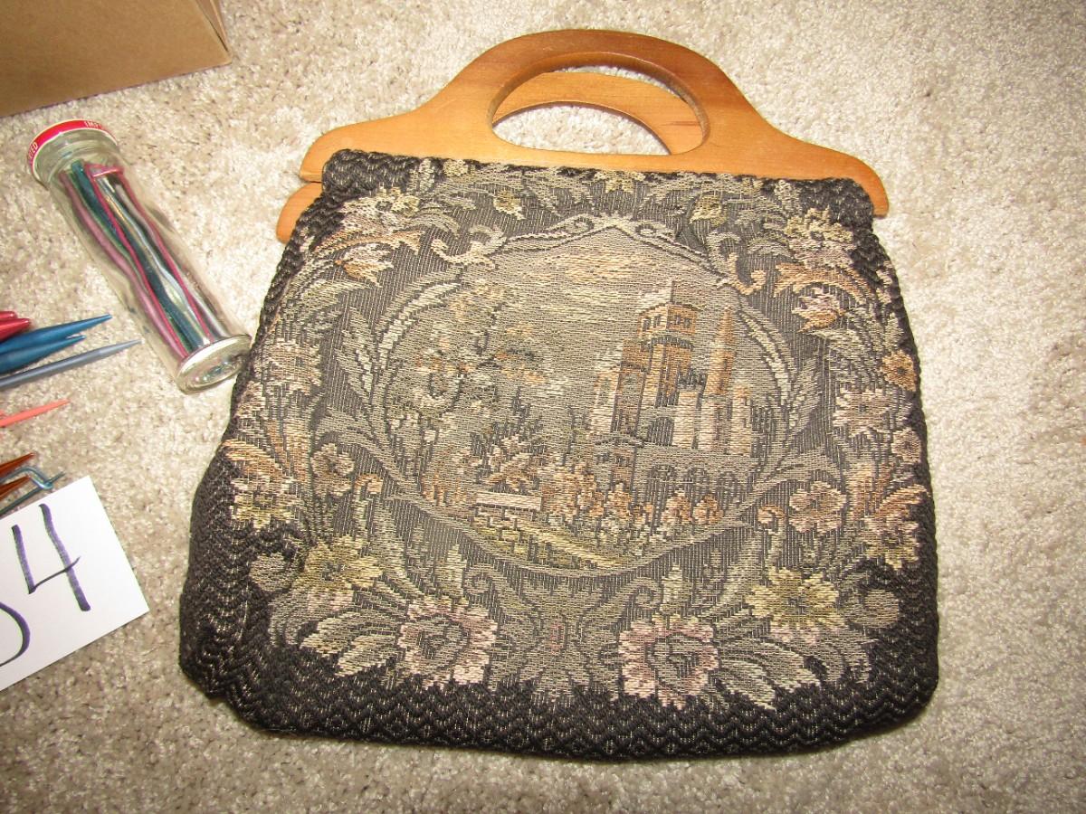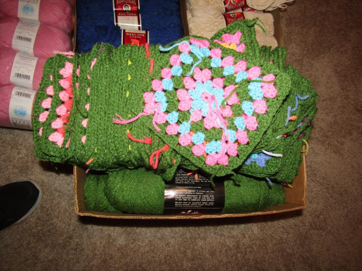 NEW YARN, KNITTING NEEDLES, TAPESTRY BAG, MANY CROCHETED SQUARES JUST WAITING TO BE MADE INTO A BLANKET