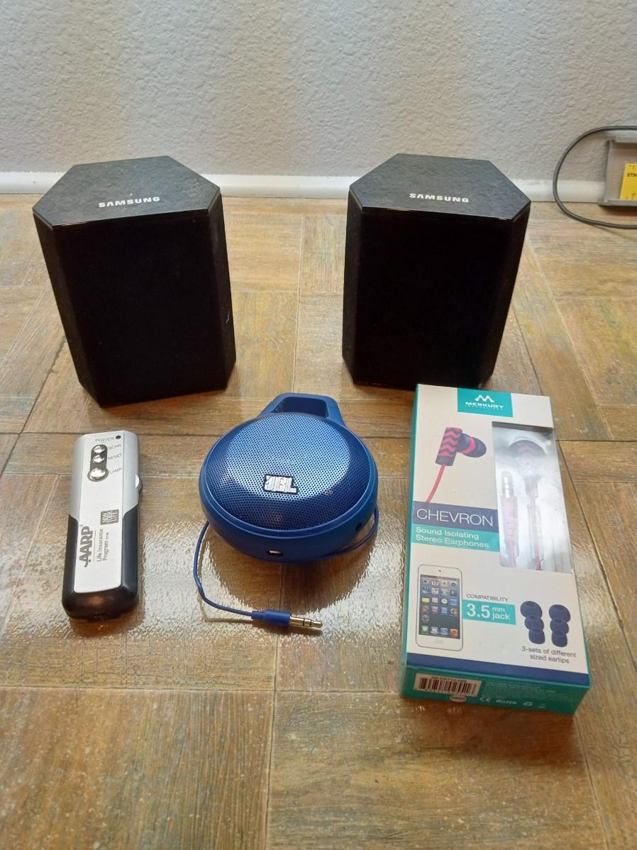2 SAMSUNG SPEAKERS, NEW EAR BUDS, JBL PORTABLE CELL PHONE SPEAKER